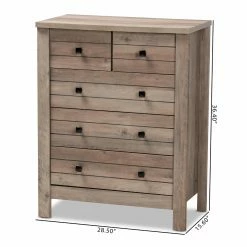 Add valuable storage to any space with the convenient Derek chest. The Derek is constructed from sturdy wood showcasing a natural oak finish that easily coordinates with a large variety of existing color palettes. Three large drawers and two medium sized drawers provide ample storage for clothes, linens, and other various items. Requiring assembly, the Derek is ornamented with black finished square metal drawer handles that stand out brilliantly against the natural wood finish. Organize any bedroom in style with the Derek chest.