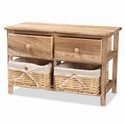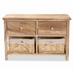 Add a touch of warmth to your interior with the natural wood tones of the Kenwood storage unit.This unit is comprised of a lightweight wood frame fitted with woven baskets. Two drawers provide secure on-hand storage while two baskets create a convenient display for larger items. Comes fully assembled, the Kenwood utilizes fabric liners in its baskets for a charming, contemporary touch. Rounded drawer knobs complete the look, making the Kenwood storage unit a lovely addition to any space.