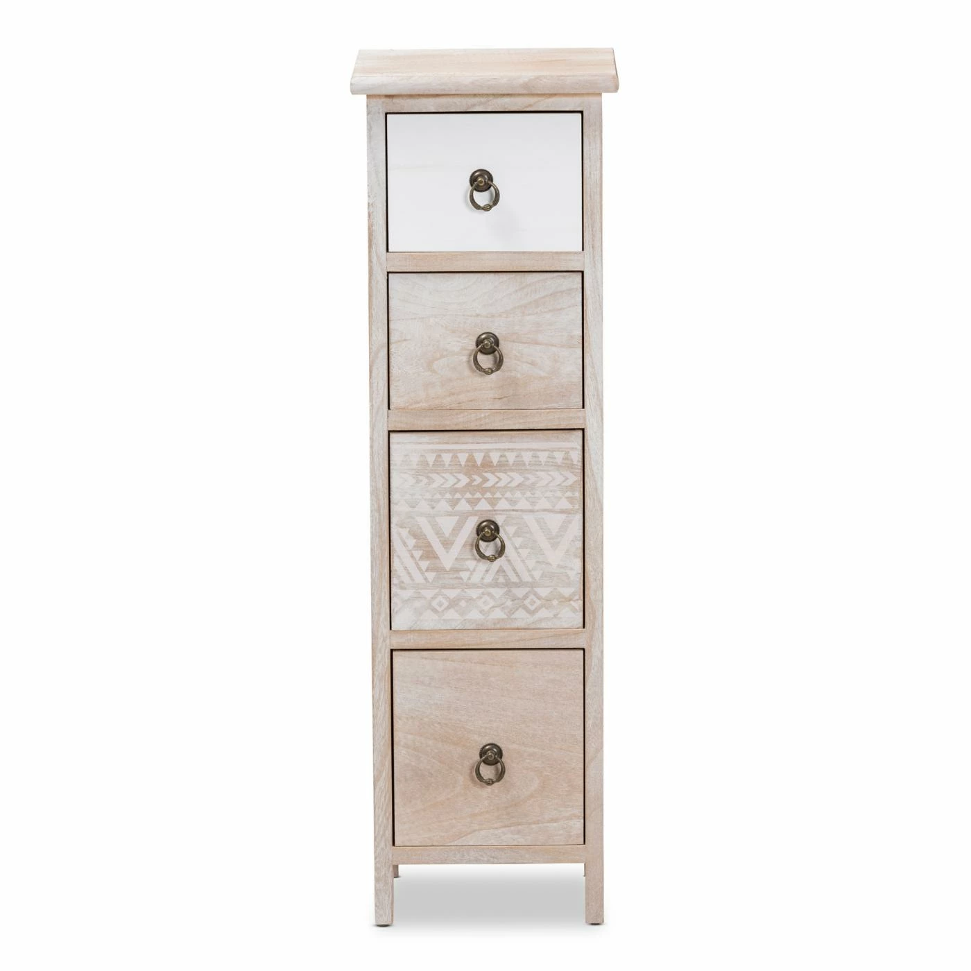 The remarkable Seanna storage unit radiates tranquil vibes in your space with its stunning, dynamic design. This handy piece is crafted from sturdy wood and adorned with intricately molded metal ring-pulls. Four multi-sized drawers accommodate your storage needs by organizing your household essentials both large and small. The Seanna will arrive fully assembly and features a striking combination of natural wood grain and geometric shading for an eye-catching accent piece. With a slim frame, the Seanna storage unit is a perfect solution to enhance vacant areas of any interior.