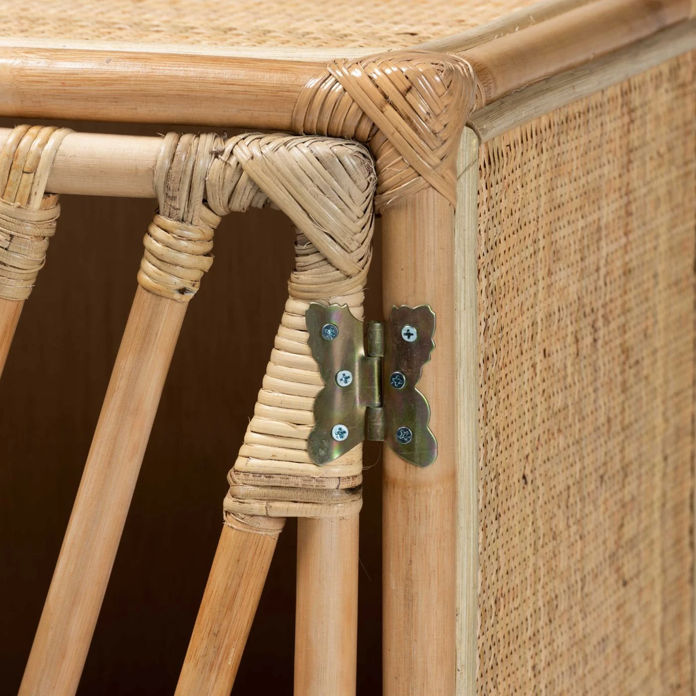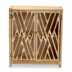 Accommodate your needs while expressing a carefree, tropical mood in your space with the Shena storage cabinet. This handy piece is comprised of a remarkable blend of wood and natural rattan. Two woven rattan shelves behind the doors offer space to organize and arrange your belongings in style. The Shena will arrive fully assembled and features geometric doors that convey an open feel while accentuating the exotic craftsmanship of the piece. Offering essential storage space in stunning design, the Shena storage cabinet is sure to transform the feel of any interior layout. Due to the nature of the natural materials used in this product, it may have variations in areas such as, but not limited to, color, pattern, grain and texture. The hair-like strands of rattan/rattan-fiber are common due to nature of the material.