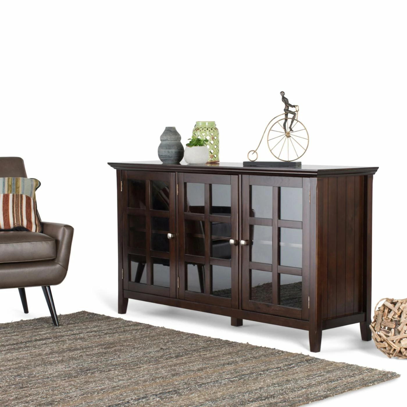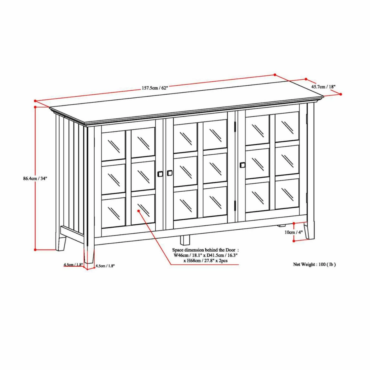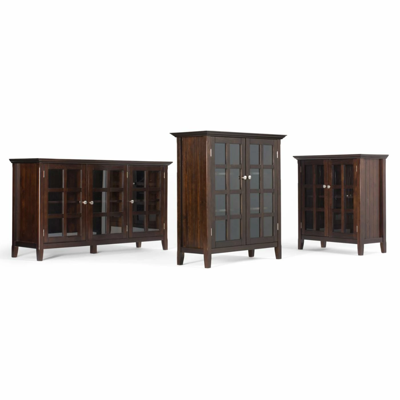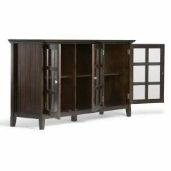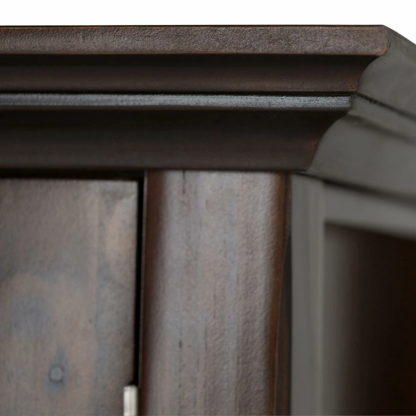 Your accomplice in elegant entertaining, the Brooklyn + Max Brunswick Pine Wood 3 Door Storage Cabinet stands at the ready in your dining room, eat-in kitchen, or even home office, providing extra space for display and storage. Three cabinet doors feature tempered glass panes; each cabinet area is divided by an adjustable shelf you can configure as you wish. With satin nickel hardware and beadboard panels, this solid wood cabinet is dressed in its Sunday best – a dark tobacco stain with a protective coat of lacquer. Dedicated display space pulls any room together, and glass doors protect delicate items and servingware against dust.