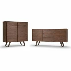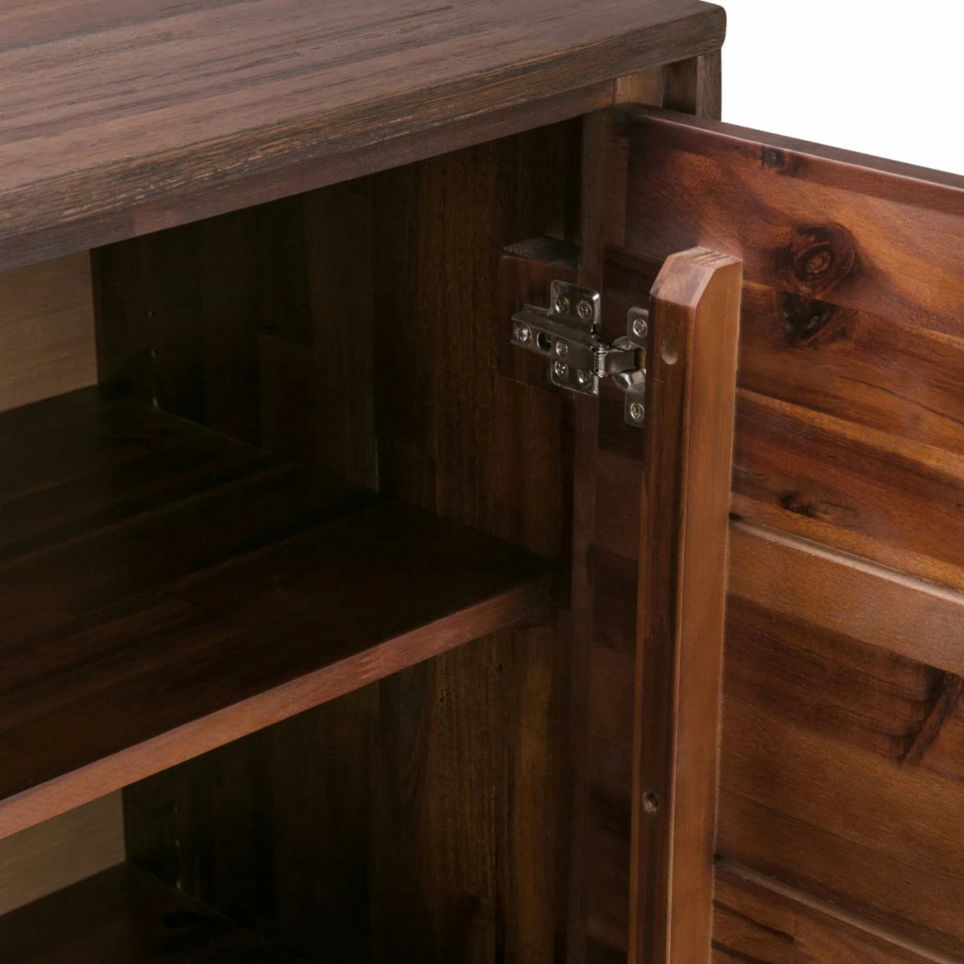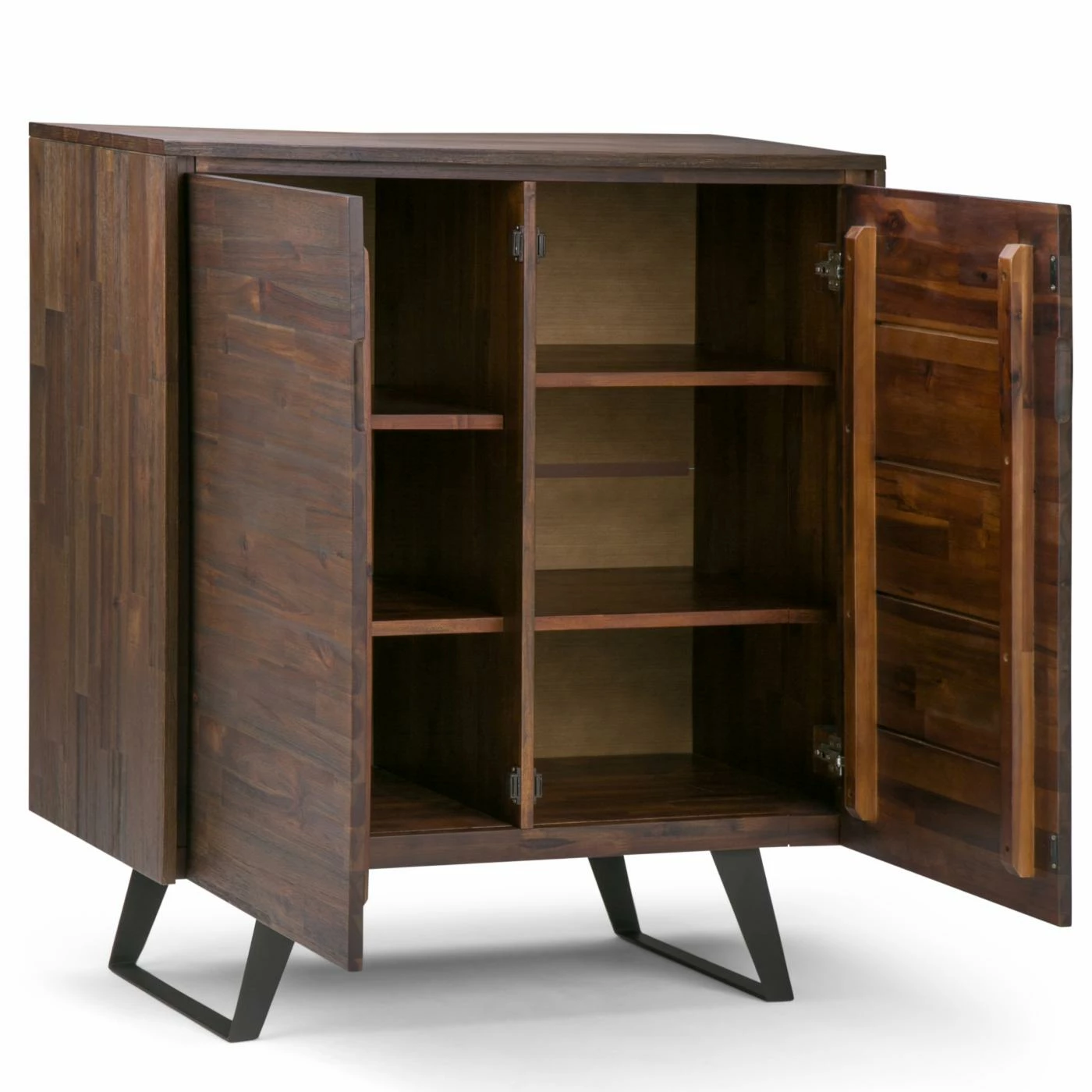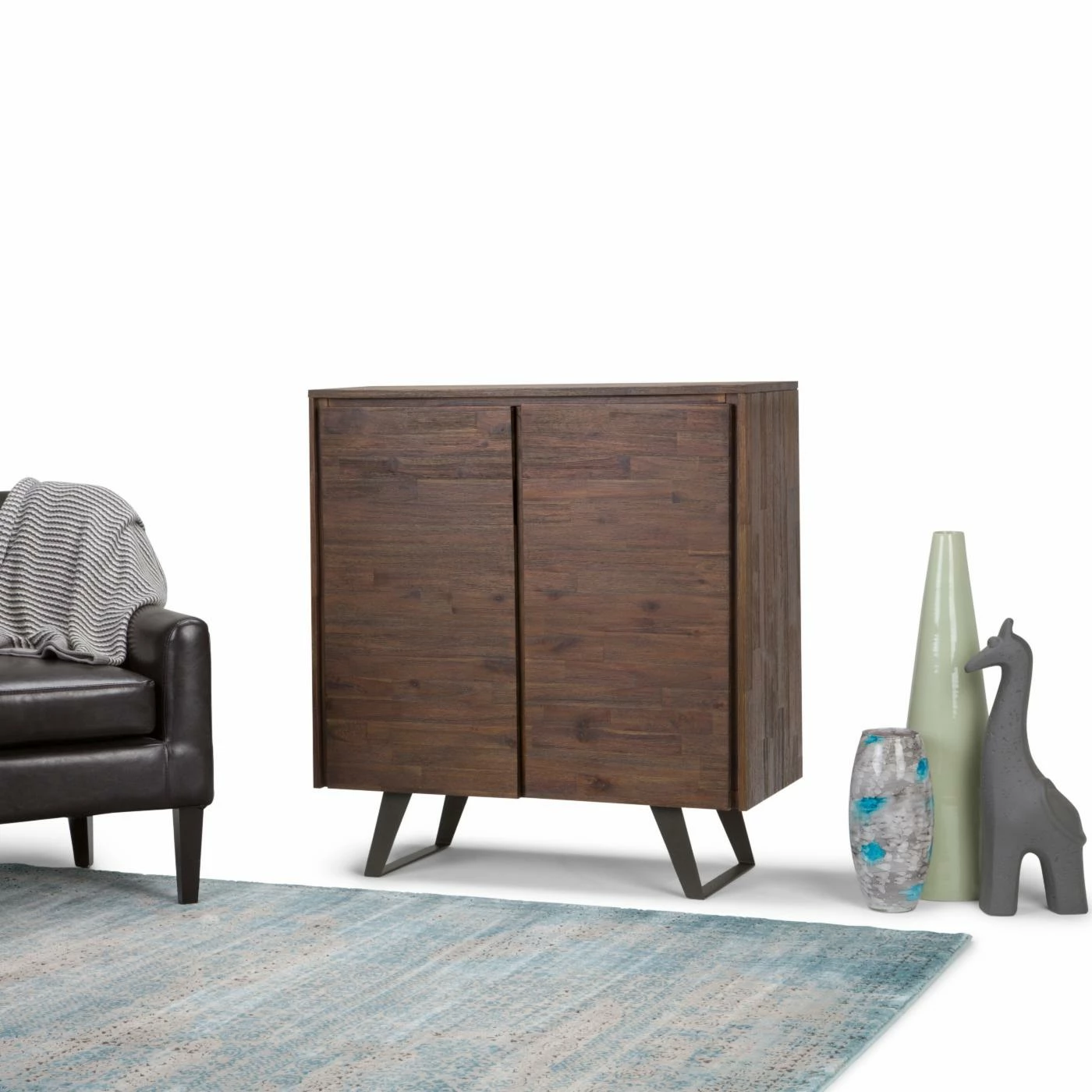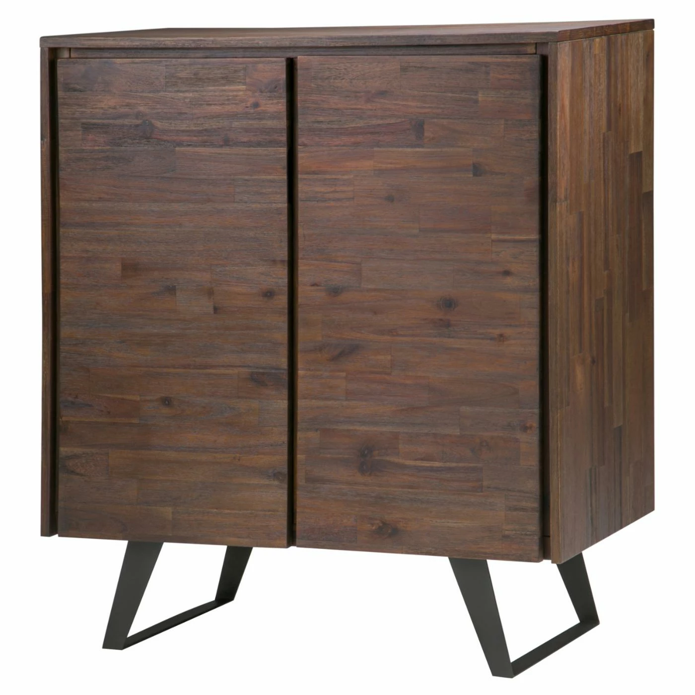Store anything you wish in modern style with the Brooklyn + Max Fulton Acacia Wood Storage Cabinet, crafted of acacia wood in a rich distressed charcoal brown finish. This handsome chest boasts a mid-century modern-inspired design with angled, metal legs. Two cabinet doors open to reveal plenty of shelving for books, dishes, or any essentials you can dream up.