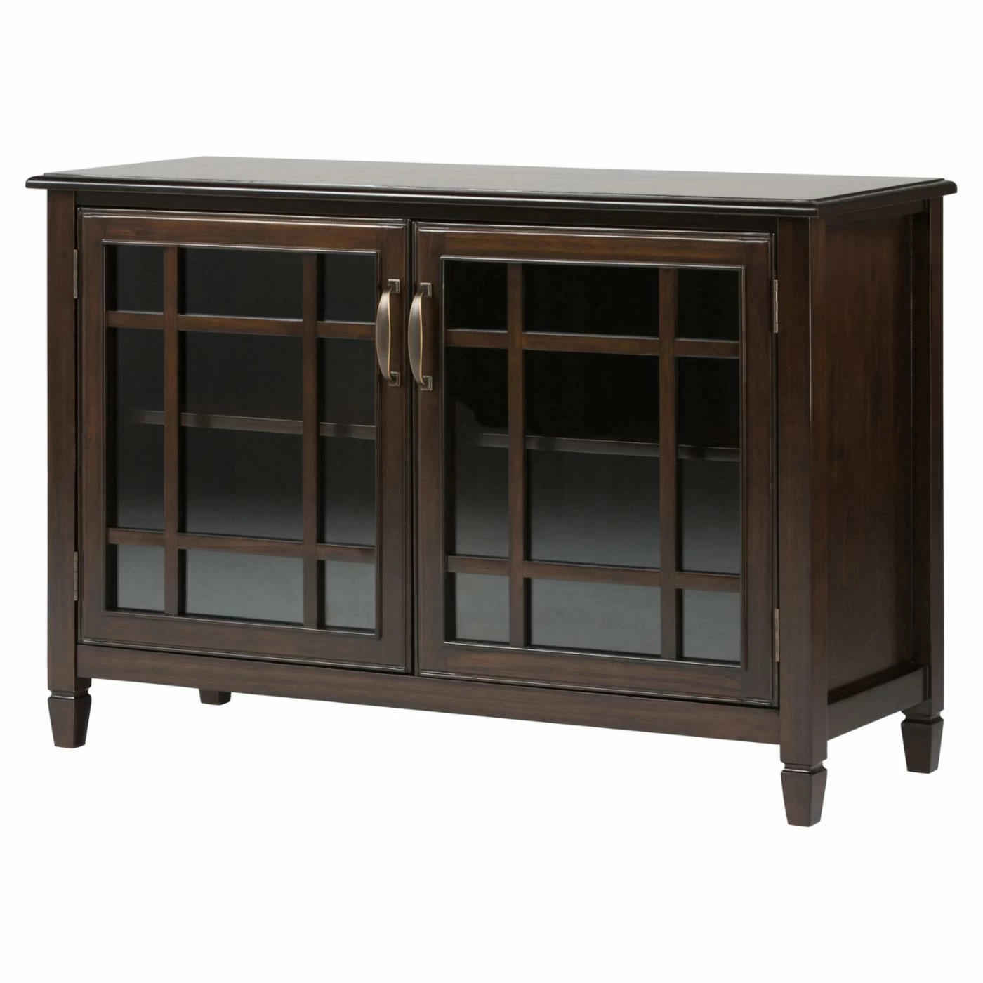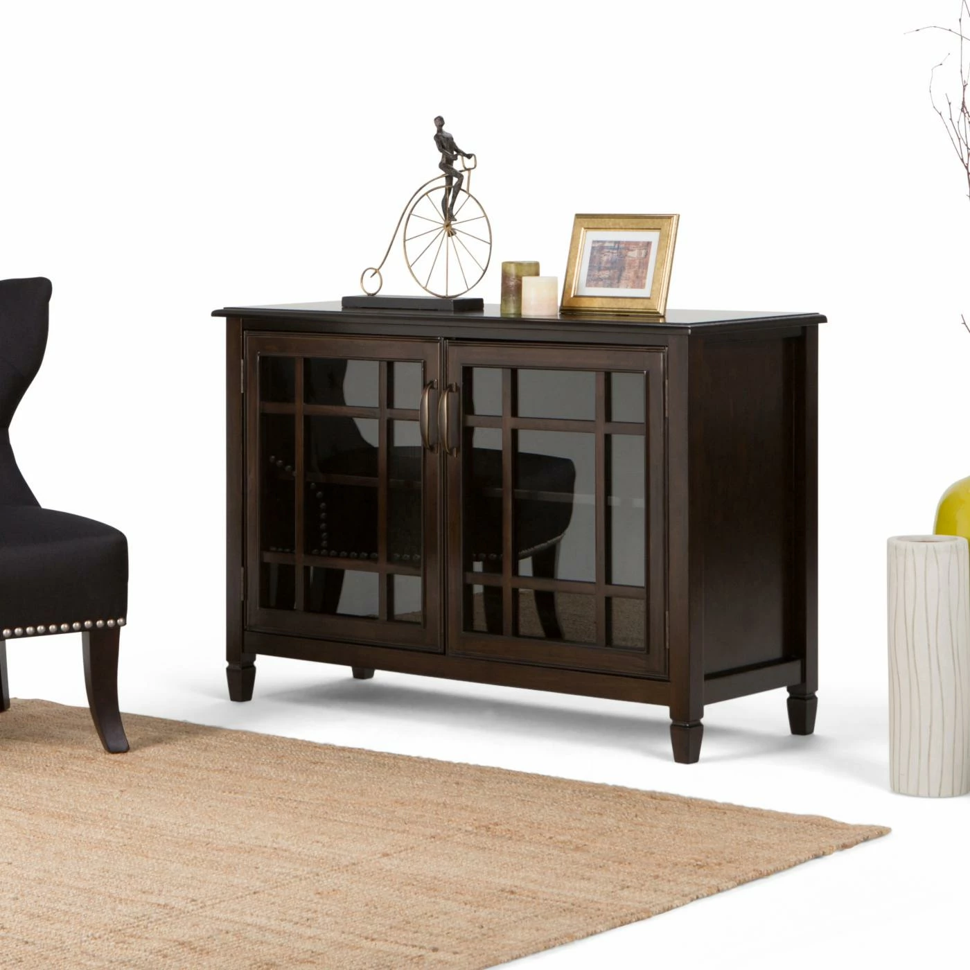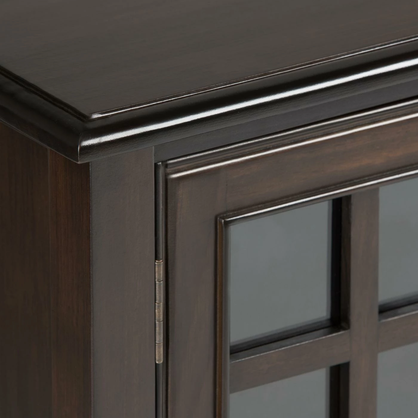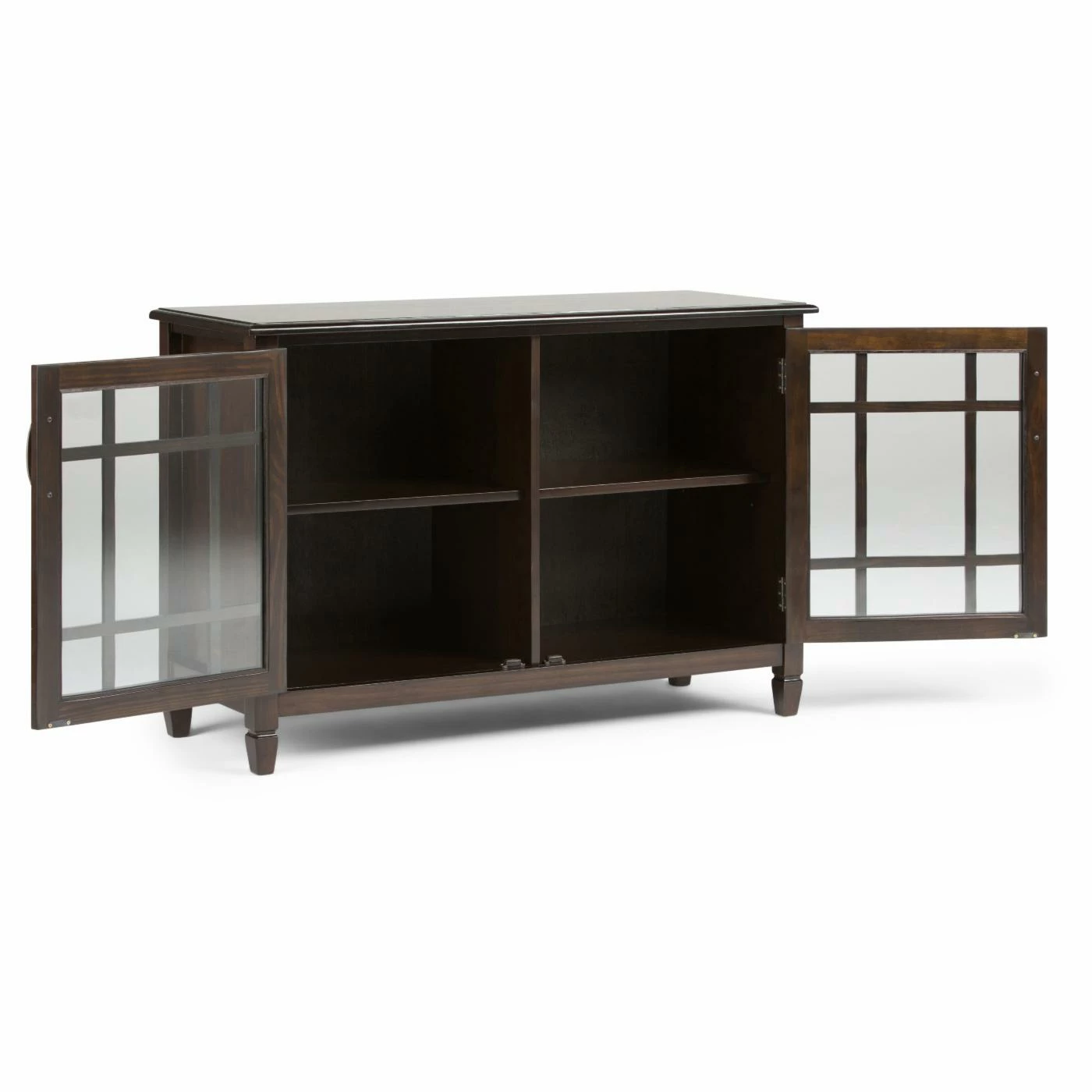 The Brooklyn + Max Somerset Pine Wood Glass Door Storage Cabinet makes storing and displaying personal belongings a stylish affair. The storage cabinet is handcrafted of solid pine wood in a dark chestnut brown glaze stain with protective lacquer. Two adjustable shelves and a large cabinet space are tucked behind twin glass doors. The top of this cabinet is perfect for display your photos, collectibles, and floral arrangements.