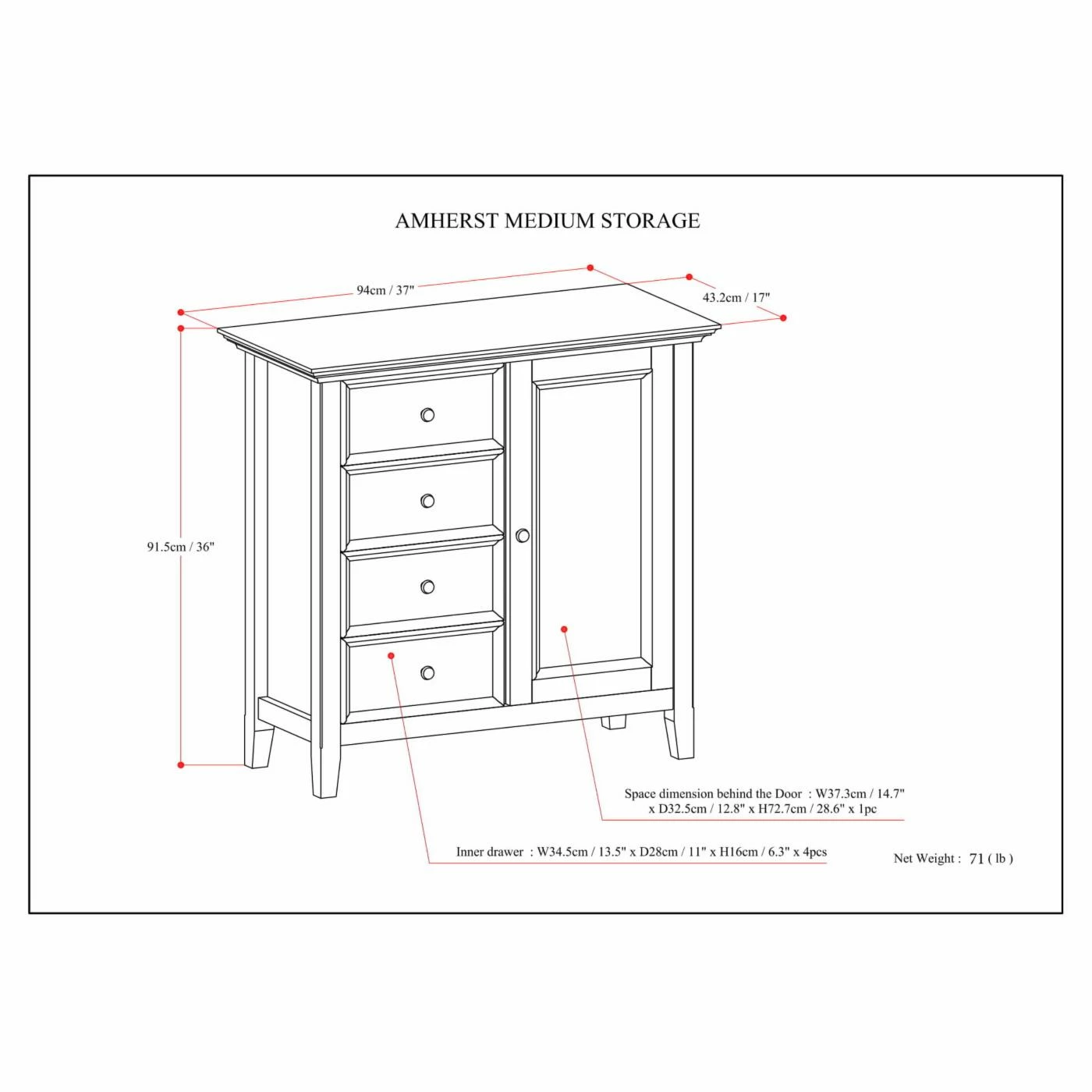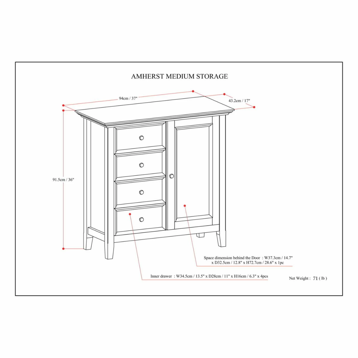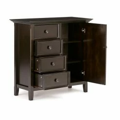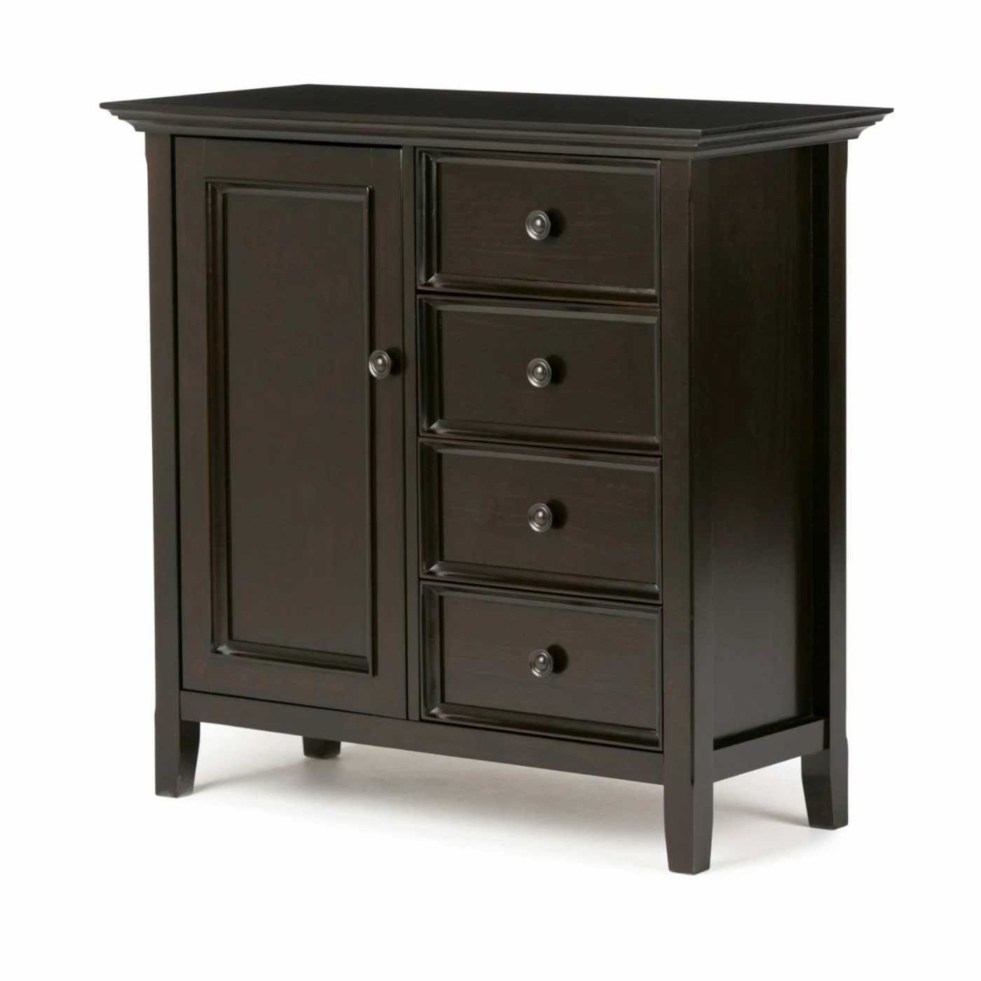 Handsome concealed storage is just a click away! The Brooklyn + Max Washington Pine Wood Storage Cabinet with Drawers features decorative antiqued pewter hardware and your choice of available stain that carries a feeling of heritage and gravity. Two adjustable shelves behind the cabinet door allow you to customize the storage space to your needs. Metal drawer glides offer smooth operation, and you’ll love the design touches such as panel-framed drawer fronts, tapered legs, and crown molding.