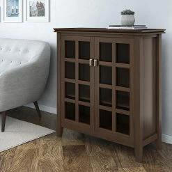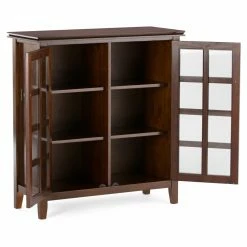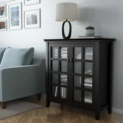 Keep the clutter to a minimum when you have the Brooklyn & Max Holden Wood 38 in. Wide Contemporary Medium Storage Cabinet. This cabinet features a choice of handsome finish with a protective lacquer. It offers two tempered glass doors with four adjustable shelves for custom storage options.