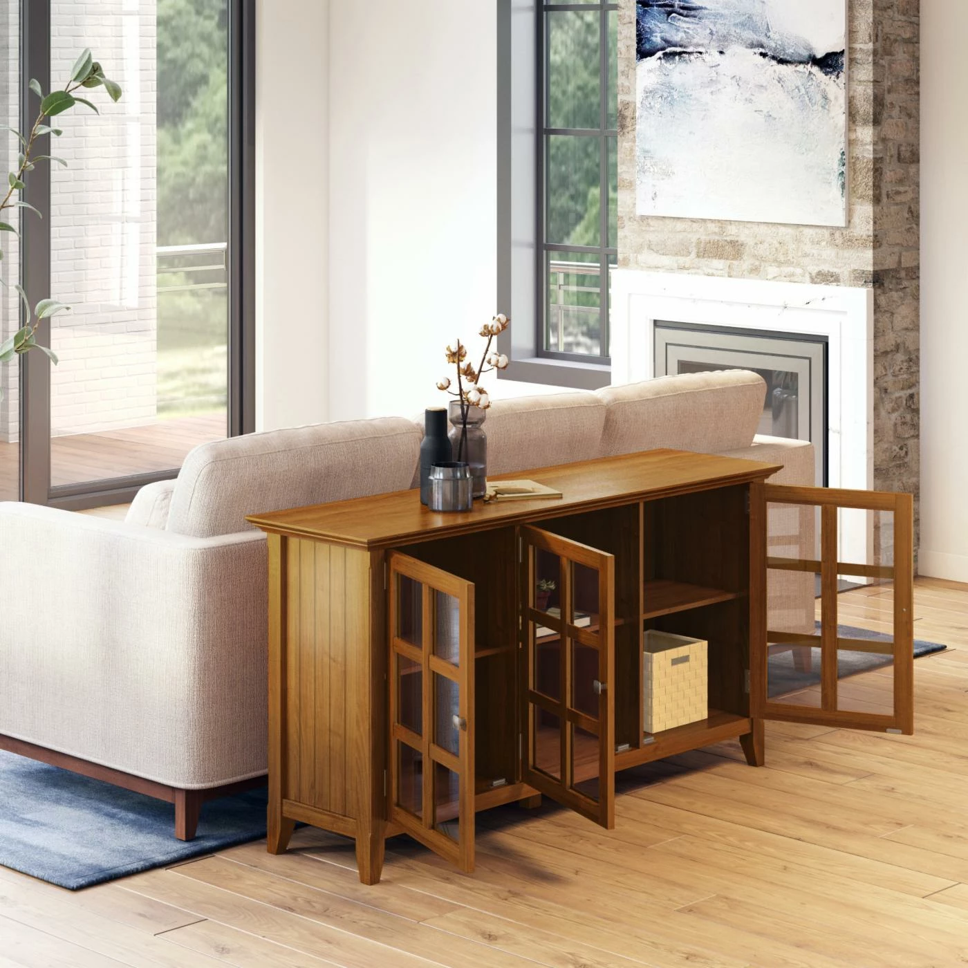 You want to make a grand statement and the Brooklyn & Max Brunswick 3 Door Accent Cabinet will do just that. Three framed tempered glass doors open to three adjustable shelves allowing you to reconfigure the layout to suit your needs. Display your fine china, decorative accents or even movies on dedicated display space for a clean, distinctive look.