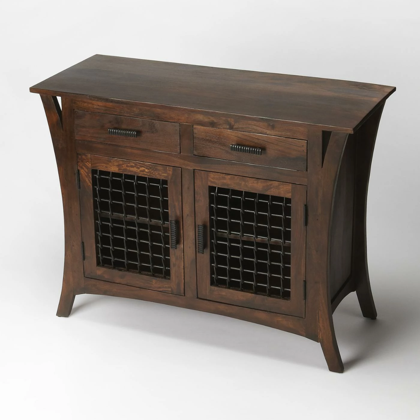 With its chocolate finish and iron hardware, the Butler Ako Console Cabinet holds to the principle of simplicity. Inwardly arching side panels and wire mesh door panels reflect an Asian-inspired sense of style. Strong, beautiful mango wood resounds with warmth and authenticity. Add convenient storage to your mud room, guest bath, or home office &emdash; you can even create a convenient mailing station stocked with tape, wrapping paper, stamps, and envelopes!