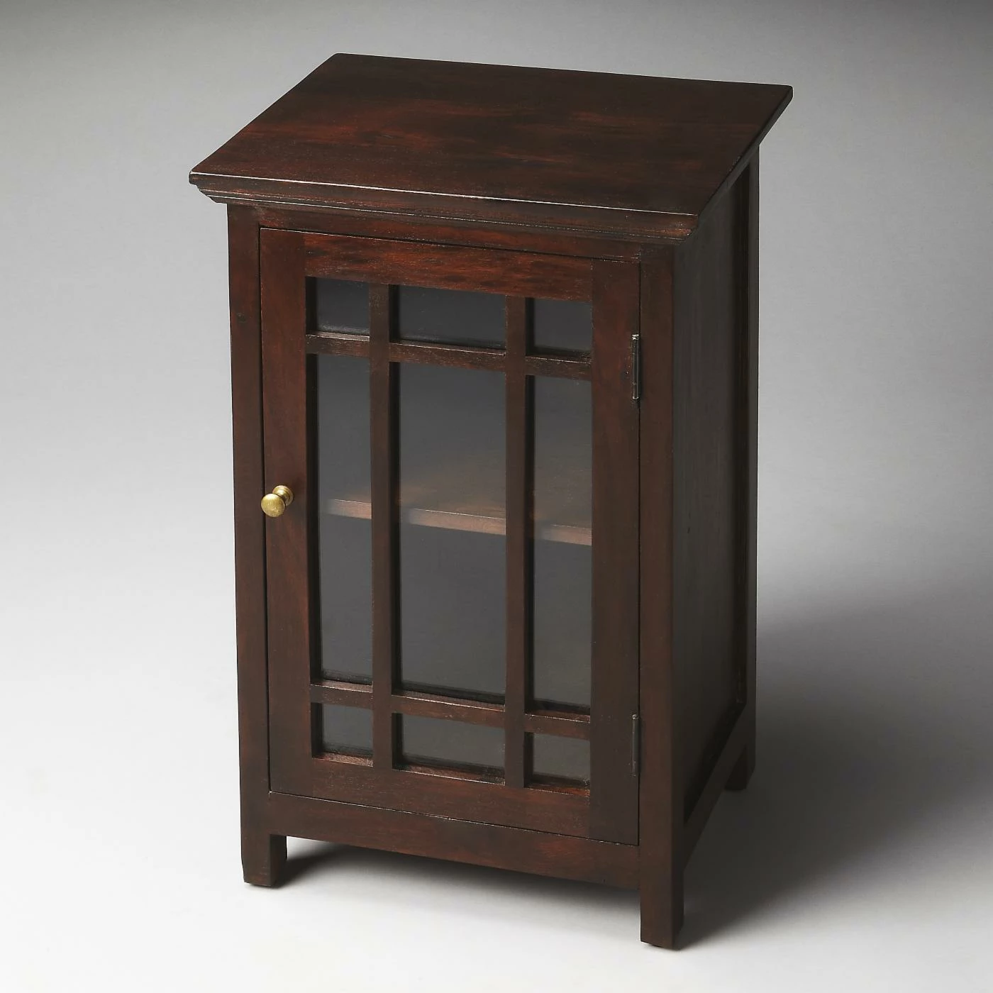 For an elegant yet updated look, theButler Baxter Transitional Chairside Table/Chest β Artifacts offers convenient storage and great modern style. This table has a cabinet with a shelf for all of your chairside storage needs. The glass-front door is a sophisticated touch with a panel look and brass hardware. A rich dark brown finish, straight legs and streamlined design give a modern feel to this table.