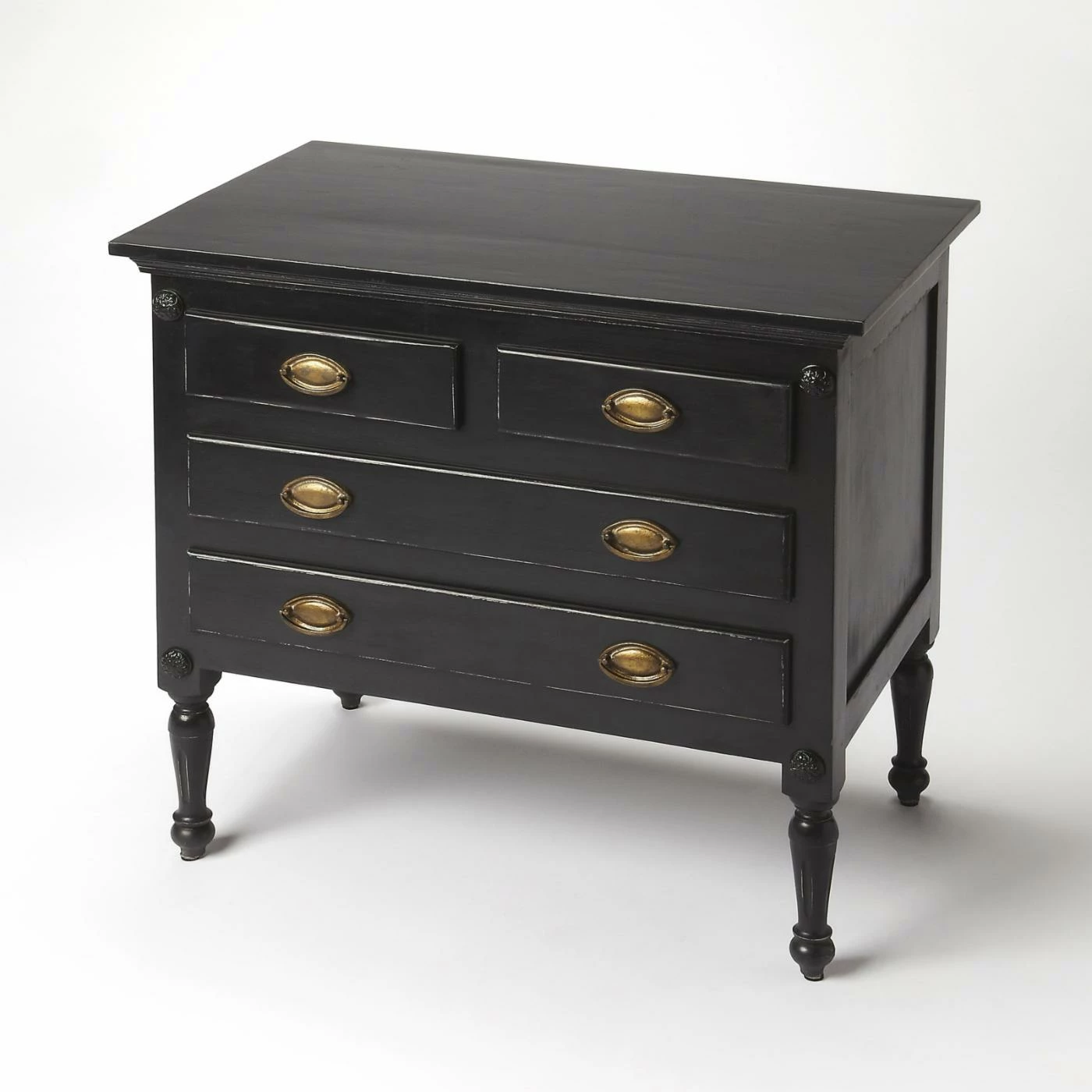 If youβre thinking the Butler Easterbrook 4 Drawer Chest is an antique, youβd be wrong. But, if youβre thinking this mango wood chest in a distressed black finish would rock in your entryway or master suite, youβre definitely on the right track. Tall, turned toupie legs support a quartet of drawers. Antiqued brass hardware and rosette accents lend a patina of timelessness.