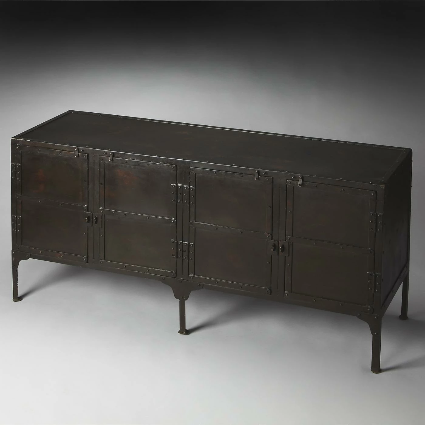 Add factory-gothic drama to your space with the Butler Owen Console Cabinet. Crafted of virtually bulletproof iron, this console cabinet is unbelievably easy to care for and maintain. Rivets outline each of four cabinet doors while also securing the hinges and legs, creating a darkly appealing campaign style feel. This console chest is ideal as a buffet or liquor cabinet.