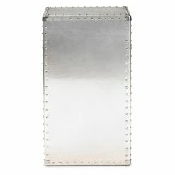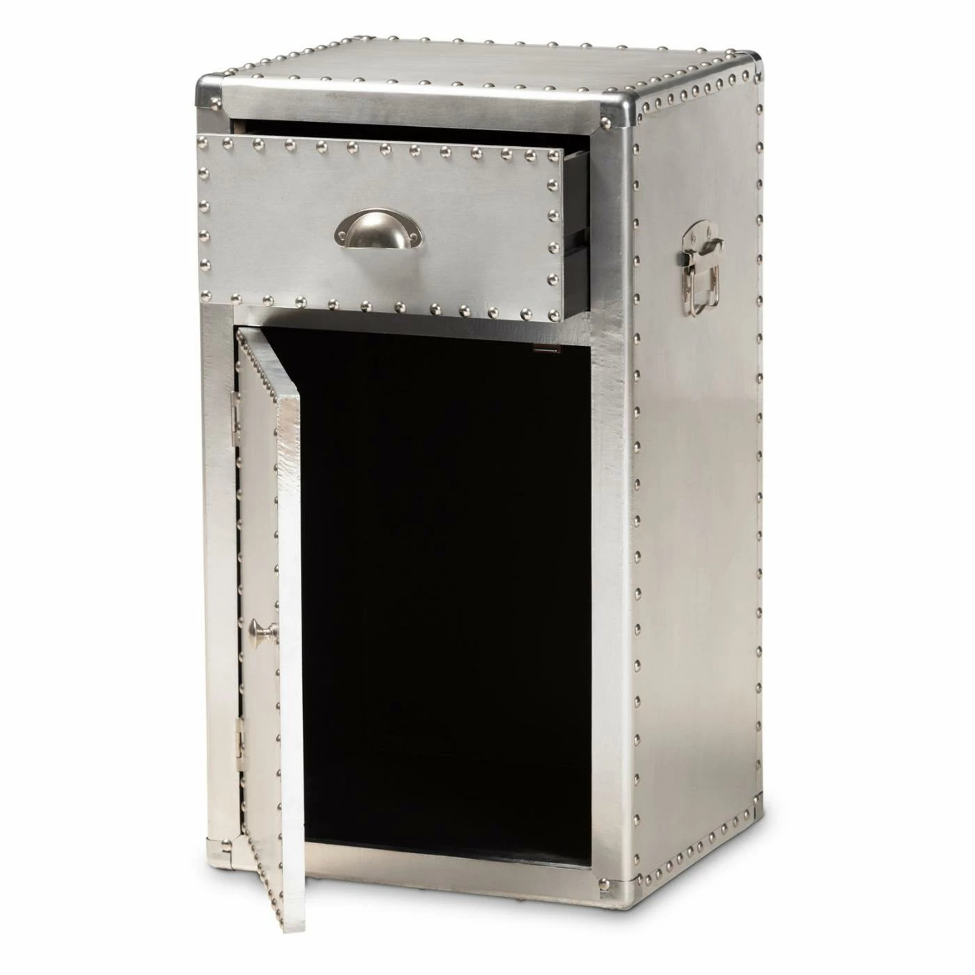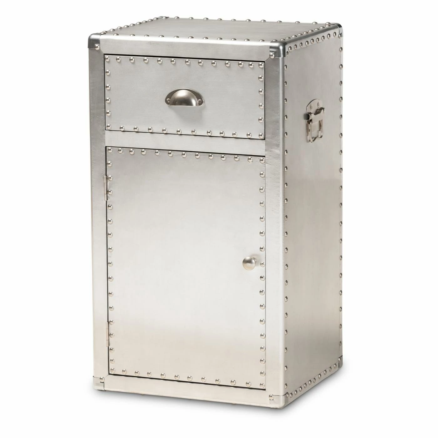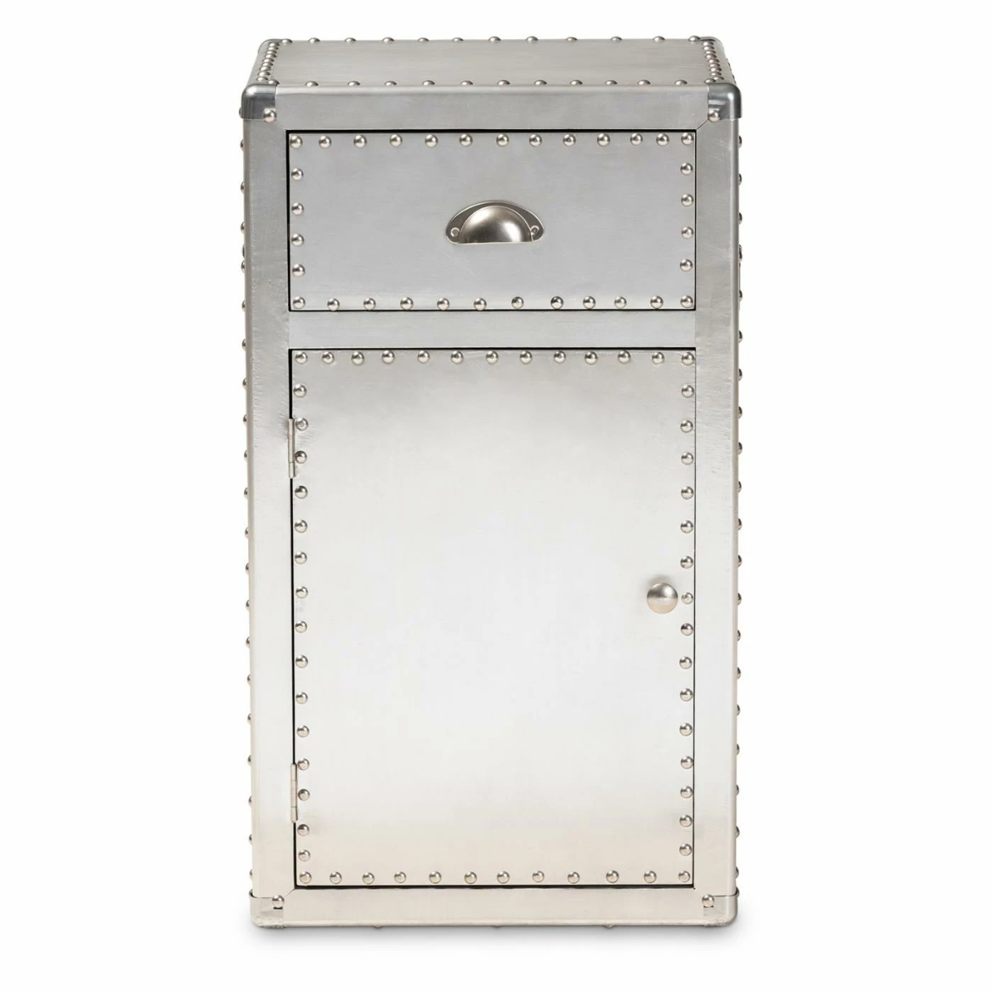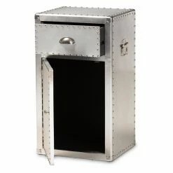 Inspired by vintage designs, the Baxton Studio Serge French Industrial 1 Door Accent Storage Cabinet is in a glam silver finish. Constructed of metal, this storage cabinet has one drawer and one cabinet for closed storage. Rivets and silver handles add an industrial touch, and the corner protectors evoke the image of old storage trunks. Style this piece as a nightstand or end table as an unexpected twist.