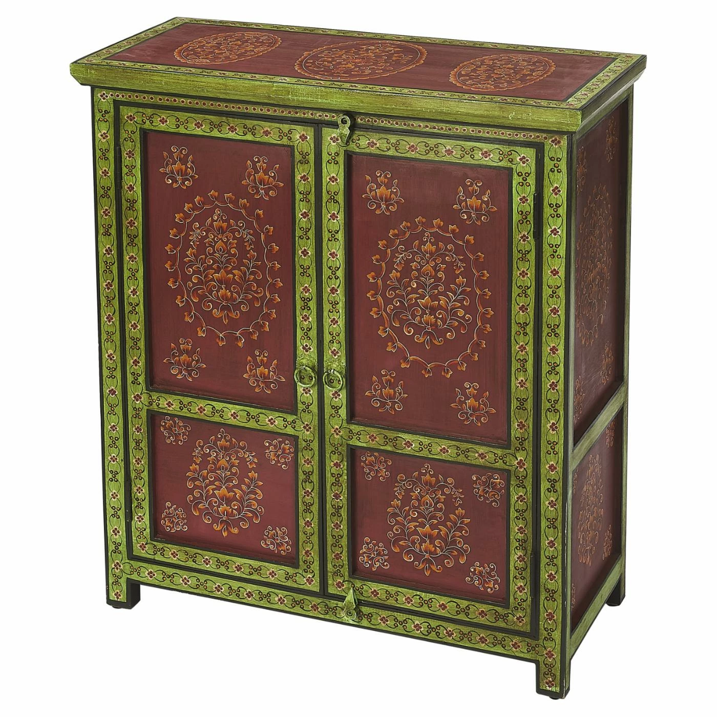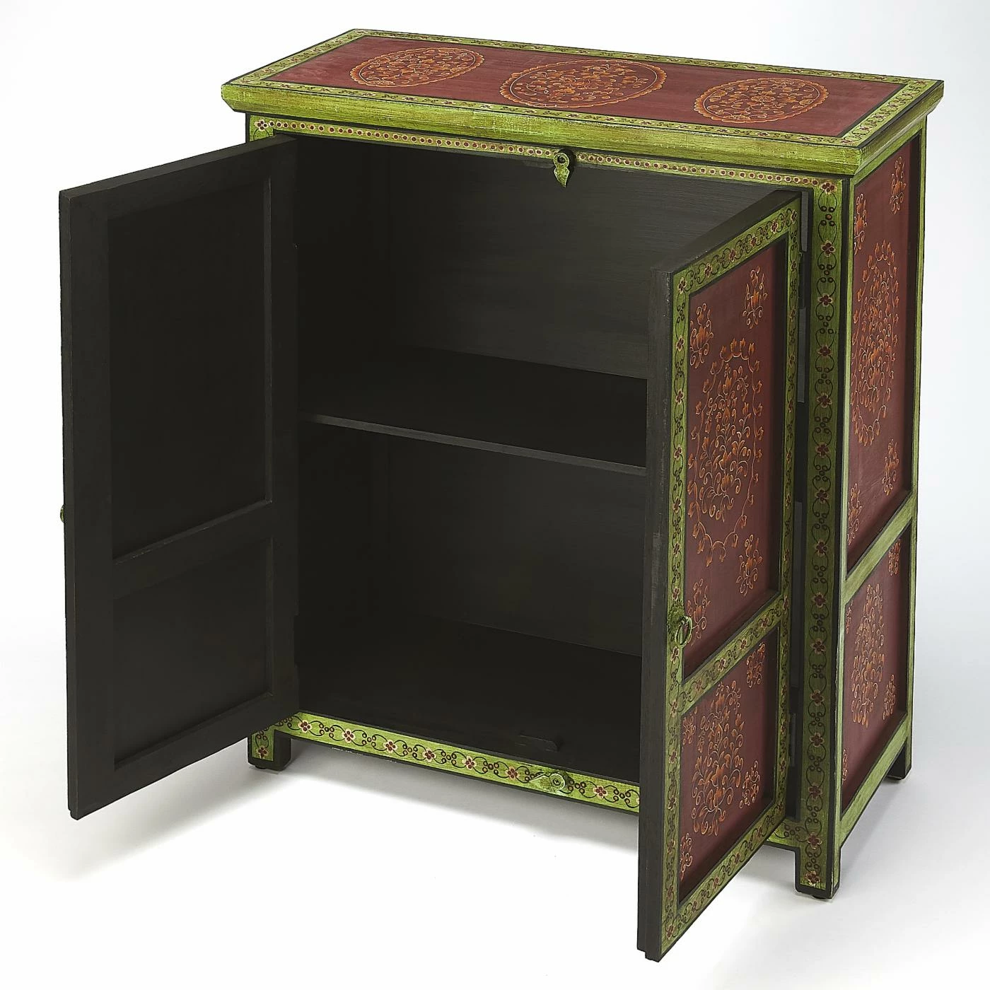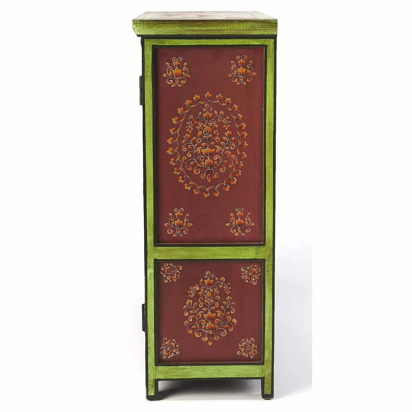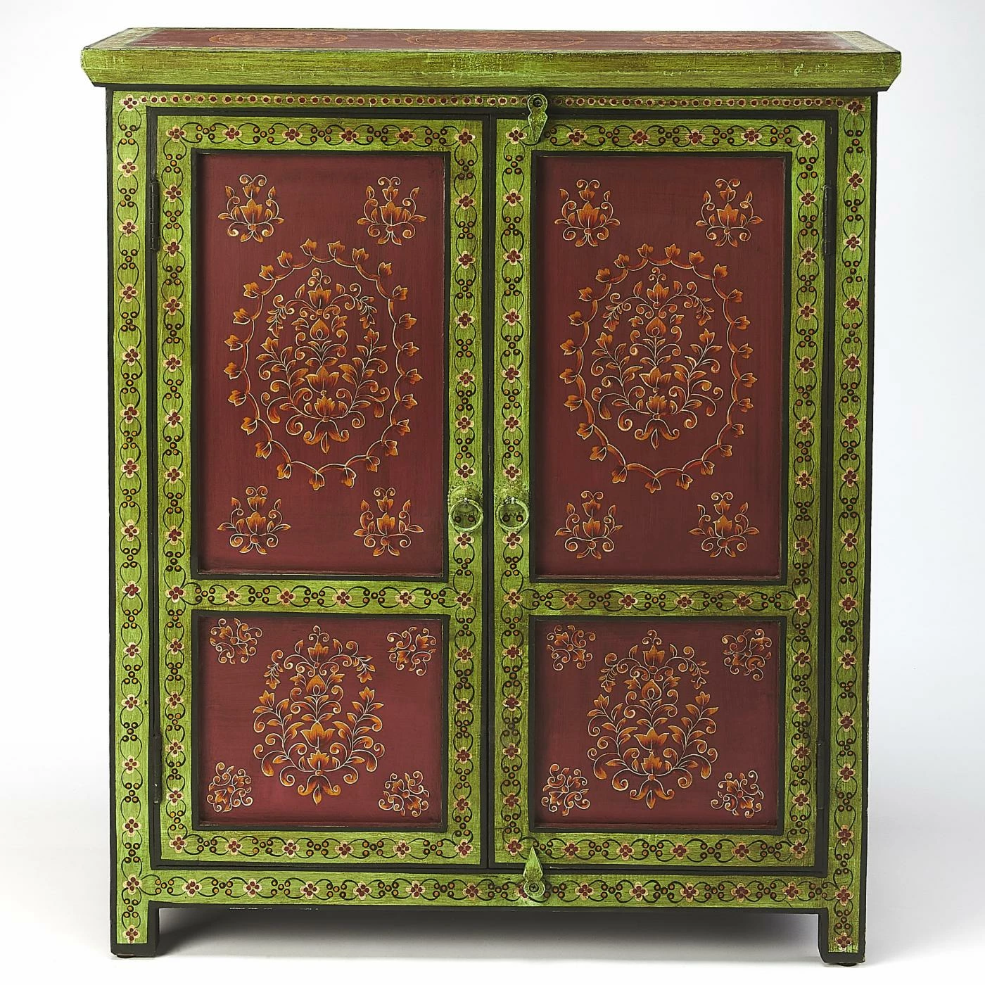 Lock your treasures away safely with the Butler Specialty Disha Hand Painted Accent Chest. Crafted with meranti veneers on an engineered wood frame, this decorative chest projects the feeling of finding an heirloom relic. Offering ample storage space with its inner pair of shelves, the chest features double doors with locking mechanisms. The floral design was hand-painted, adding one more layer of unique preciousness to your new decorative chest.