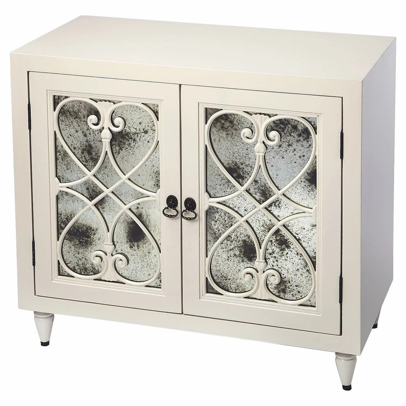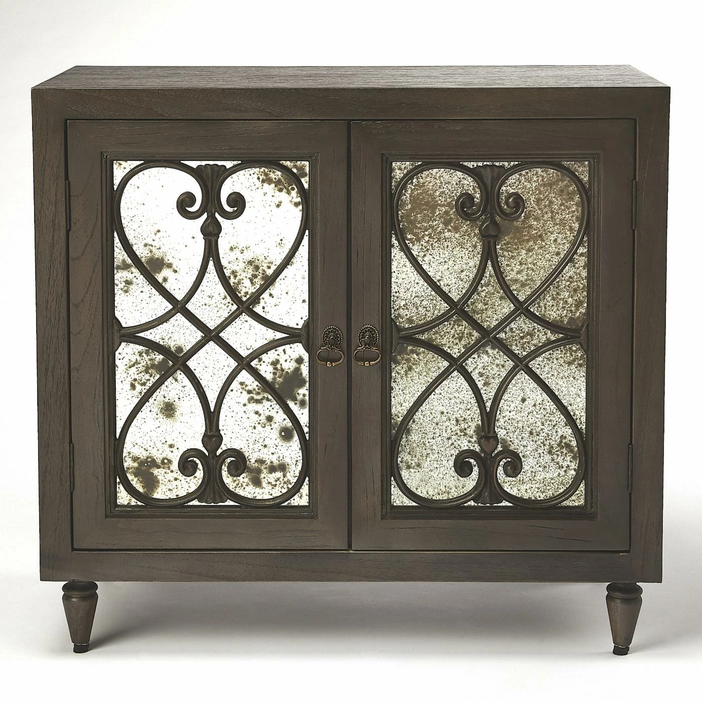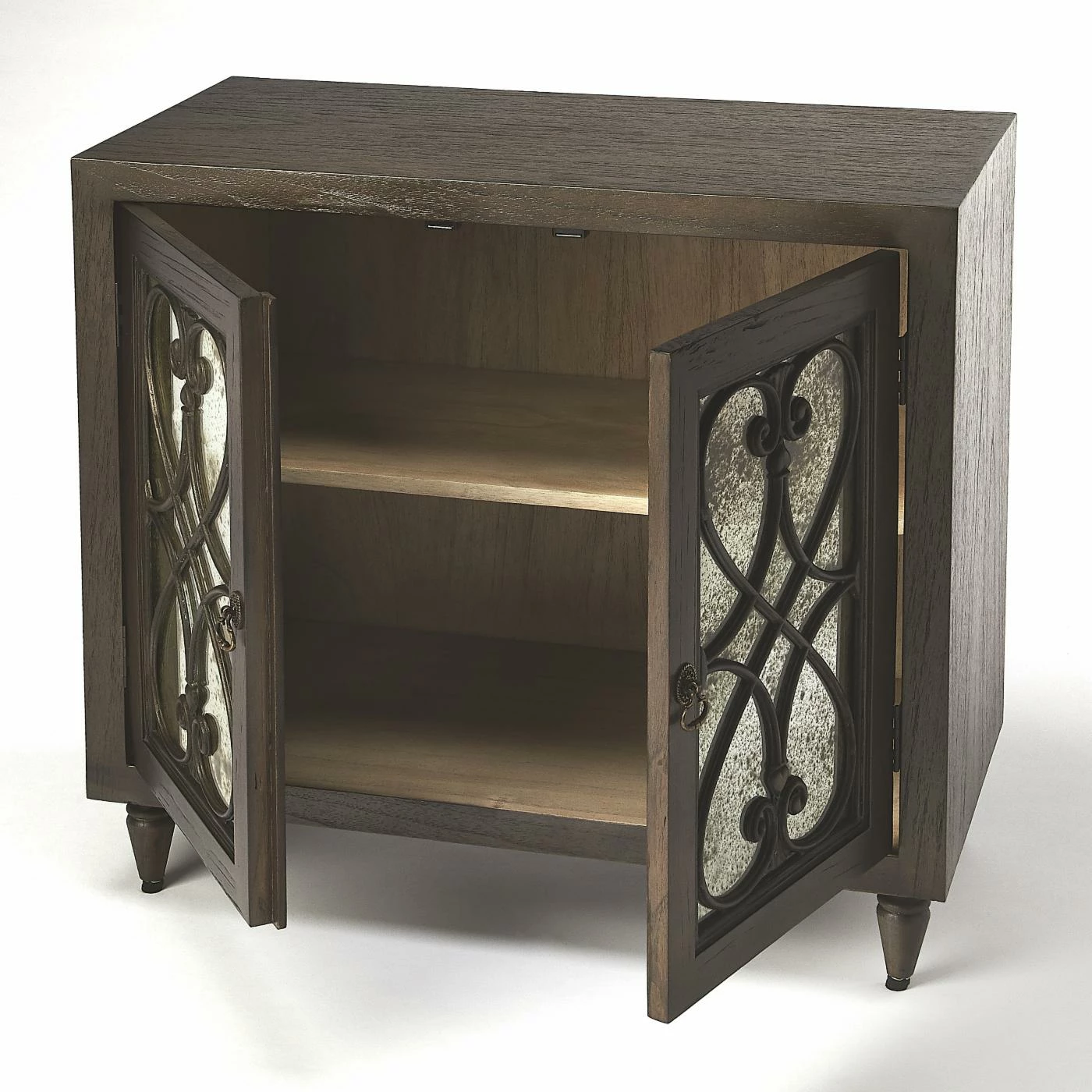 The Butler Specialty Finney 2 Door Accent Chest seeks to be your next decorative chest with style and class. The body of this chest is crafted from engineered wood with mindi wood veneers. The two doors feature intricate scrollwork tracery on distressed mirror panels, giving the notion that this cabinet comes to you from antiquity. Open the doors with steel pulls and you’ll find two shelves eager to house your treasures. Choose your favorite finish from the available options.