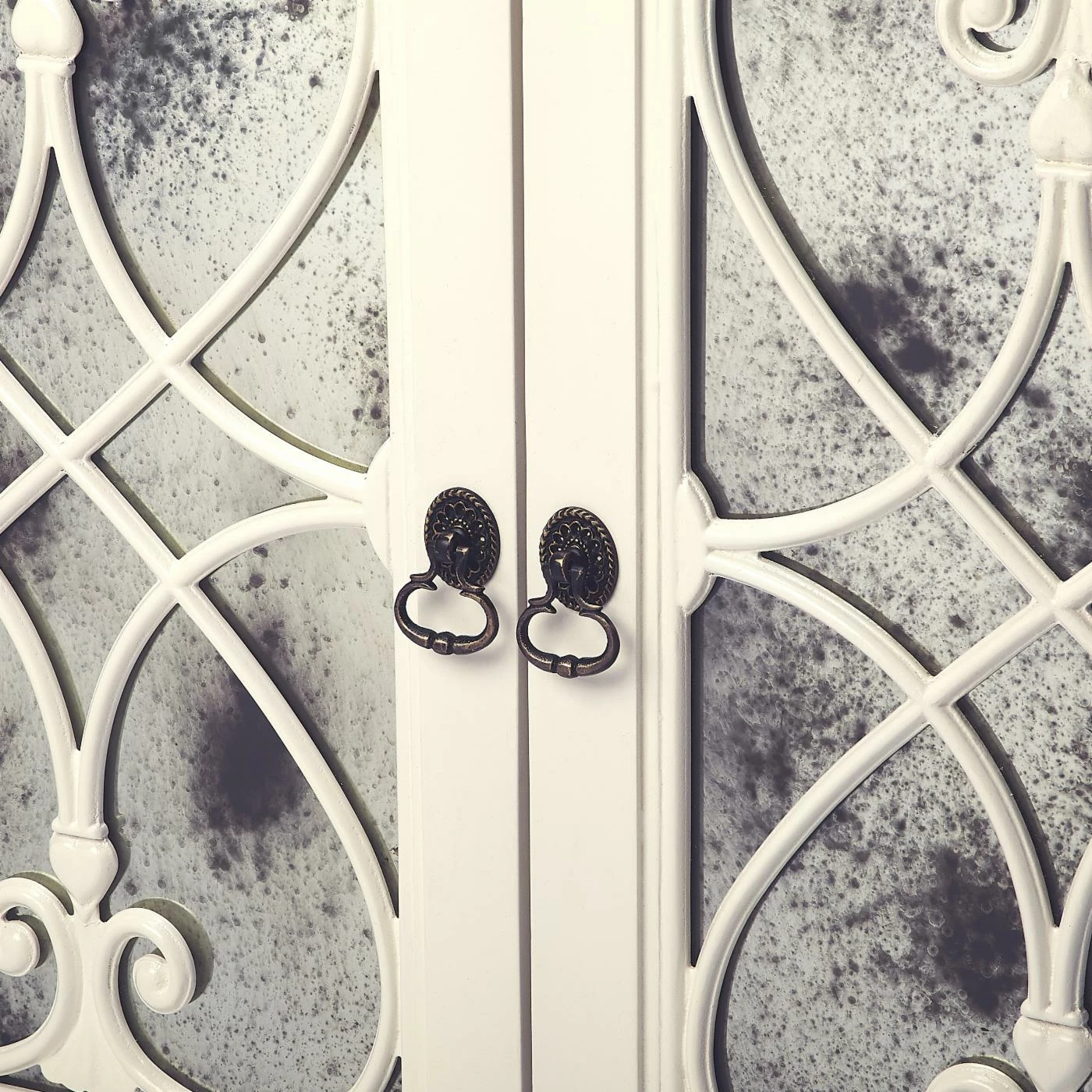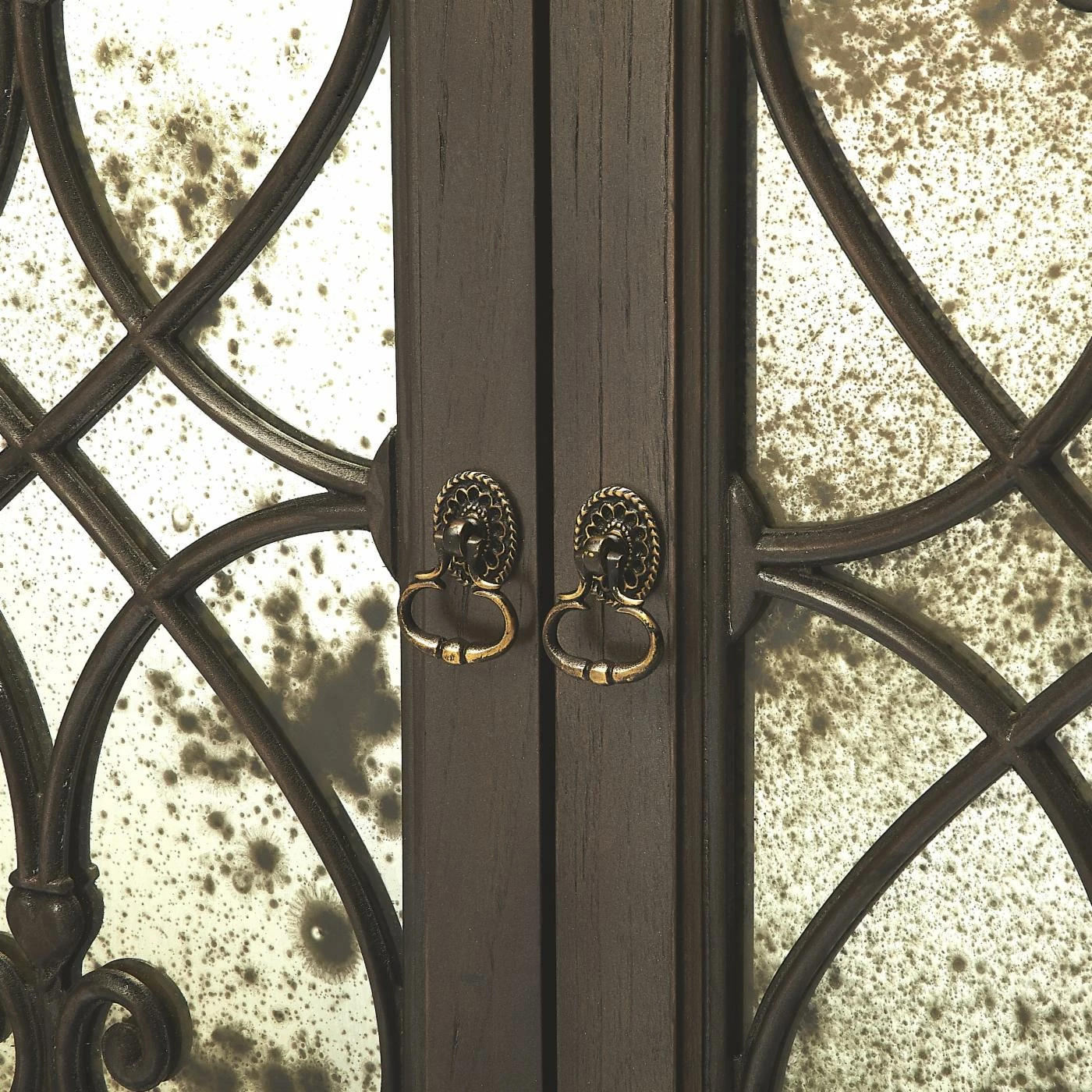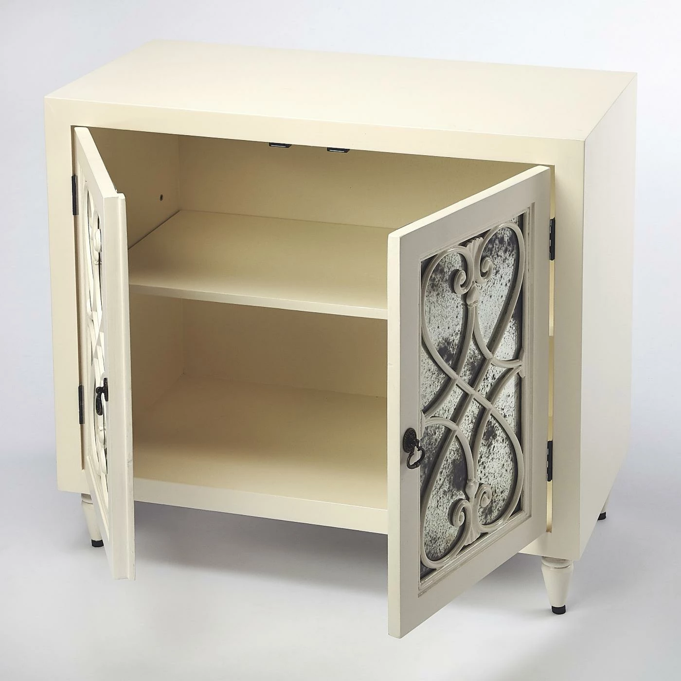 The Butler Specialty Finney 2 Door Accent Chest seeks to be your next decorative chest with style and class. The body of this chest is crafted from engineered wood with mindi wood veneers. The two doors feature intricate scrollwork tracery on distressed mirror panels, giving the notion that this cabinet comes to you from antiquity. Open the doors with steel pulls and you’ll find two shelves eager to house your treasures. Choose your favorite finish from the available options.