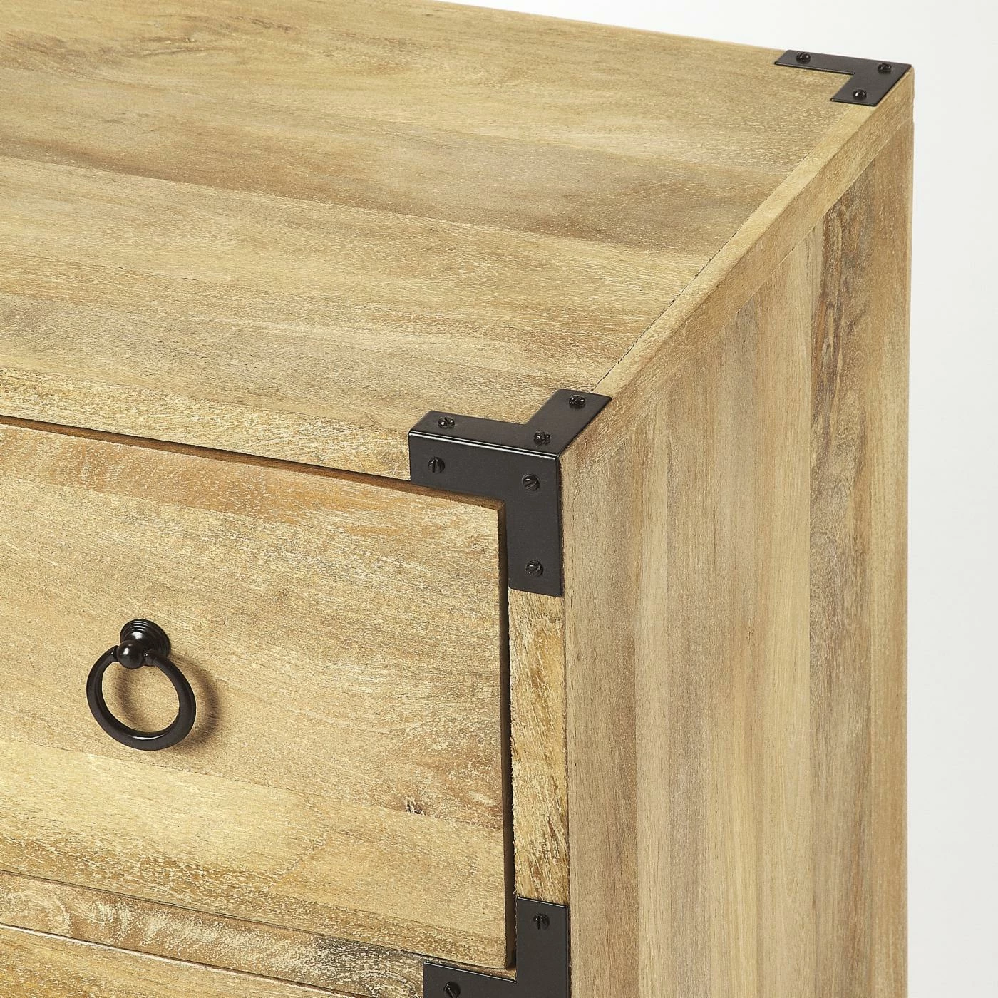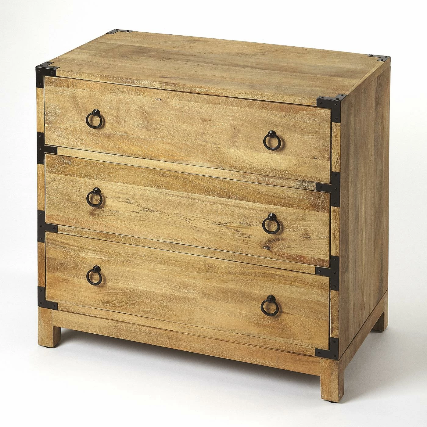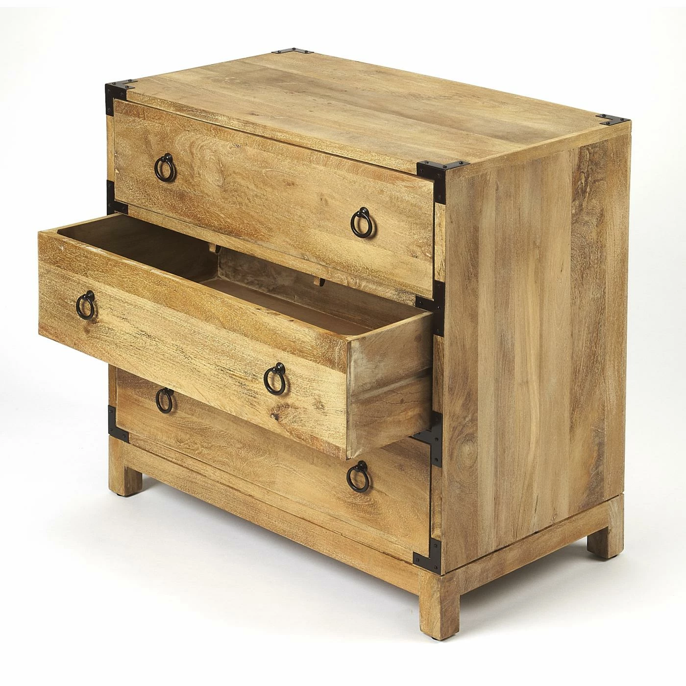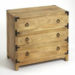 Provide some minimalist storage for your bedroom, day room, or living room with the Butler Specialty Forster Campaign Chest. This chest features three wide and deep drawers built into its design, each featuring smooth ball-bearing glides and double metal ring handles. Thick wood constructs the frame, which is accented with a versatile natural brown tone. The corners of the chest feature black riveted caps.