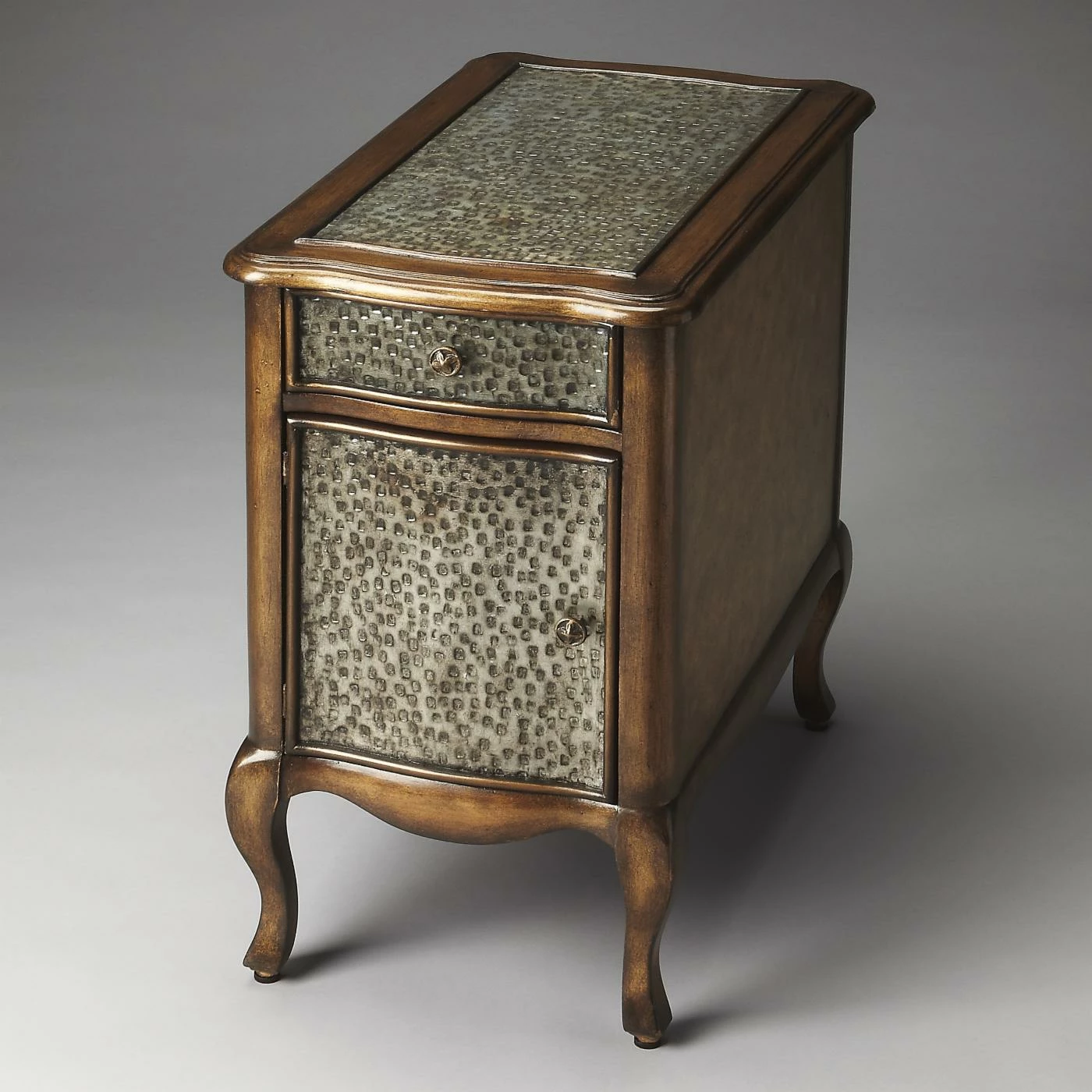 The Butler Specialty Heritage Bosworth Chairside Table is a fusion of classical lines, contemporary details, and functionality. Hammered antique nickel and copper accents enhance the charm of this transitional table. Perfect for adding purpose to your living room, place it at one end of your sofa and top with decorative accents. This chairside table has one small drawer at the top and a larger cabinet below.