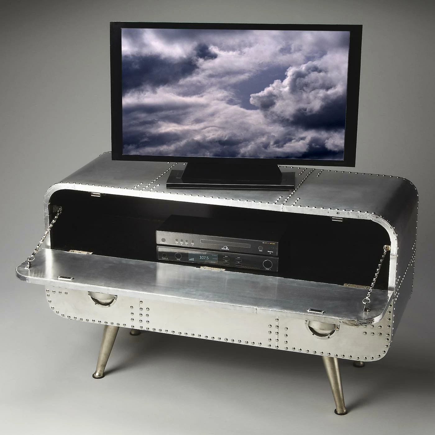 The versatile Butler Specialty Industrial Chic Midway Console Chest brings mid-mod aviation style home. Use this polished aluminum chest as a media center or in your industrial chic entryway. The drop-down top door is held open at 90 degrees by matching chains. This shimmering and practical console chest features abundant storage its lower bottom shelf. Notice how the exquisitely flared legs taper down for a smooth landing.