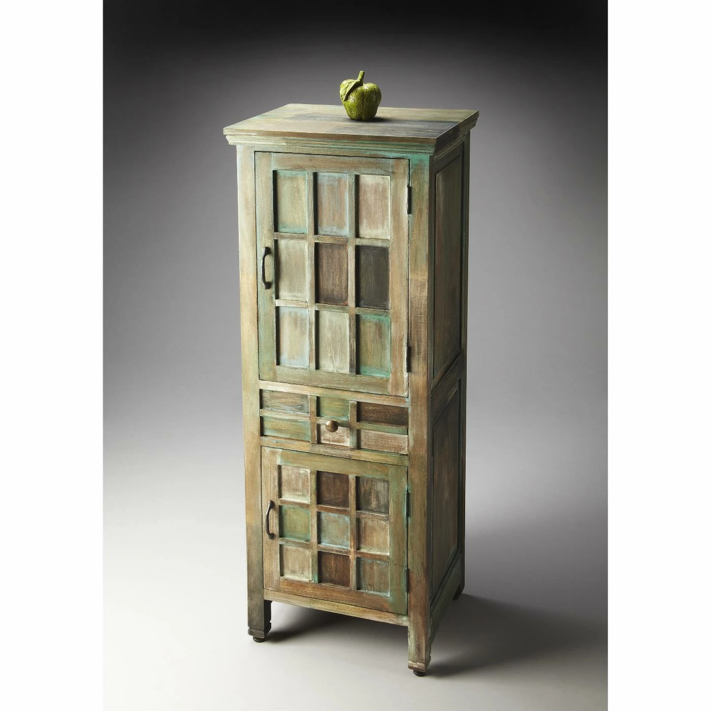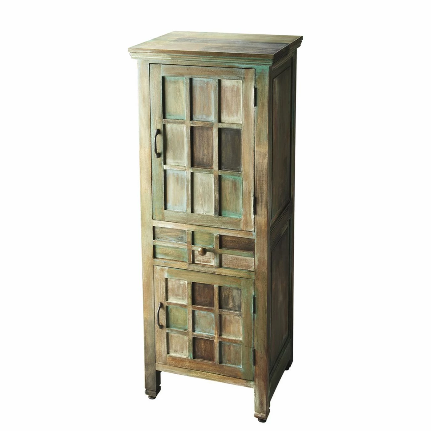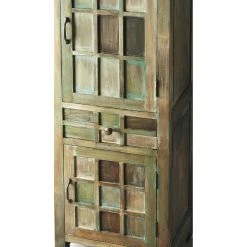 Imbued with a rustic elegance, the Butler Specialty Jodha Accent Storage Cabinet adds character as well as space-saving organization to your bedroom dΓ©cor. The design is crafted from acacia wood solids in an Artifacts finish made up of rich green, brown, and whitewash tones accented with antiqued brass hardware. A raised windowpane pattern is overlaid on top of the two doors and center drawer, each of which opens to a generous storage compartment.Β Some assembly is required.