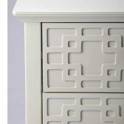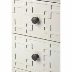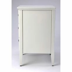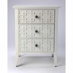 Store any number of bedroom, living room, or entryway items in the Butler Specialty Kinsley Glossy White 3-Drawer Accent Chest‘s spacious drawers. The drawer fronts feature a geometric design that will add unique style to your home. The round metal handles are finished in black that stands out against the off-white finish. This wood accent chest has tapered legs with footcaps that won’t mar your floor.