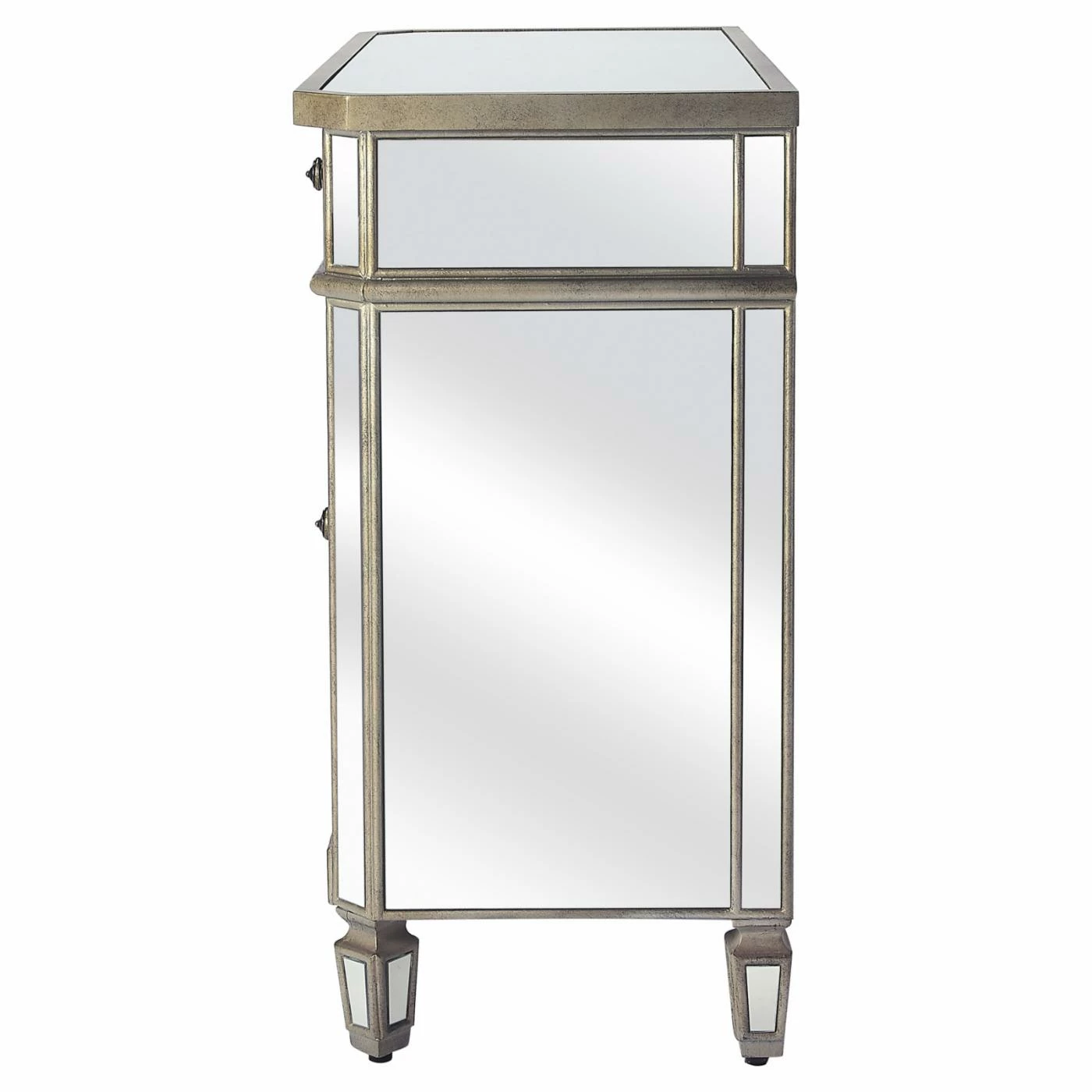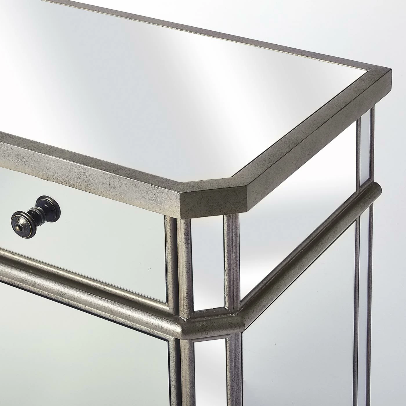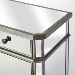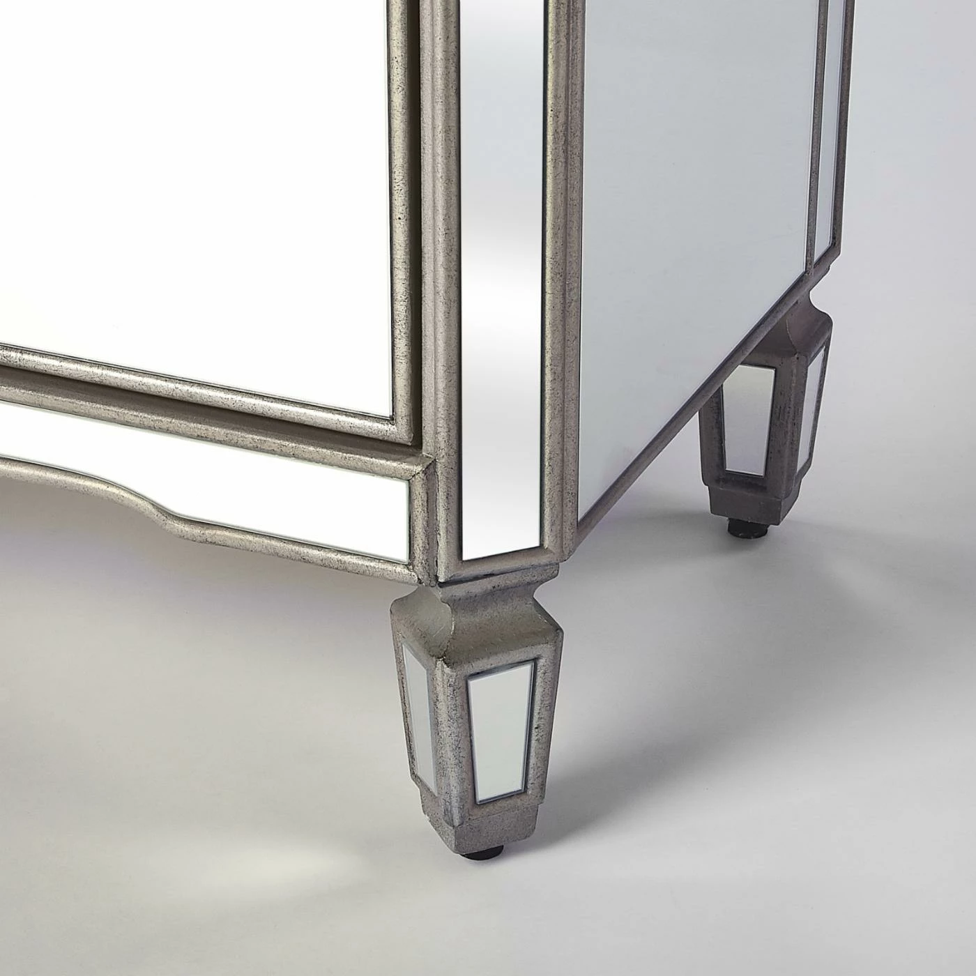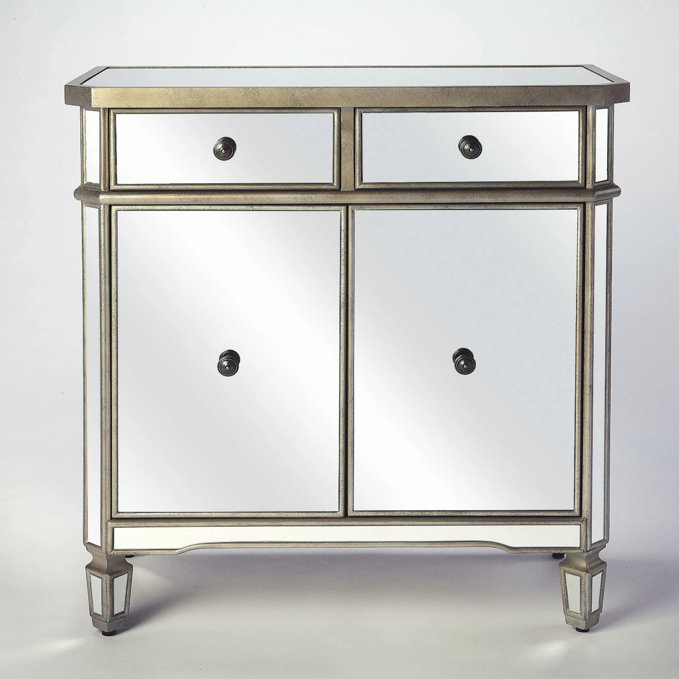 The Butler Specialty Marissa Mirrored Accent Chest brings glam style to your home dΓ©cor. Crafted of beech wood with zinc mirror veneers, this chest is trimmed with pale gold finish details. Two drawers and two doors offer ample storage, while inside two shelves wait for your valuables. The door and drawer pulls are made of metal.