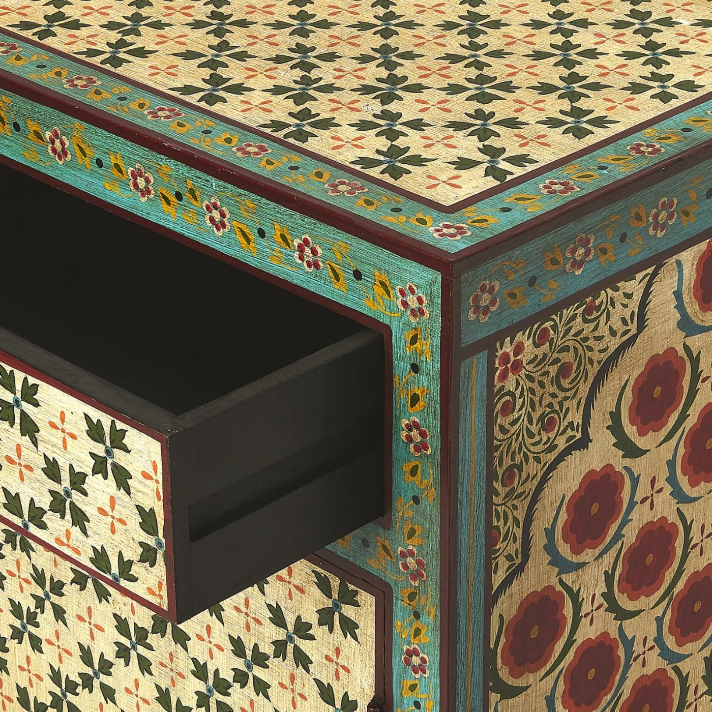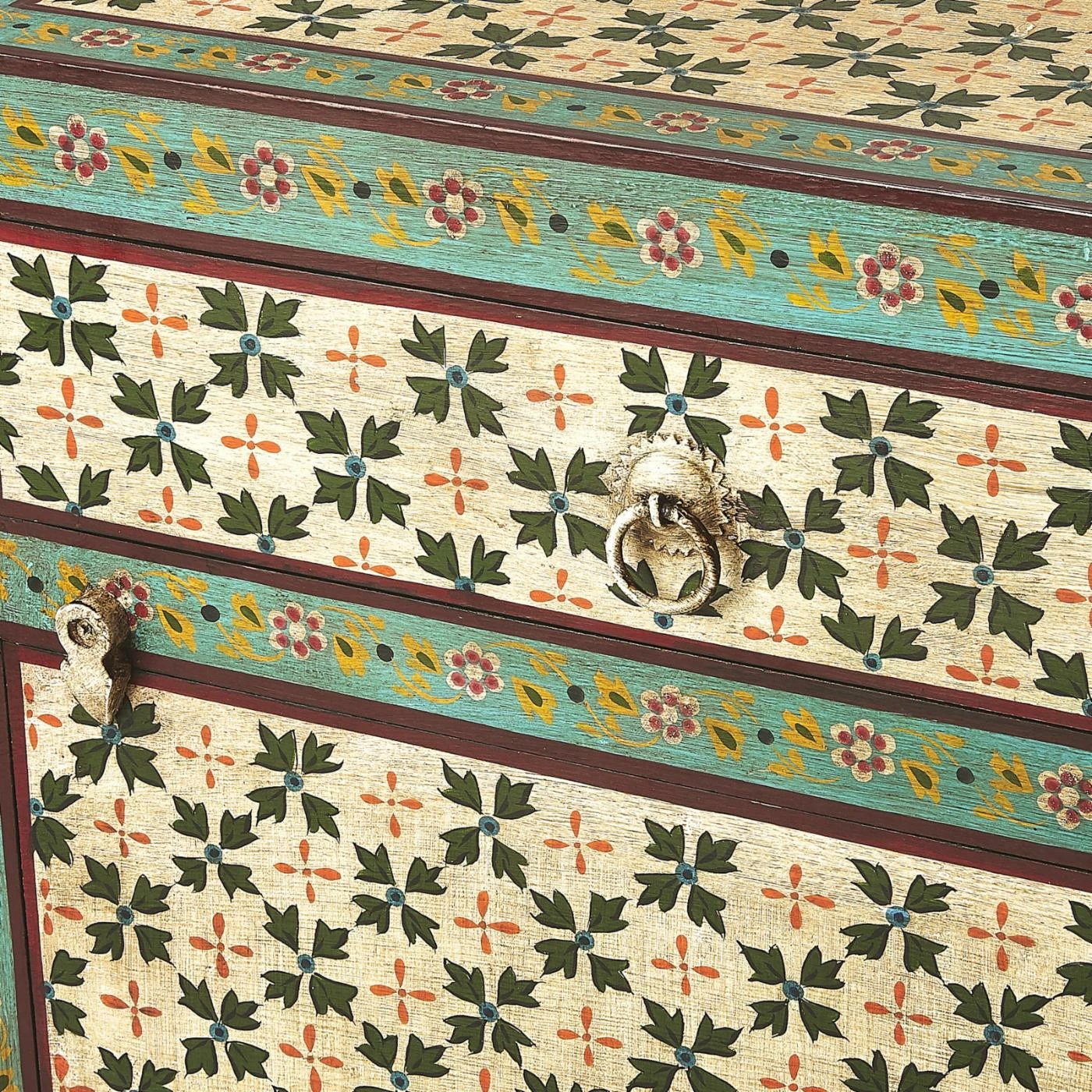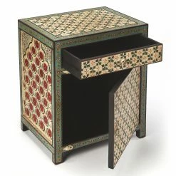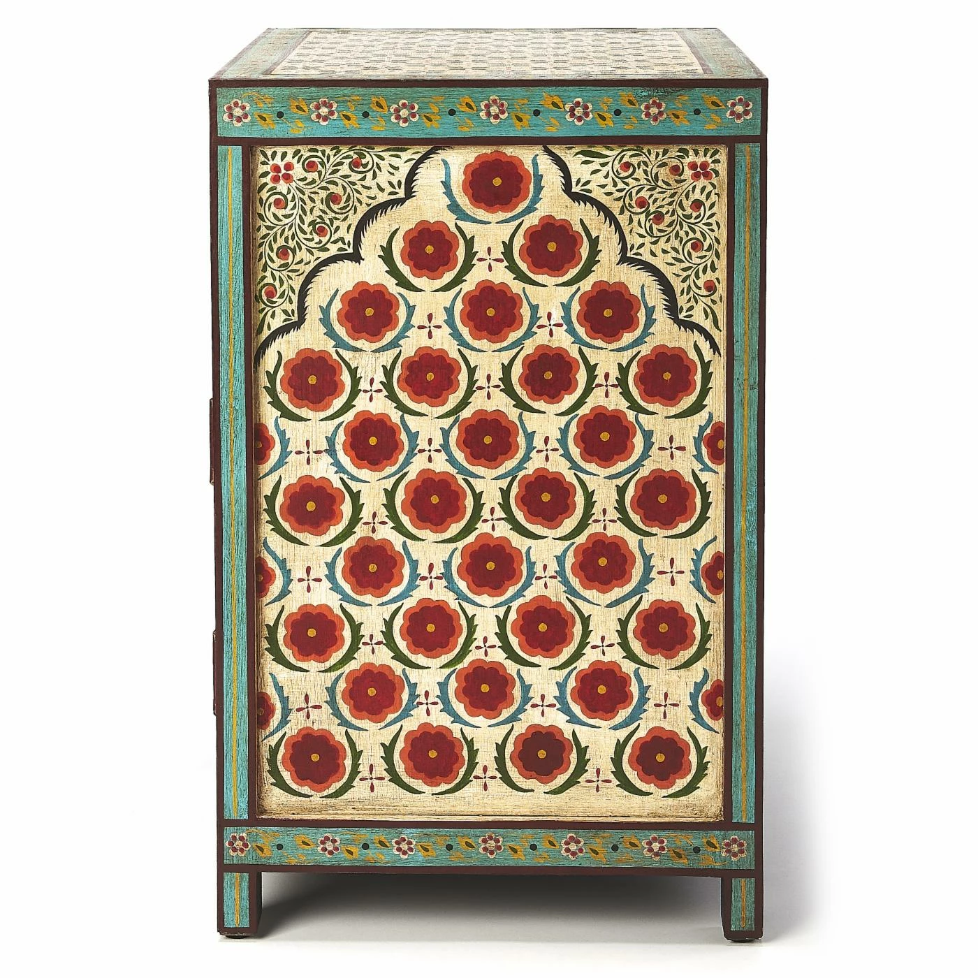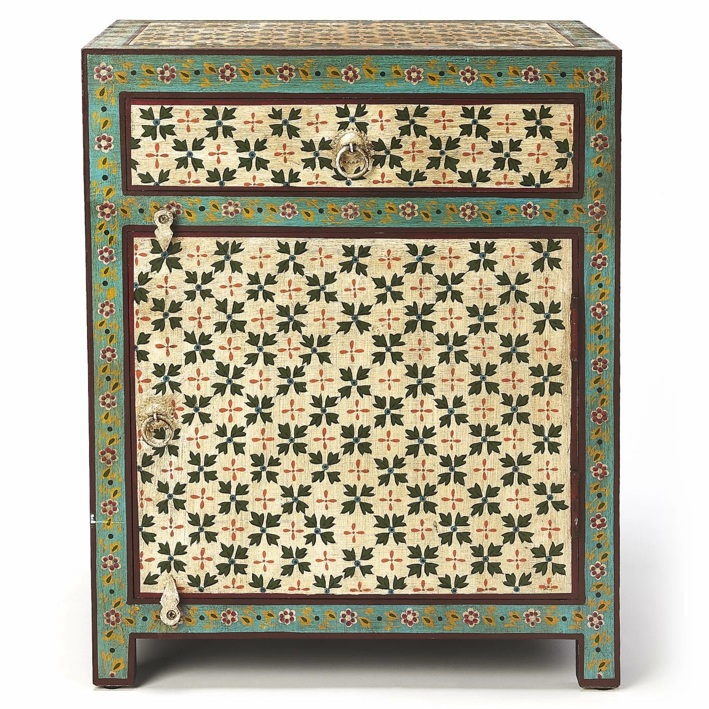 Store your treasures in the gem that is the Butler Specialty Perna Hand Painted Accent Chest. Crafted with meranti wood veneers, this chest sports a frame of durable engineered wood. The storage options available are one drawer and one lower cabinet portion, both with a small locking mechanism to protect whatever’s inside. The floral pattern, in reds, greens, and ivory, is hand applied, solidifying this piece as a modern classic.