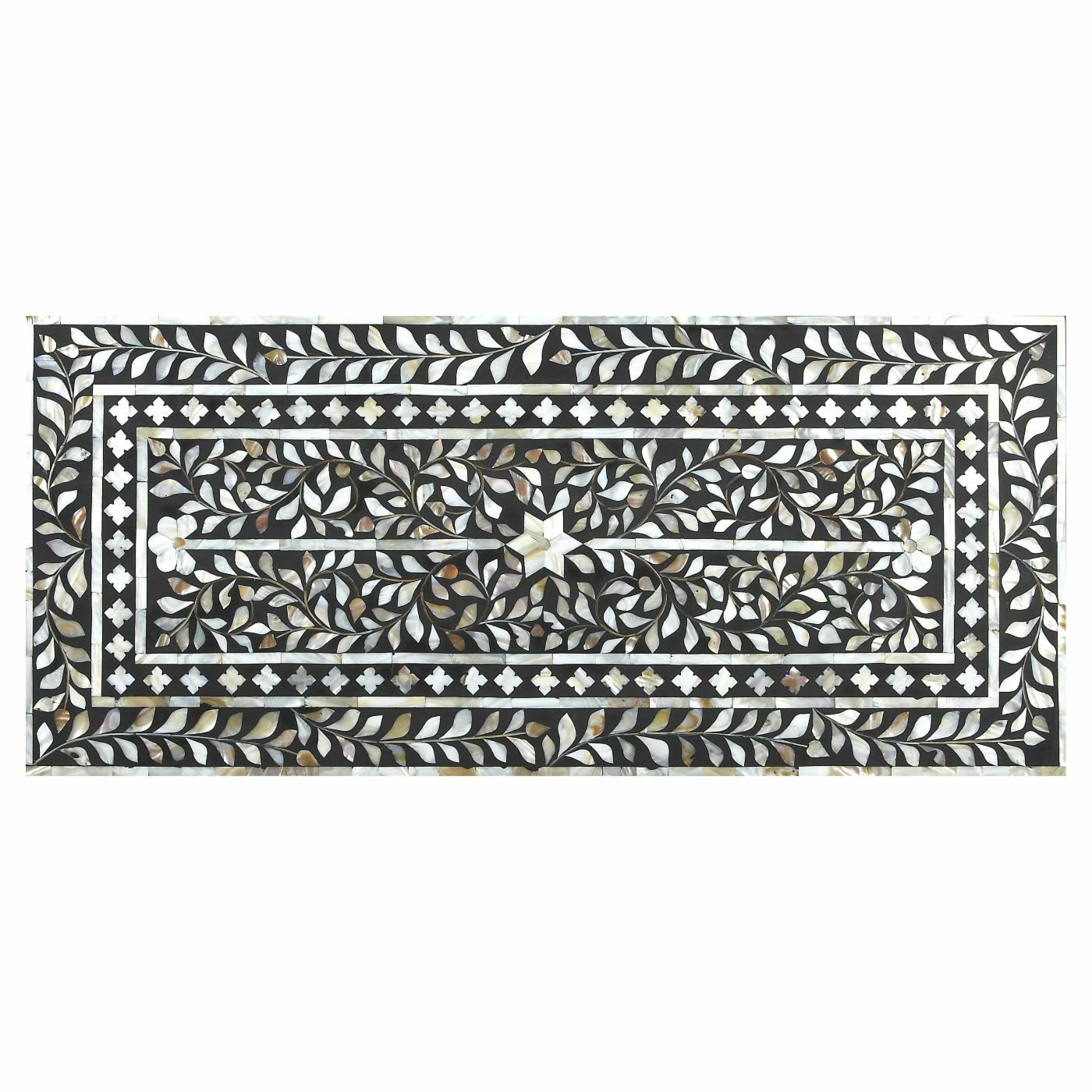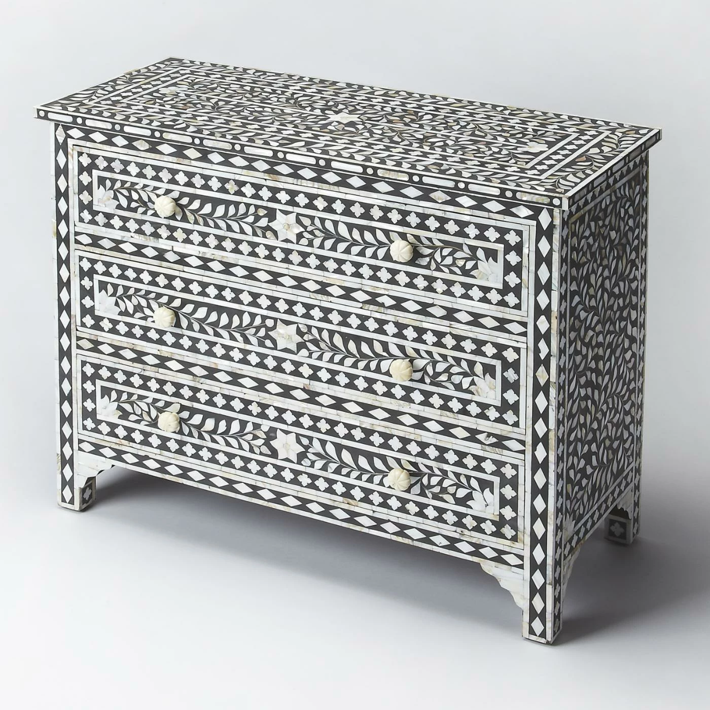 Designed to dazzle, the Butler Specialty Victoria Mother Of Pearl Chest is both exotic and timeless. This eye-catching chest is handcrafted from with mother of pearl details in an elegant botanical and geometric design. The color stands out against the black background on engineered wood. Its three wide drawers offer storage space to make this chest perfect in virtually any room. Coordinating drawer pulls and mango-wood, bracket legs complete the look.