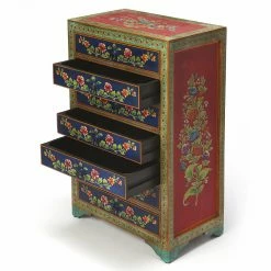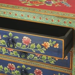 Straight from the world bazaar, the Butler Specialty Zara Hand Painted 7 Drawer Accent Chest is your next choice for decorative chest home storage options. Crafted with a frame of engineered wood, the facing features meranti wood veneers. Six drawers with metal pulls offer proper storage for smaller items. Hand applied, the floral finish with reds, greens, blues, and yellows, paint this chest of drawers as a true cabinet of wonders.