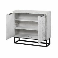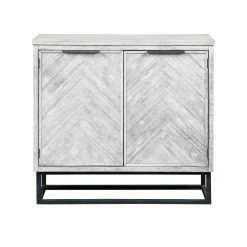 The herringbone white rub finish gives a softness to the Coast to Coast Aspen Court II 2 Door Accent Cabinet, a quite beauty to the plank construction and the masterful chevron patterns that flow over the two door fronts. Perched atop a dark linear metal base which matches the thin hardware that tops the doors, this Cabinet will bring the same serenity to your decor.