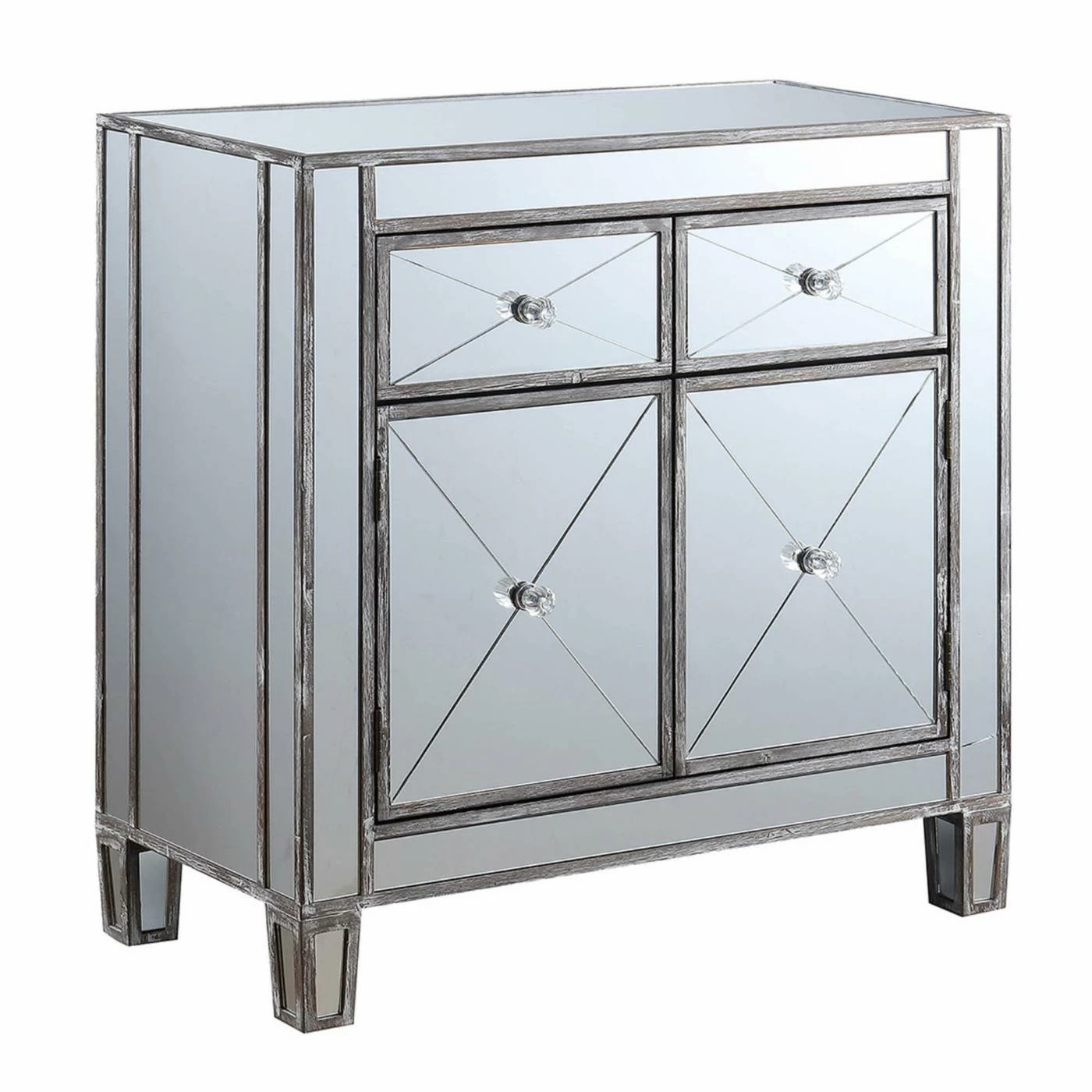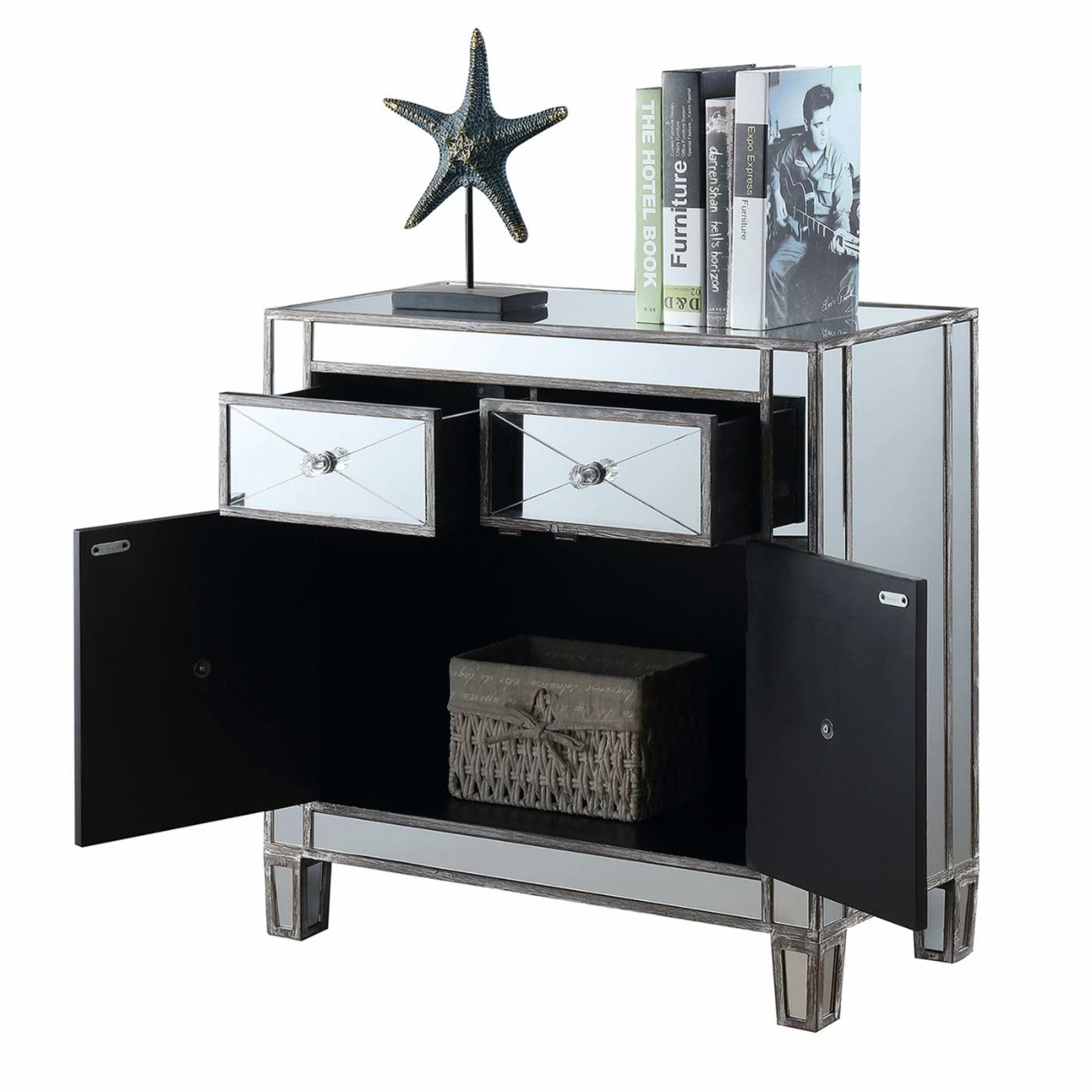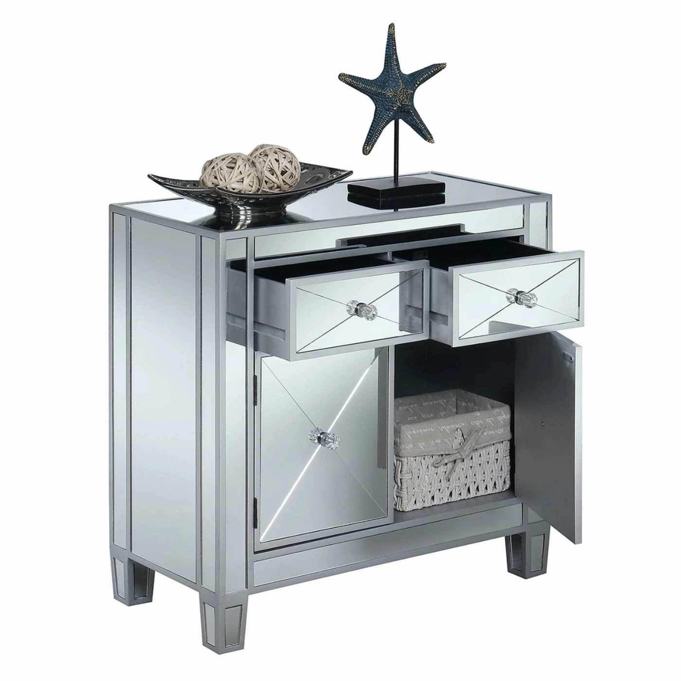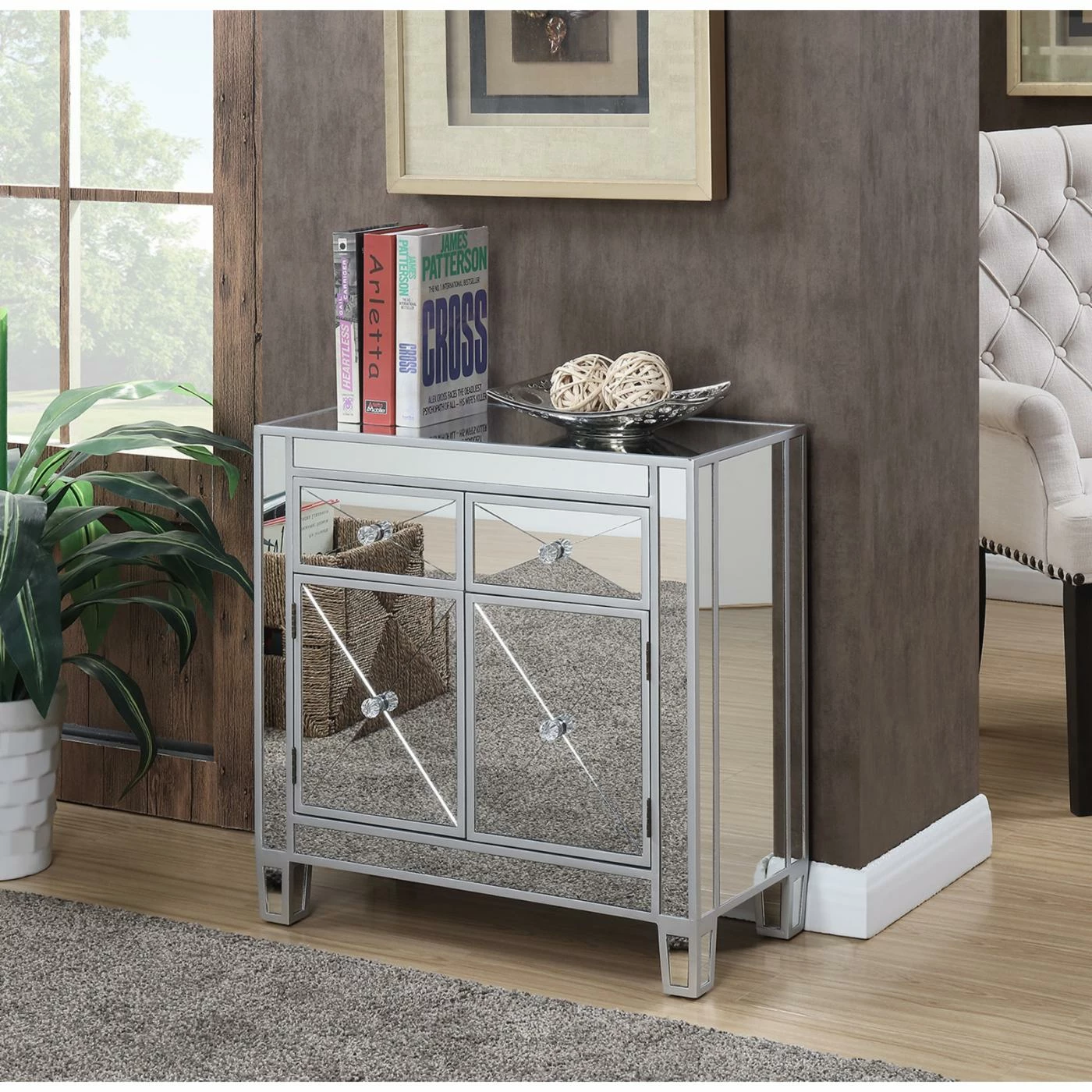 Bring glamour and contemporary design to your home with the Convenience Concepts Gold Coast Vineyard 2 Drawer Mirrored Cabinet. Crafted from fir and engineered wood, this piece is covered in mirrored glass panels and comes in your choice of available finishes. Two drawers and a spacious cabinet provide plenty of storage space for everything from devices and cords to magazines and books. Faux crystal rosette knobs and cabinet pulls complete the look.