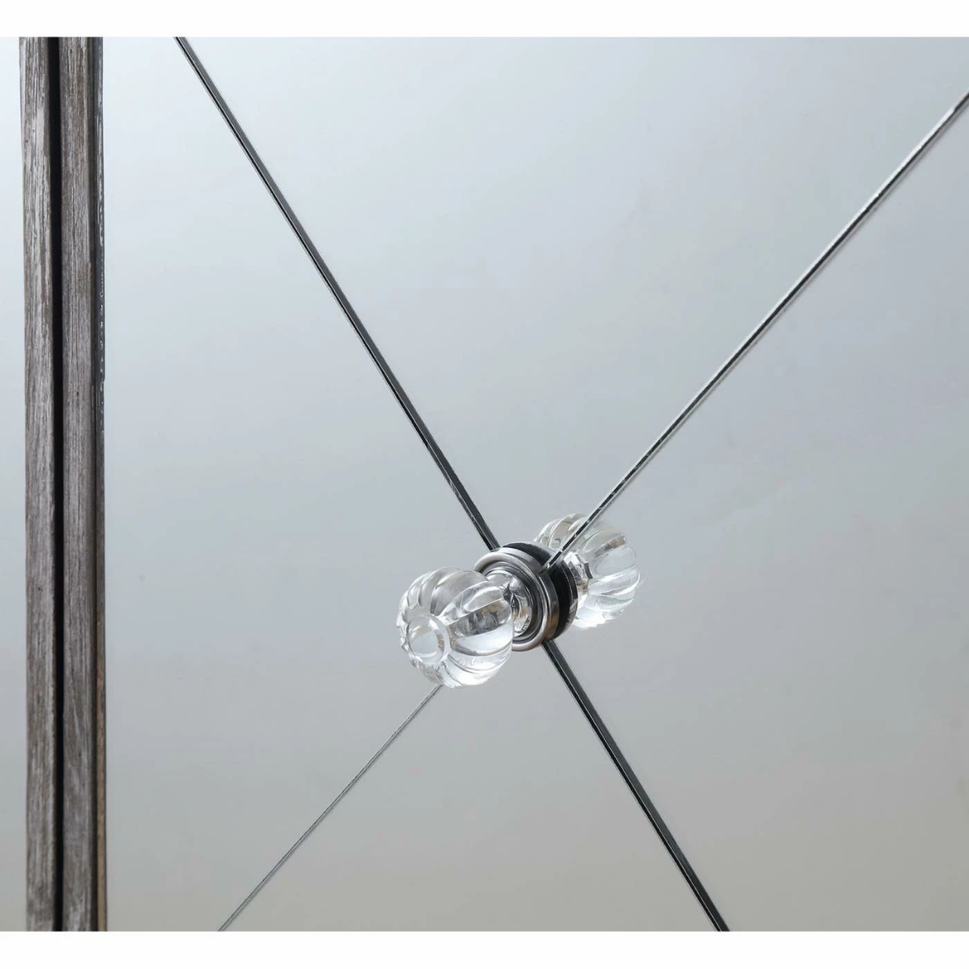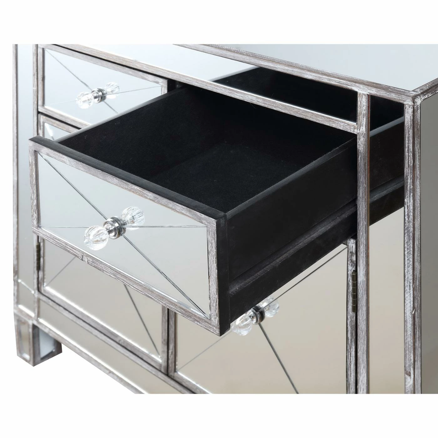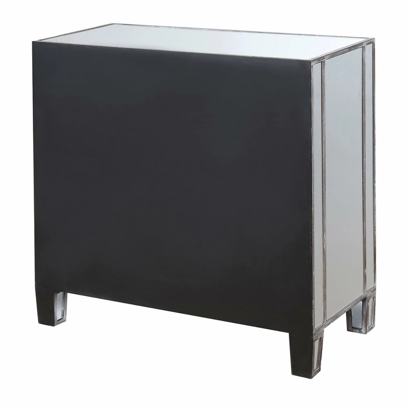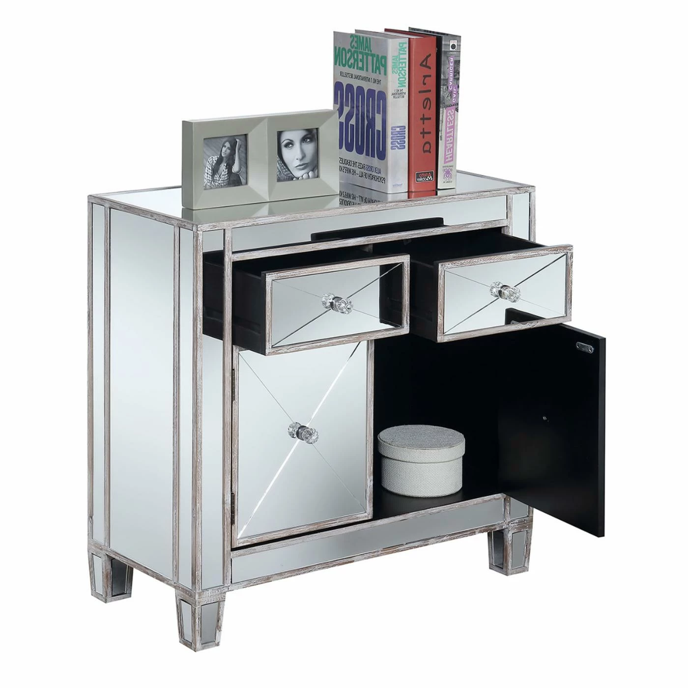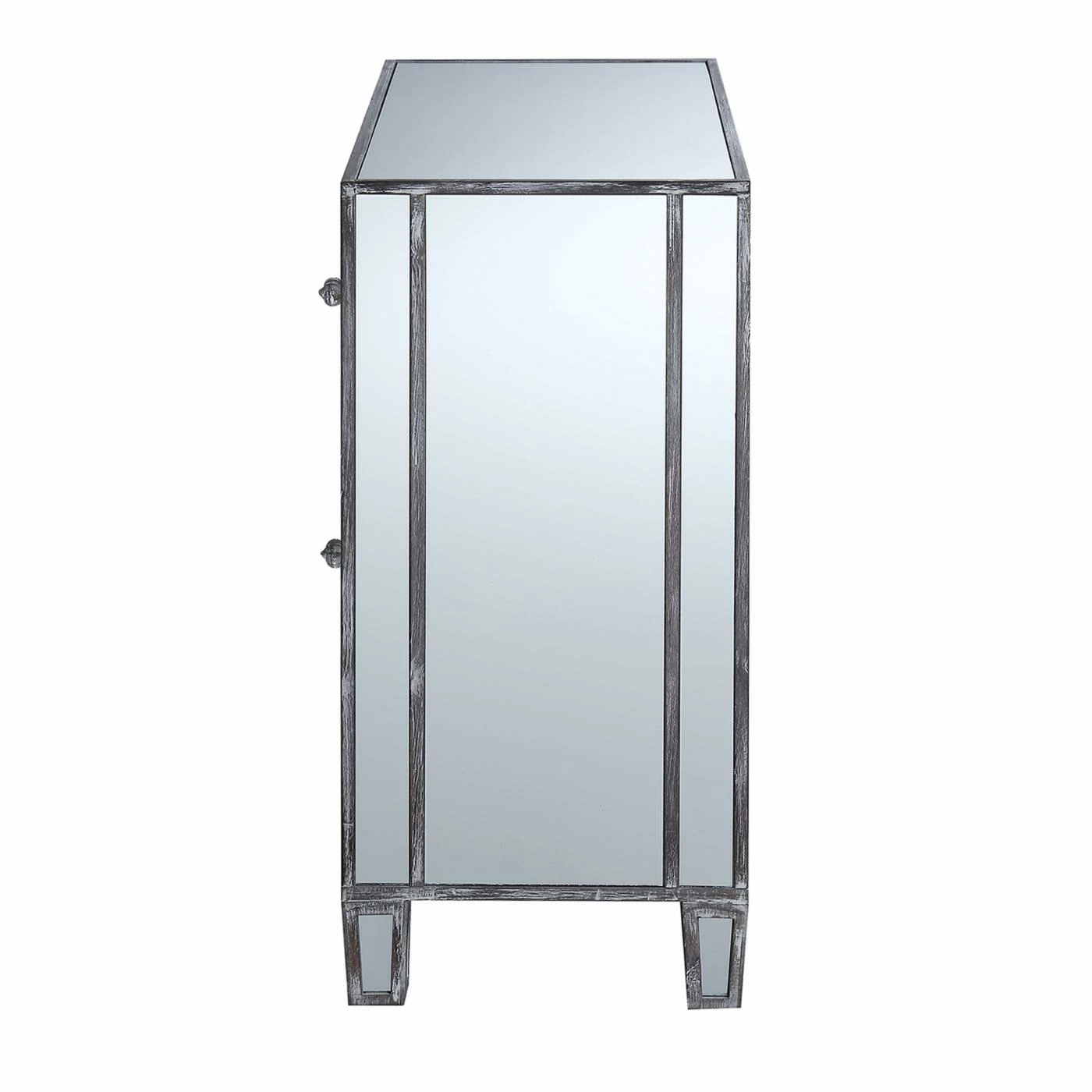 Bring glamour and contemporary design to your home with the Convenience Concepts Gold Coast Vineyard 2 Drawer Mirrored Cabinet. Crafted from fir and engineered wood, this piece is covered in mirrored glass panels and comes in your choice of available finishes. Two drawers and a spacious cabinet provide plenty of storage space for everything from devices and cords to magazines and books. Faux crystal rosette knobs and cabinet pulls complete the look.