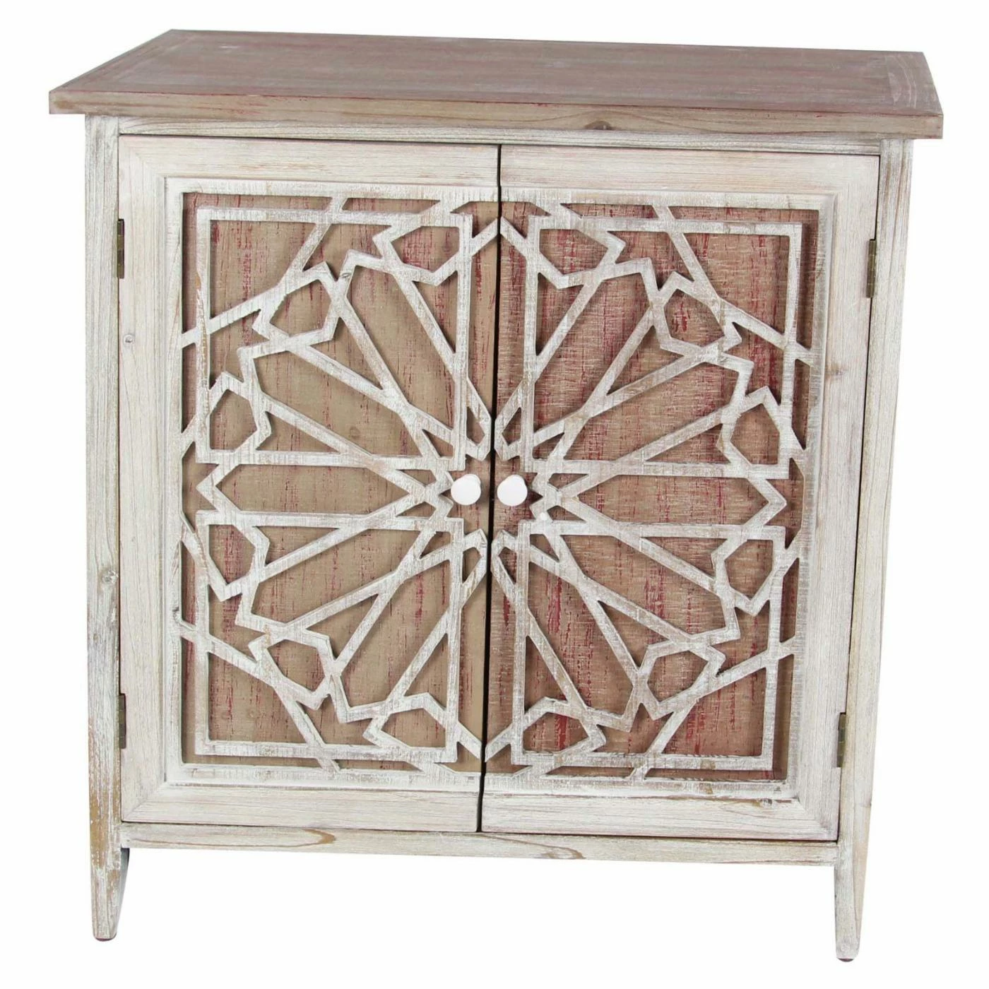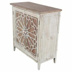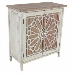 Embellished with a geometric overlay, the fetching DecMode Farmhouse 2 Door Decorative Chest adds a touch of elegance to country interiors while providing practical storage space. The chest is produced out of solid red pine and Chinese fir wood for lasting durability. Each of the doors is equipped with a petite white handle for easy opening. Utilize the storage space to store odds and ends, napkins, books, and more.