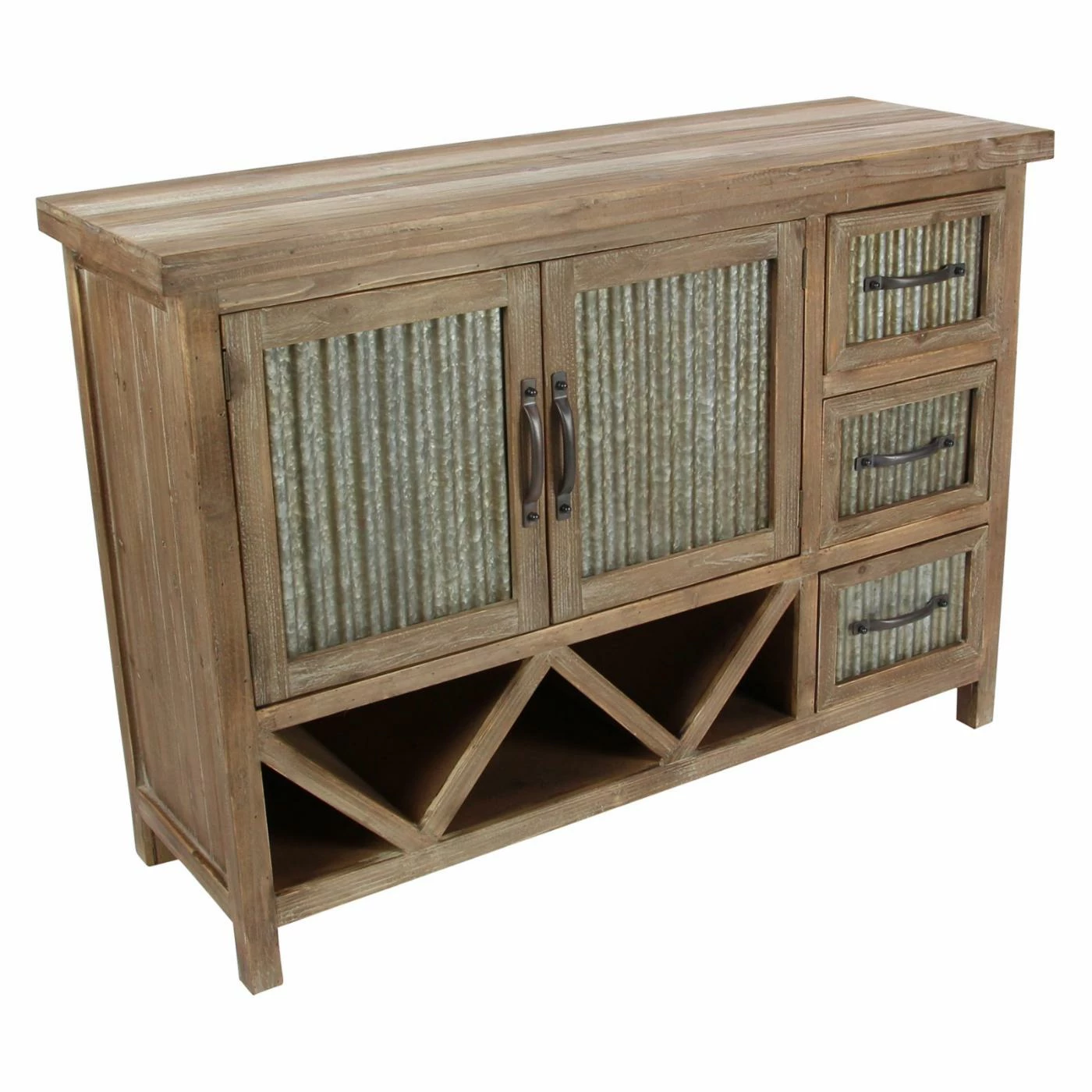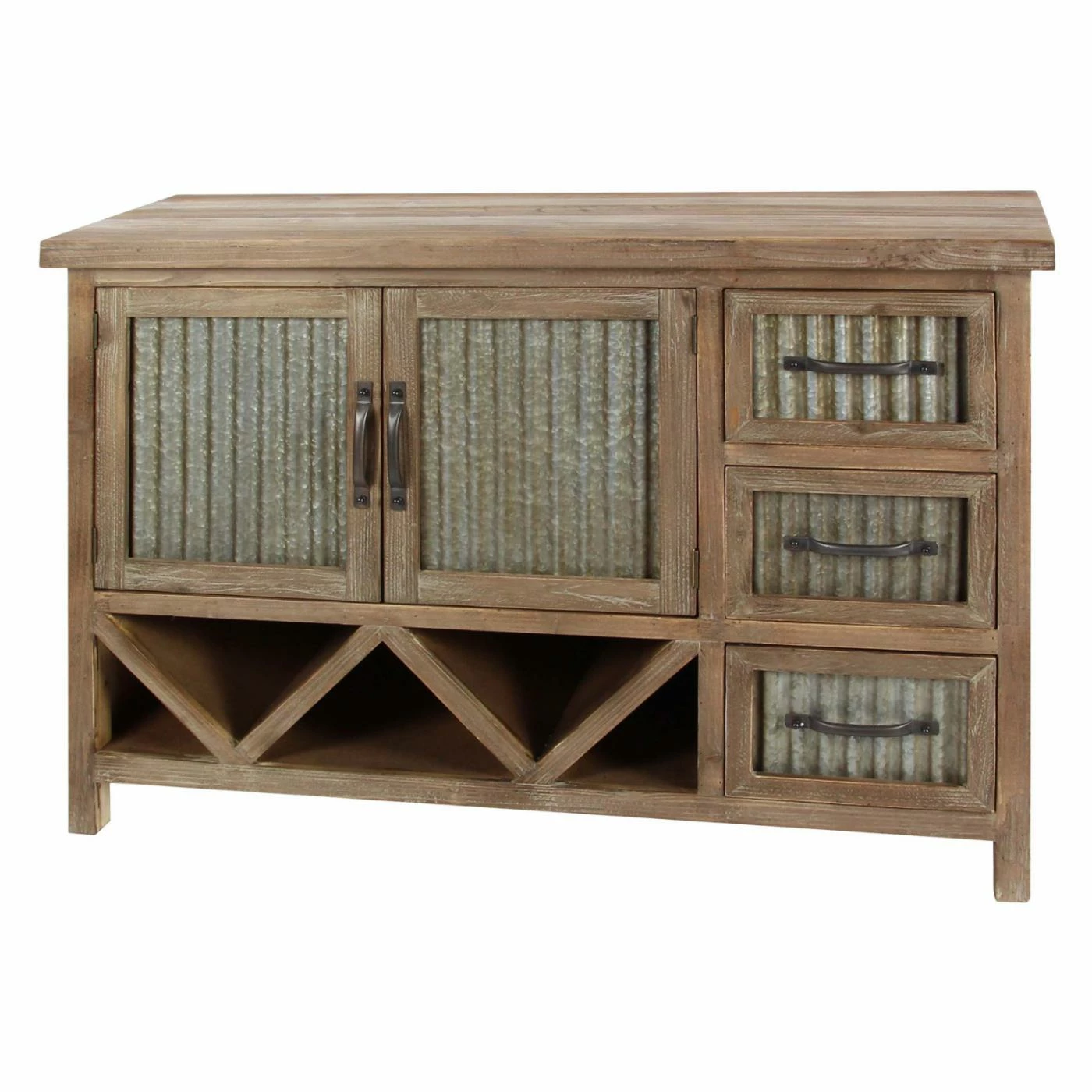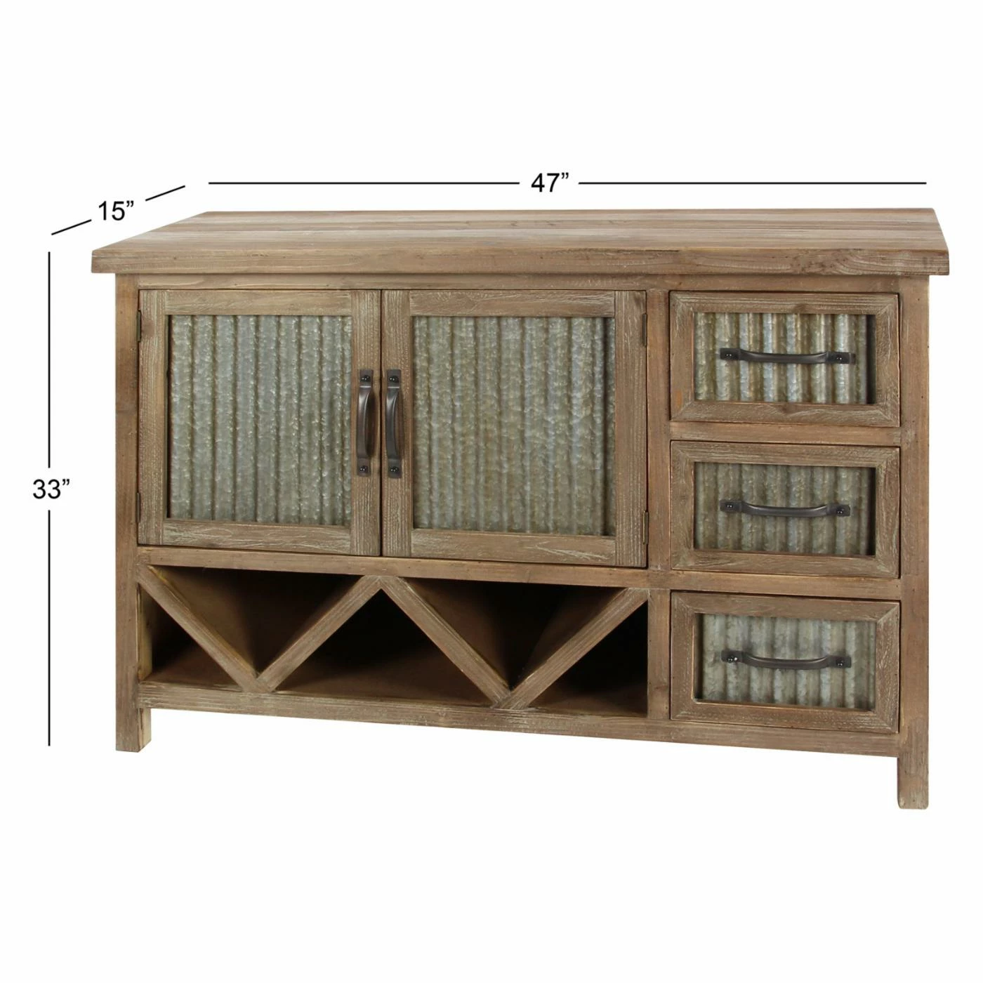 Corrugated aluminum panels and a weathered brown finish give the DecMode Farmhouse Accent Cabinet its rustic appeal, and smart storage features make it practical. To make it ideal for your dining room, this accent cabinet includes fixed V-shaped wine storage, open storage space behind its two doors, and three side drawers. Use it to store your bar or dining pieces.
