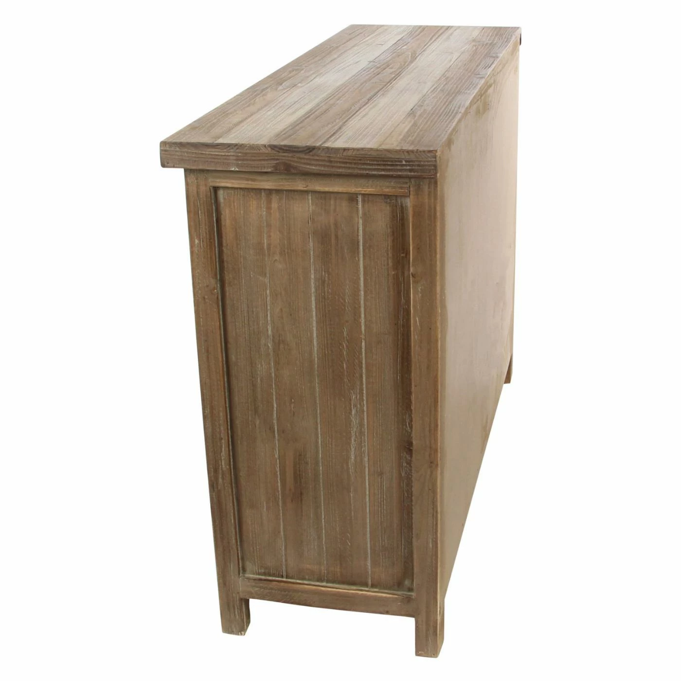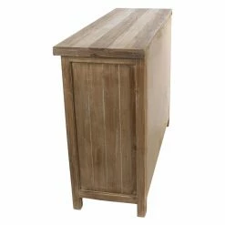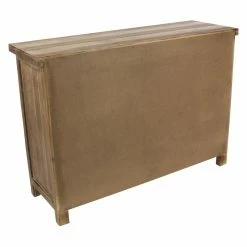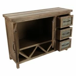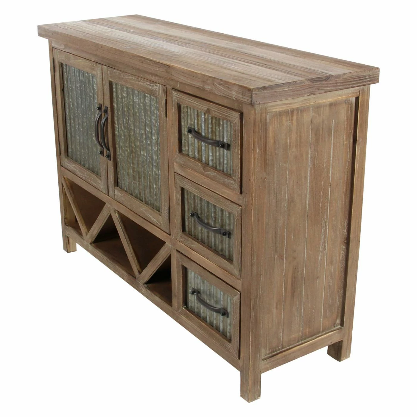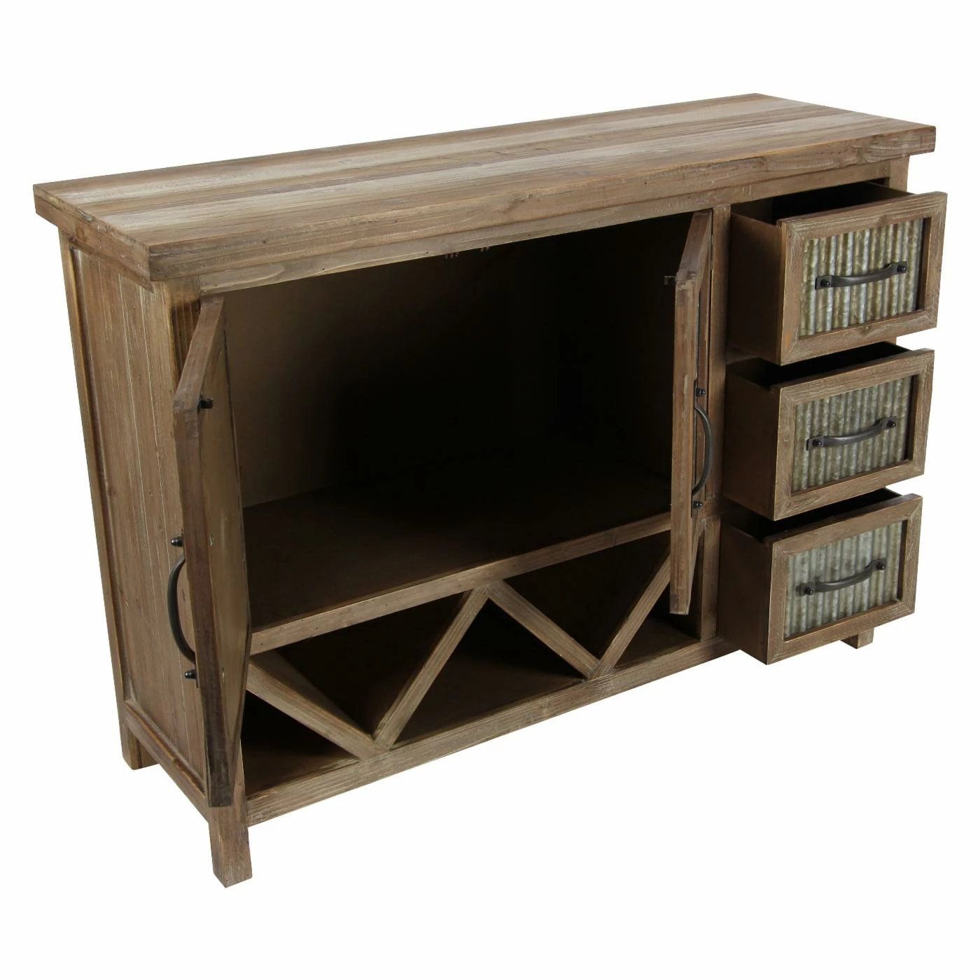 Corrugated aluminum panels and a weathered brown finish give the DecMode Farmhouse Accent Cabinet its rustic appeal, and smart storage features make it practical. To make it ideal for your dining room, this accent cabinet includes fixed V-shaped wine storage, open storage space behind its two doors, and three side drawers. Use it to store your bar or dining pieces.