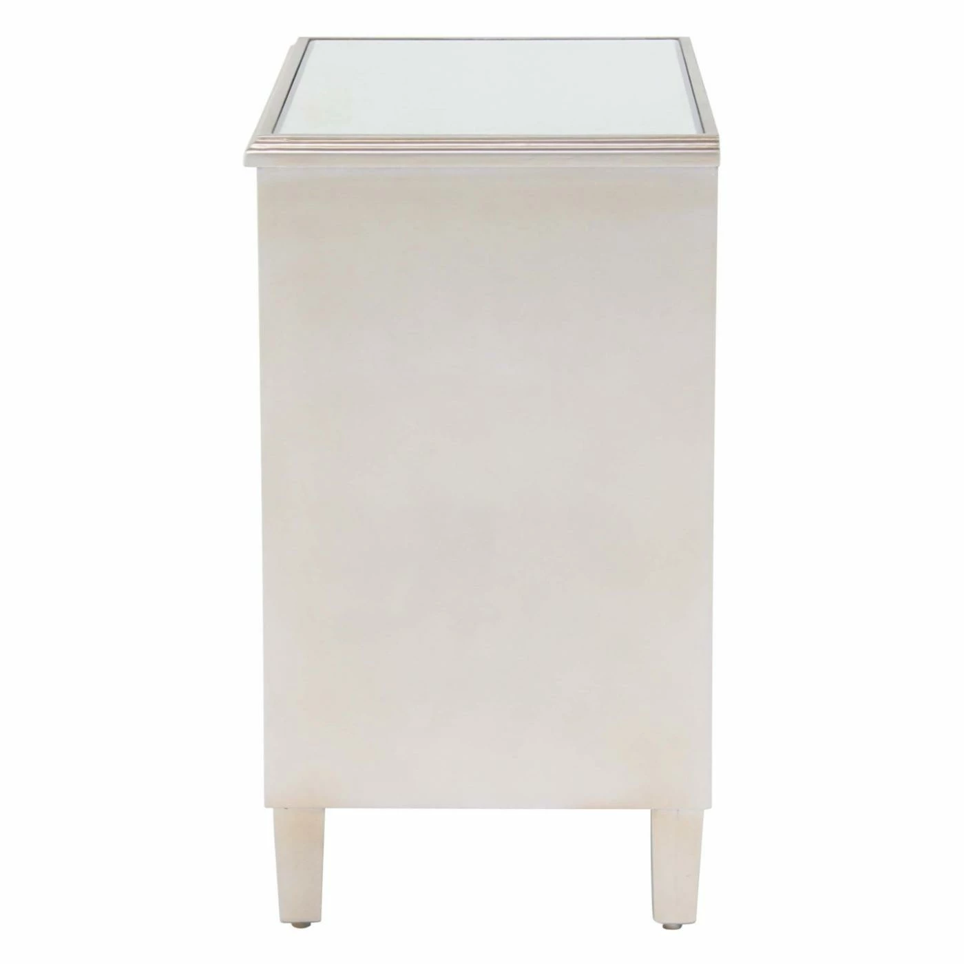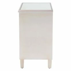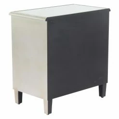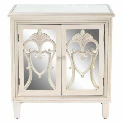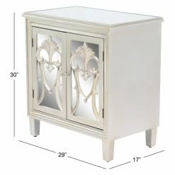 The DecMode Modern 2 Door Wood and Mirror Carved Filigree Cabinet impresses with intricate craftsmanship and impressive storage capability. It’s crafted of fir wood and engineered wood in a white finish. Mirrored glass panels rest under carved filigree overlays for maximum visual appeal. The doors open to reveal a roomy storage compartment for household items.