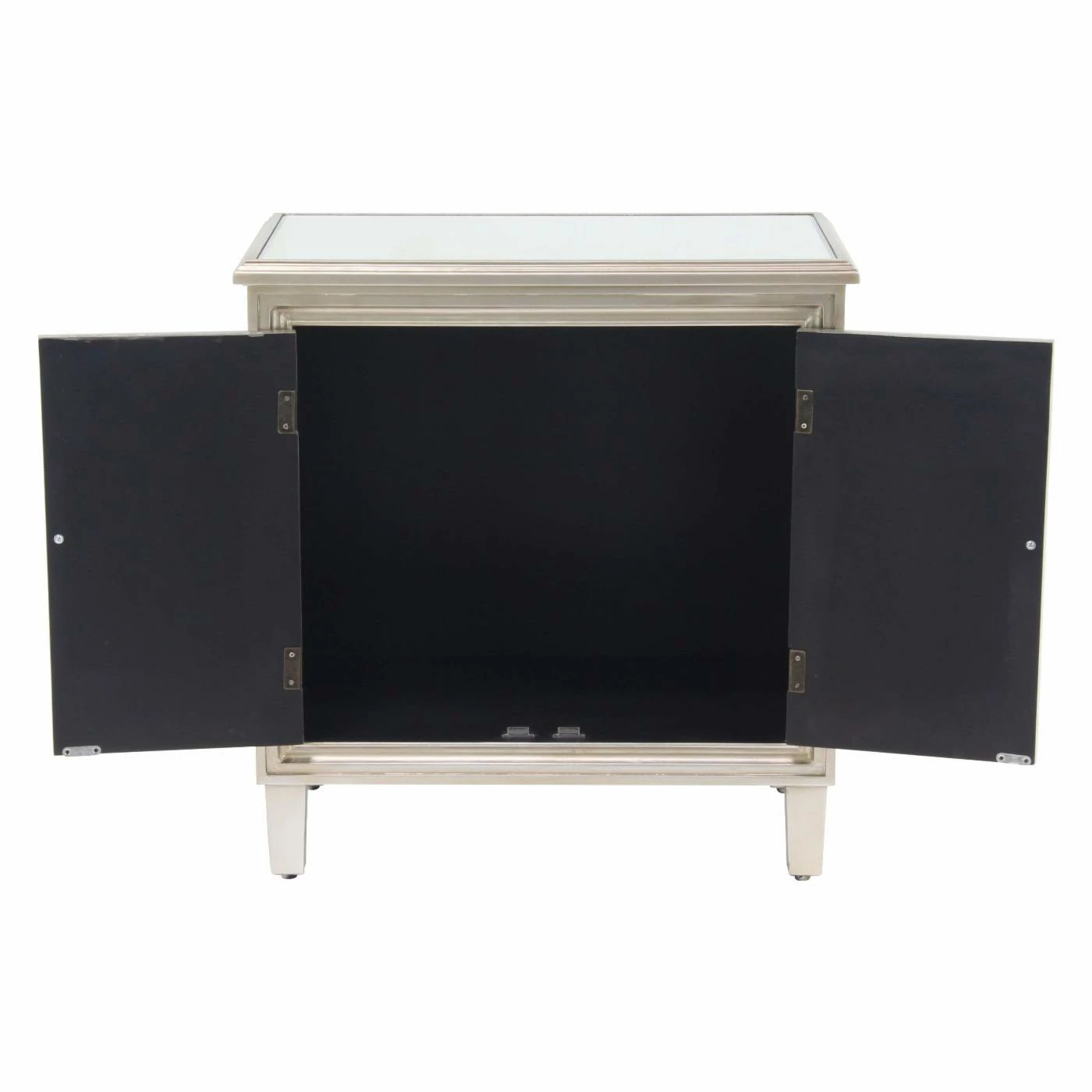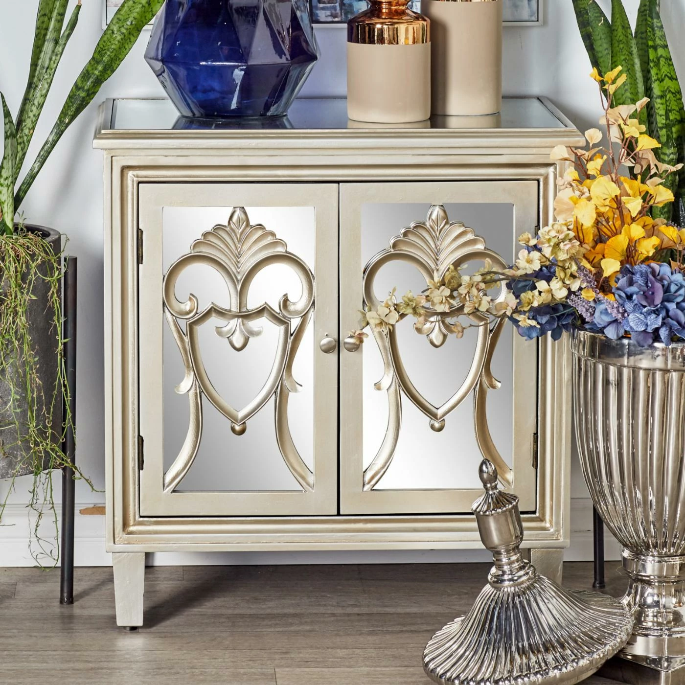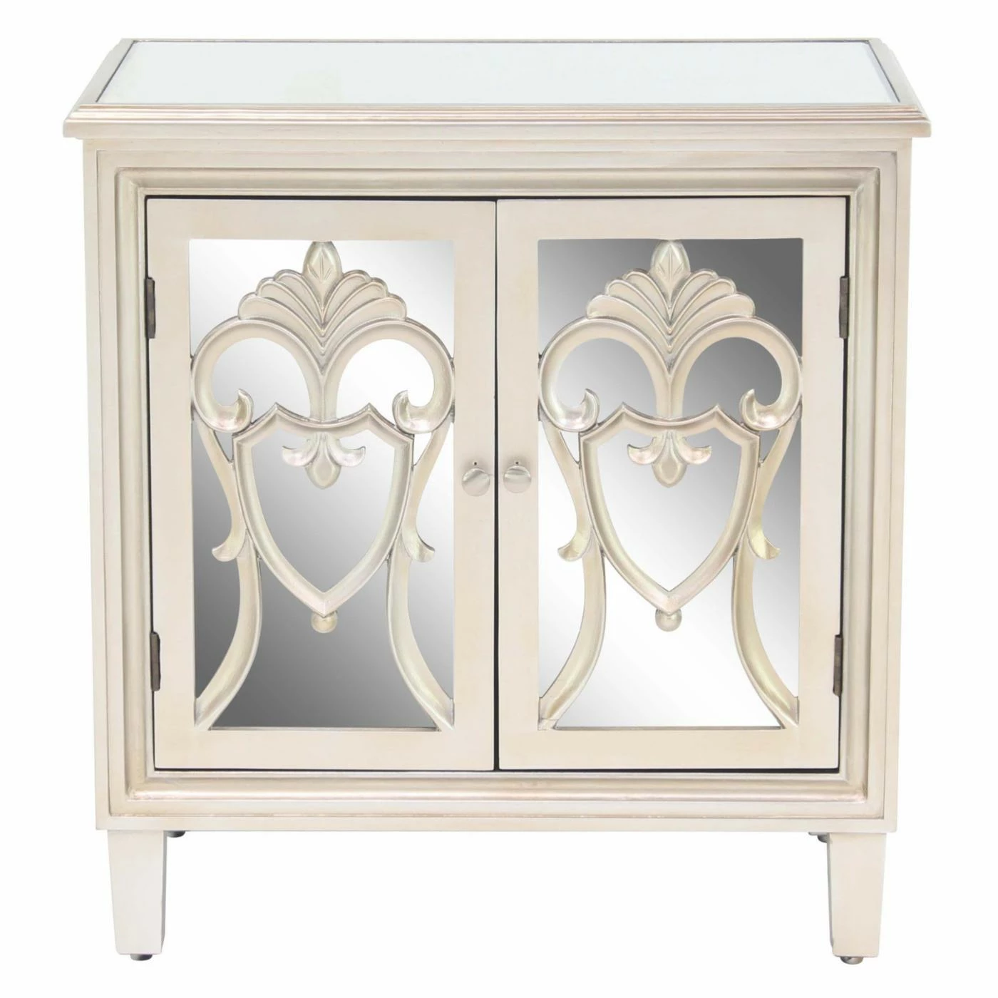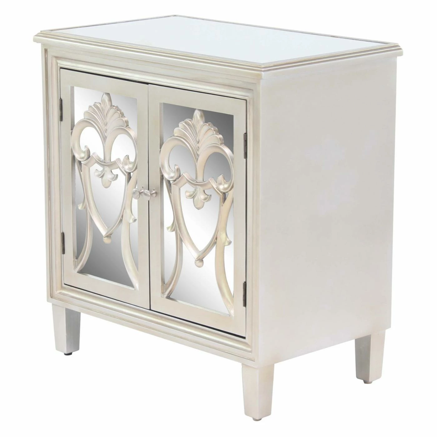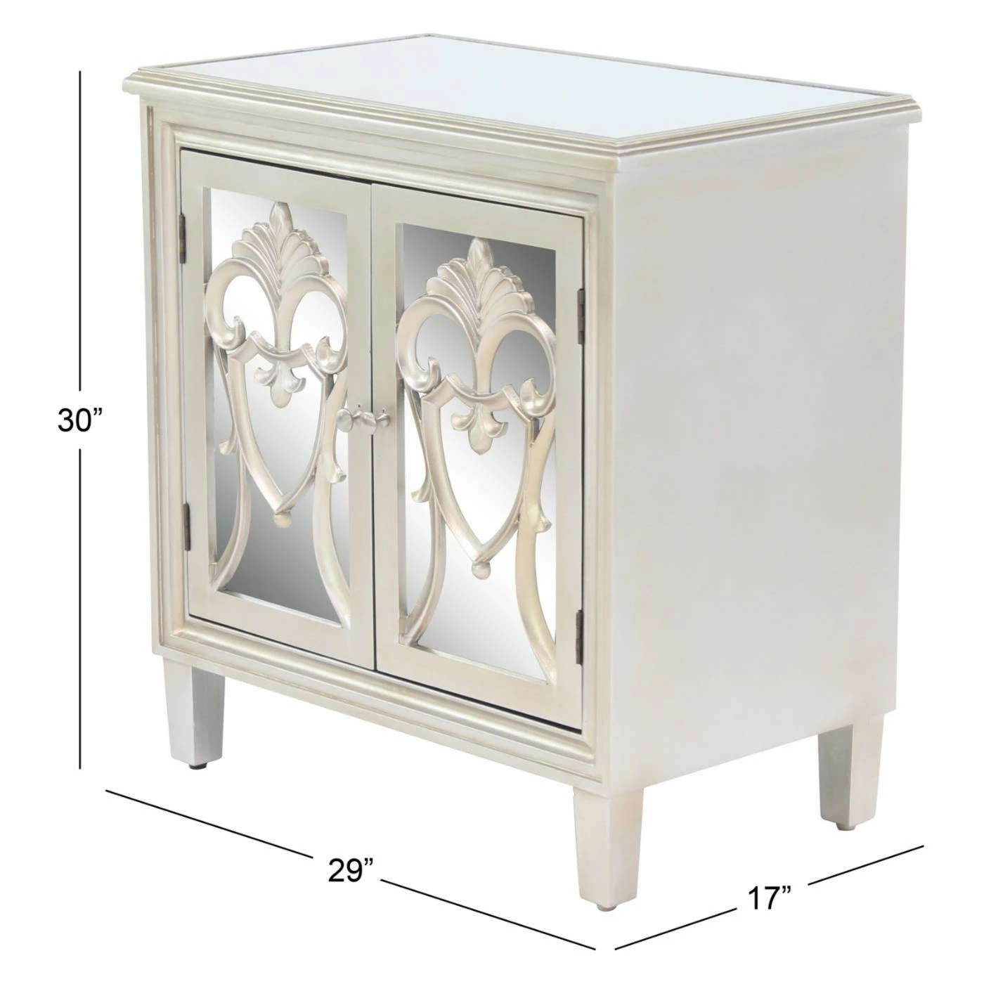 - 3 cabinet doors with inlaid mirror and filigree overlay