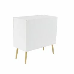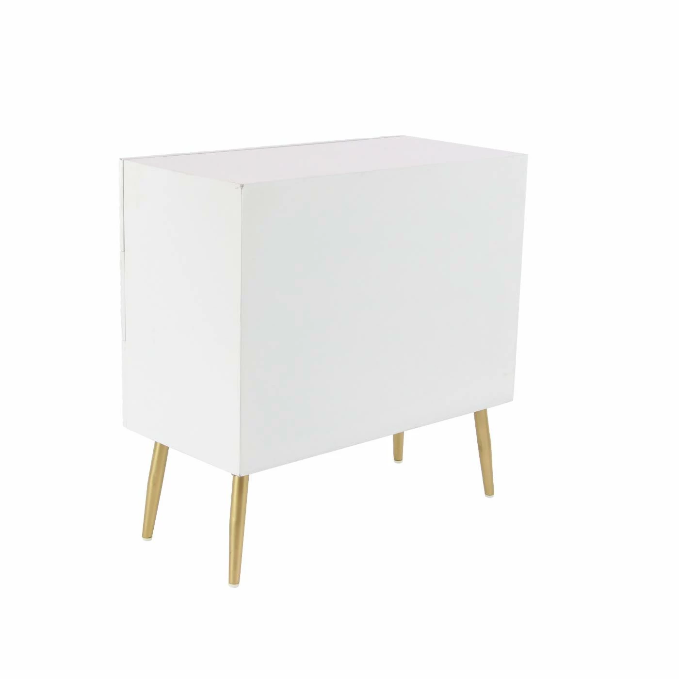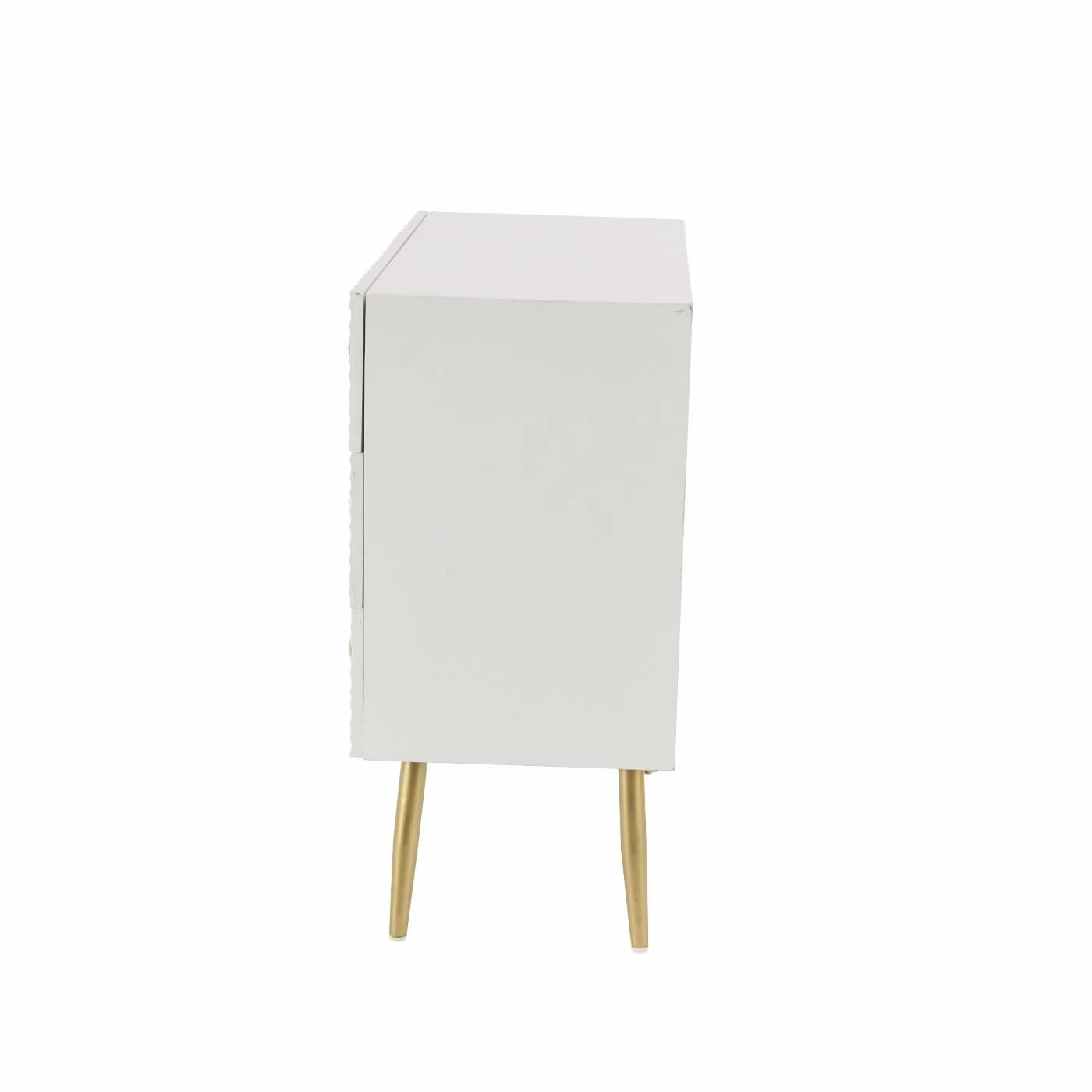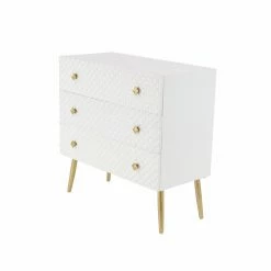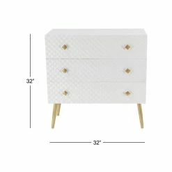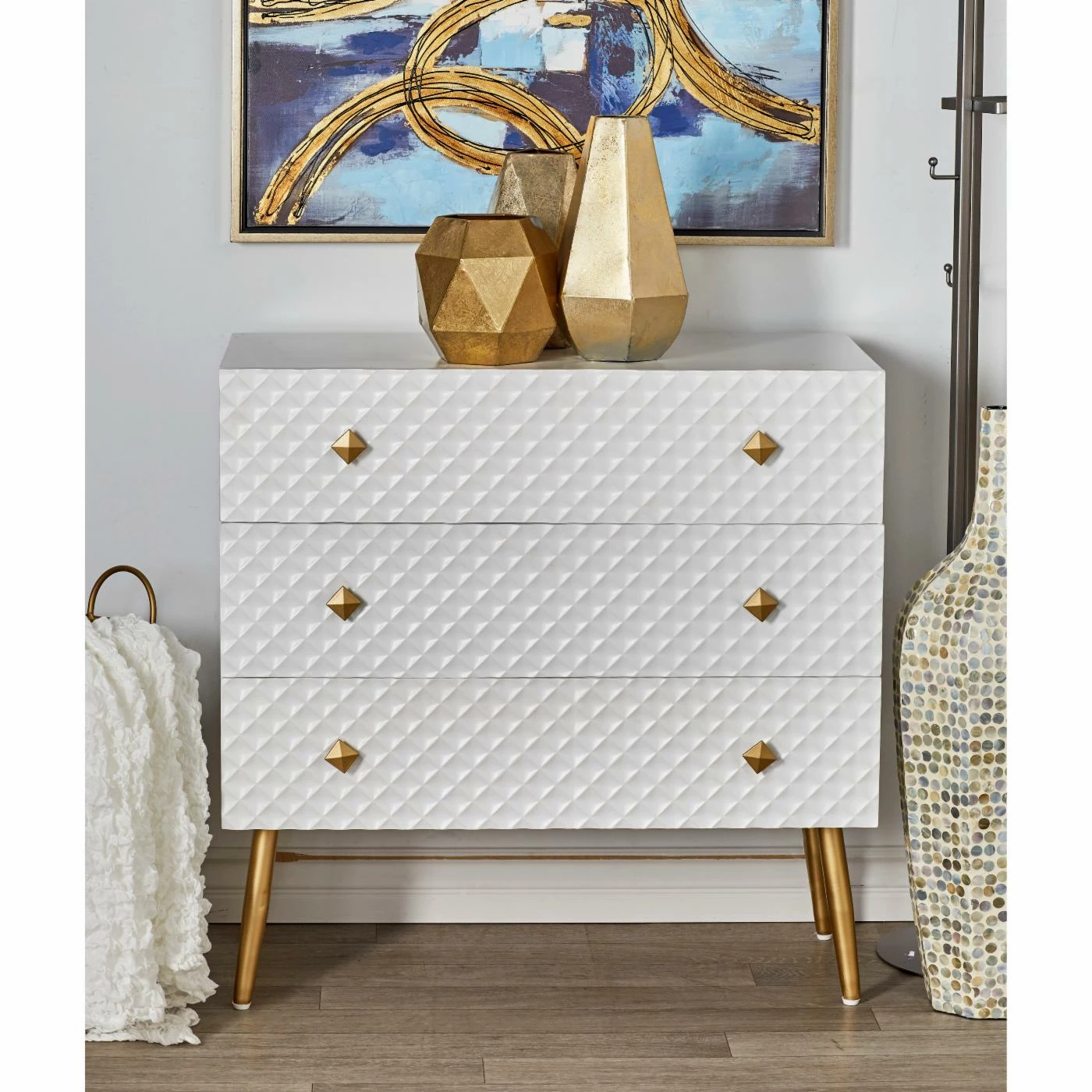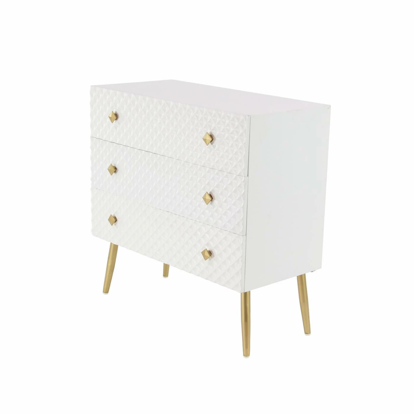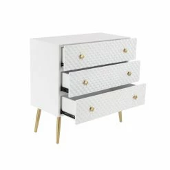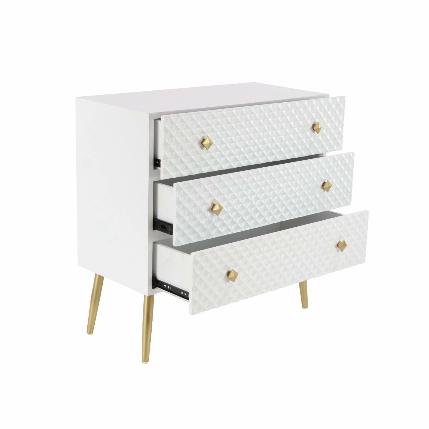 - Features three slide-out drawers with embossedcriss-cross pattern and diamond-shaped gold-finished handles