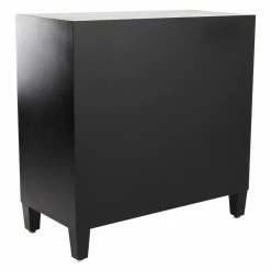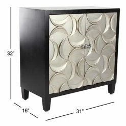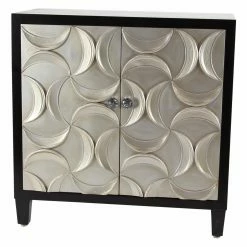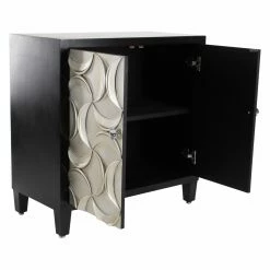 A tuxedo black finish makes the DecMode Modern Wood and stainless steel 2 Door Cabinet a designer addition to any room. Elevated crescent moons in a luxe silver finish add a modern shimmer to this cabinet. Open the two stainless steel doors to find interior shelving, making the cabinet ideal for organizing serving pieces, linens, and more.