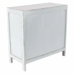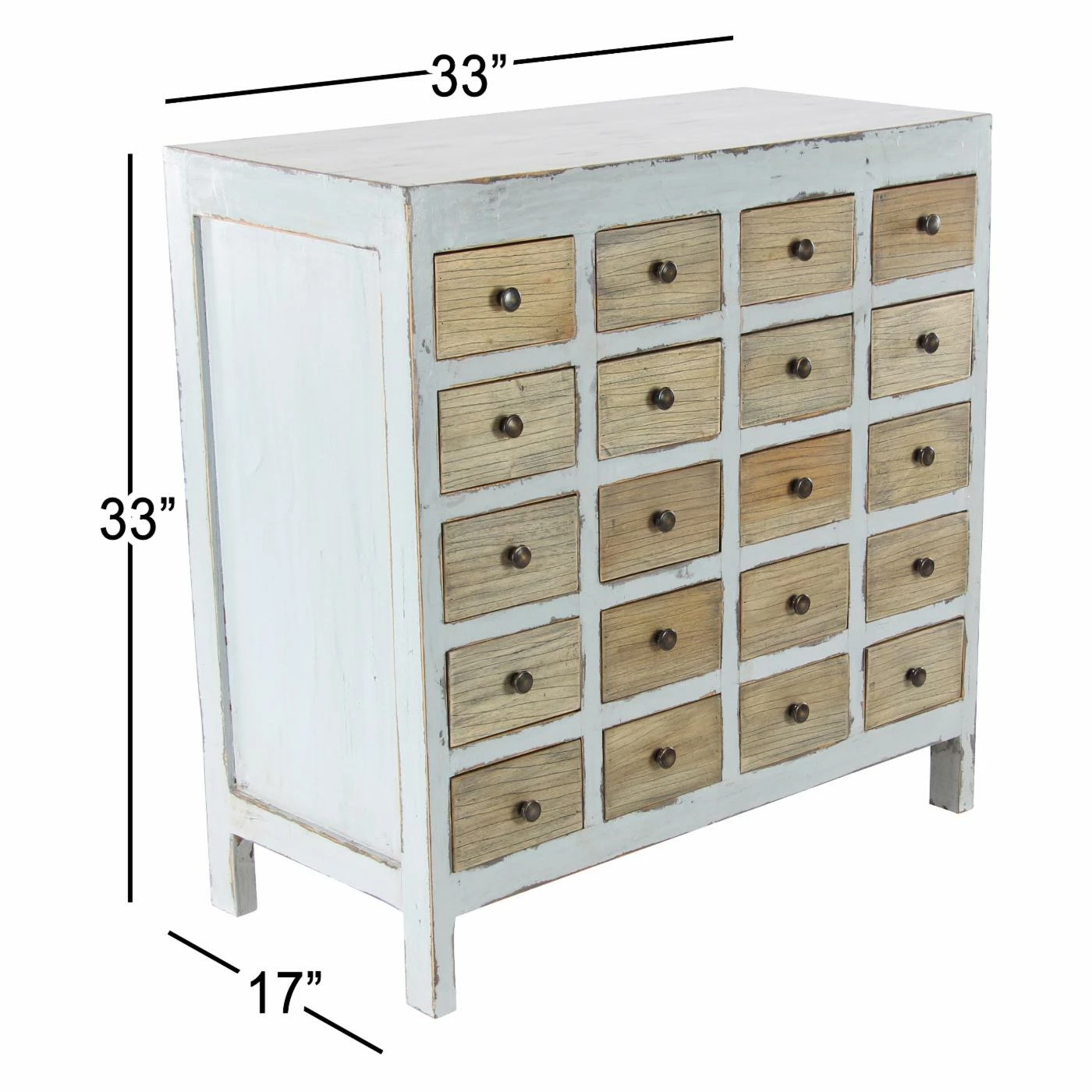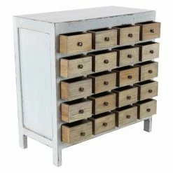 The DecMode Rustic 20 Drawer Mahogany Wood Chest Cabinet conveys rustic charm with natural-finished drawers and distressed detailing. It features the look of an old-time card catalog with twenty small drawers, each with a round, brass knob.