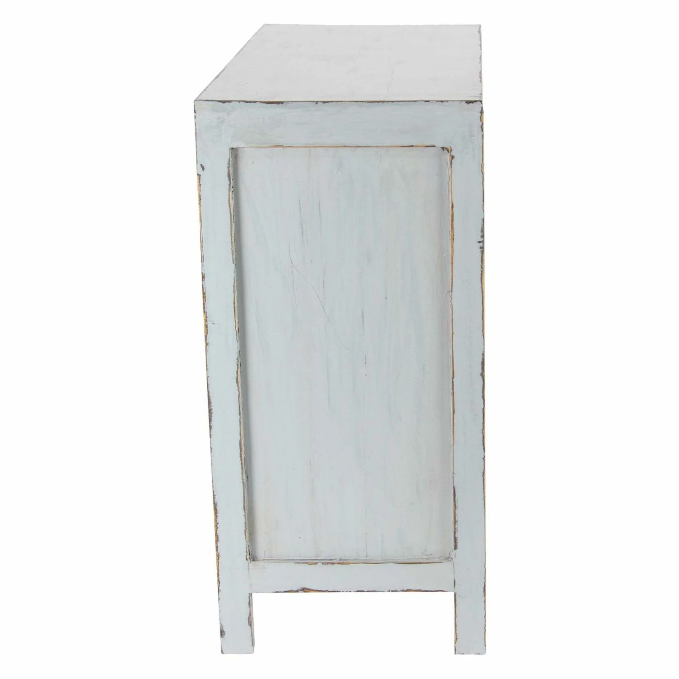 - Features distressed brown and natural finishes