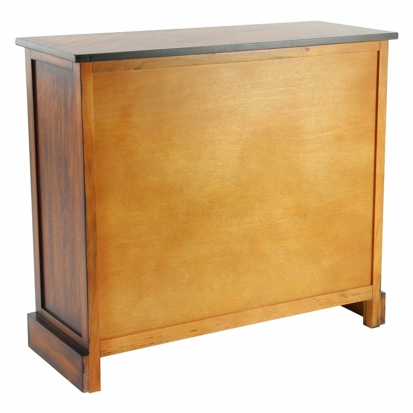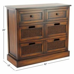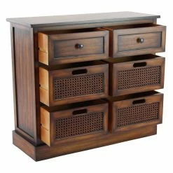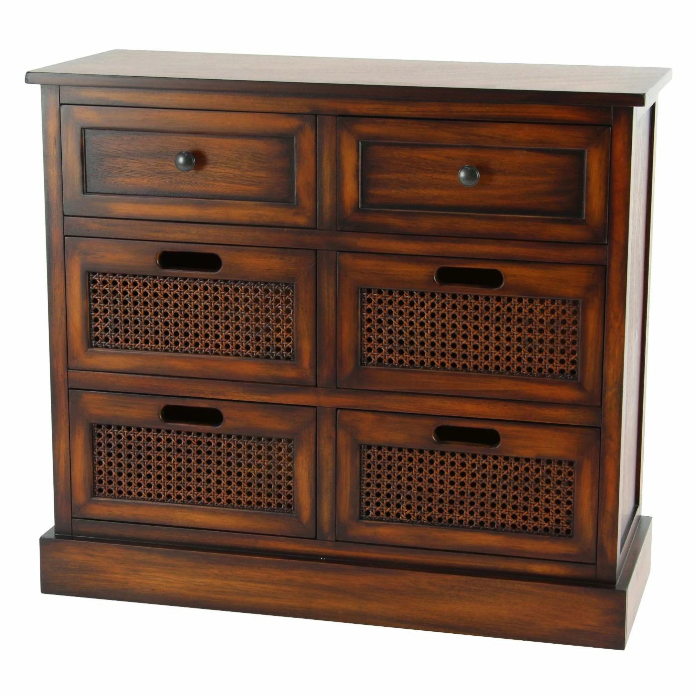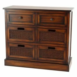 - Features a 3-tiered side chest with 6 drawers in stained brown finish