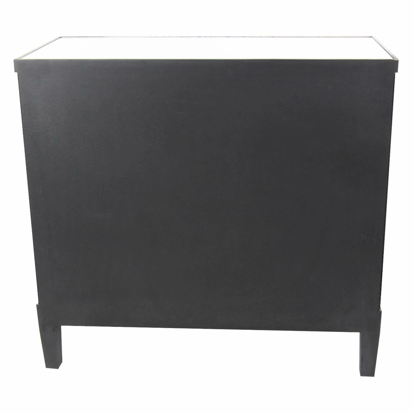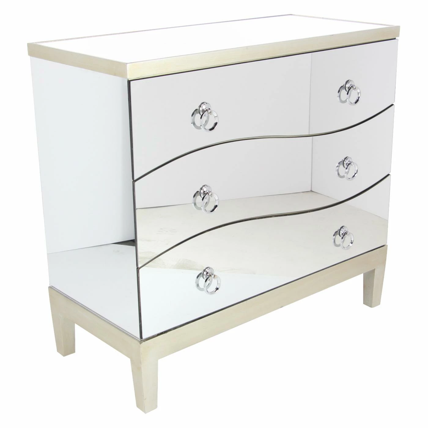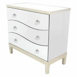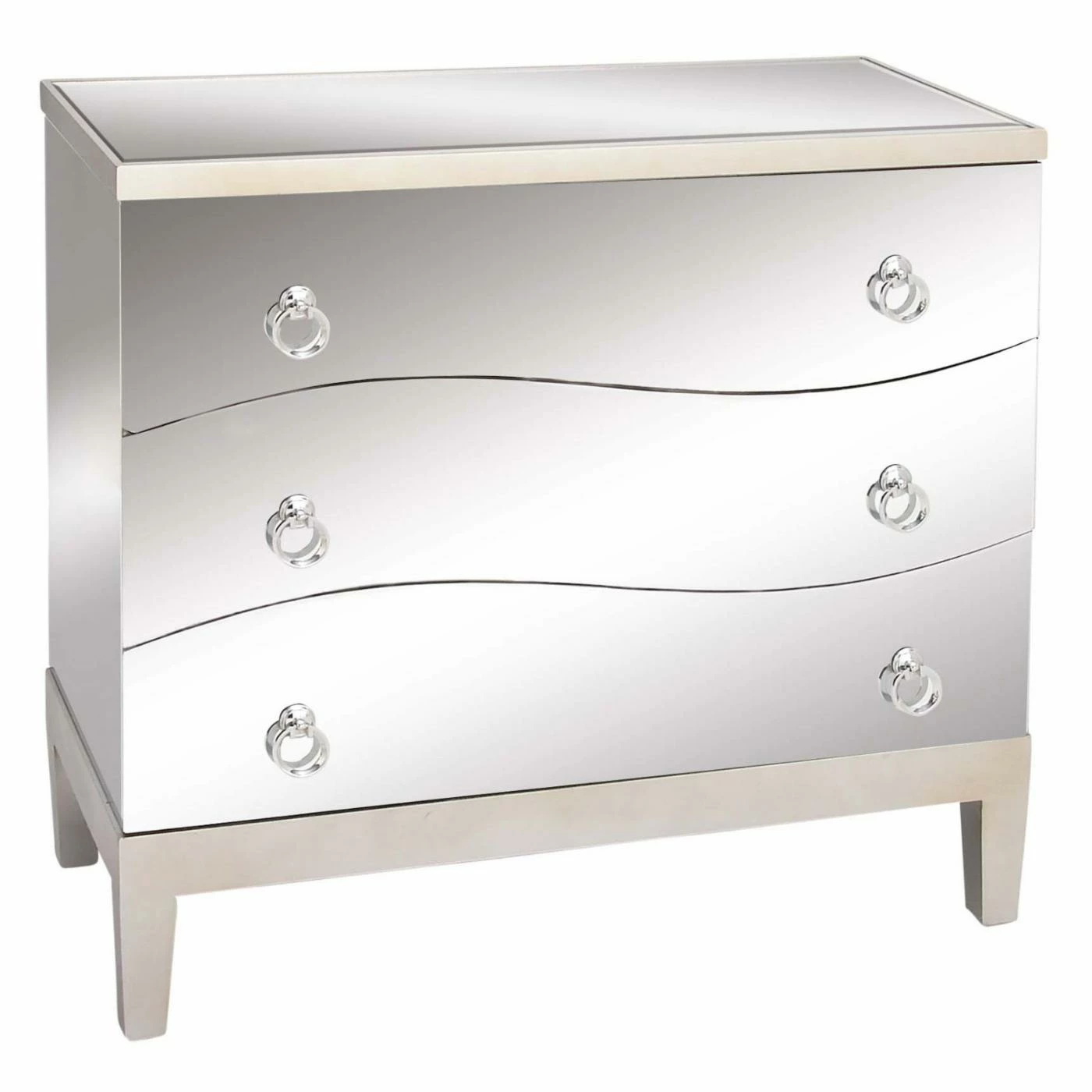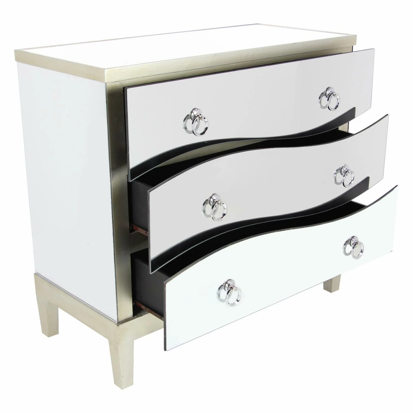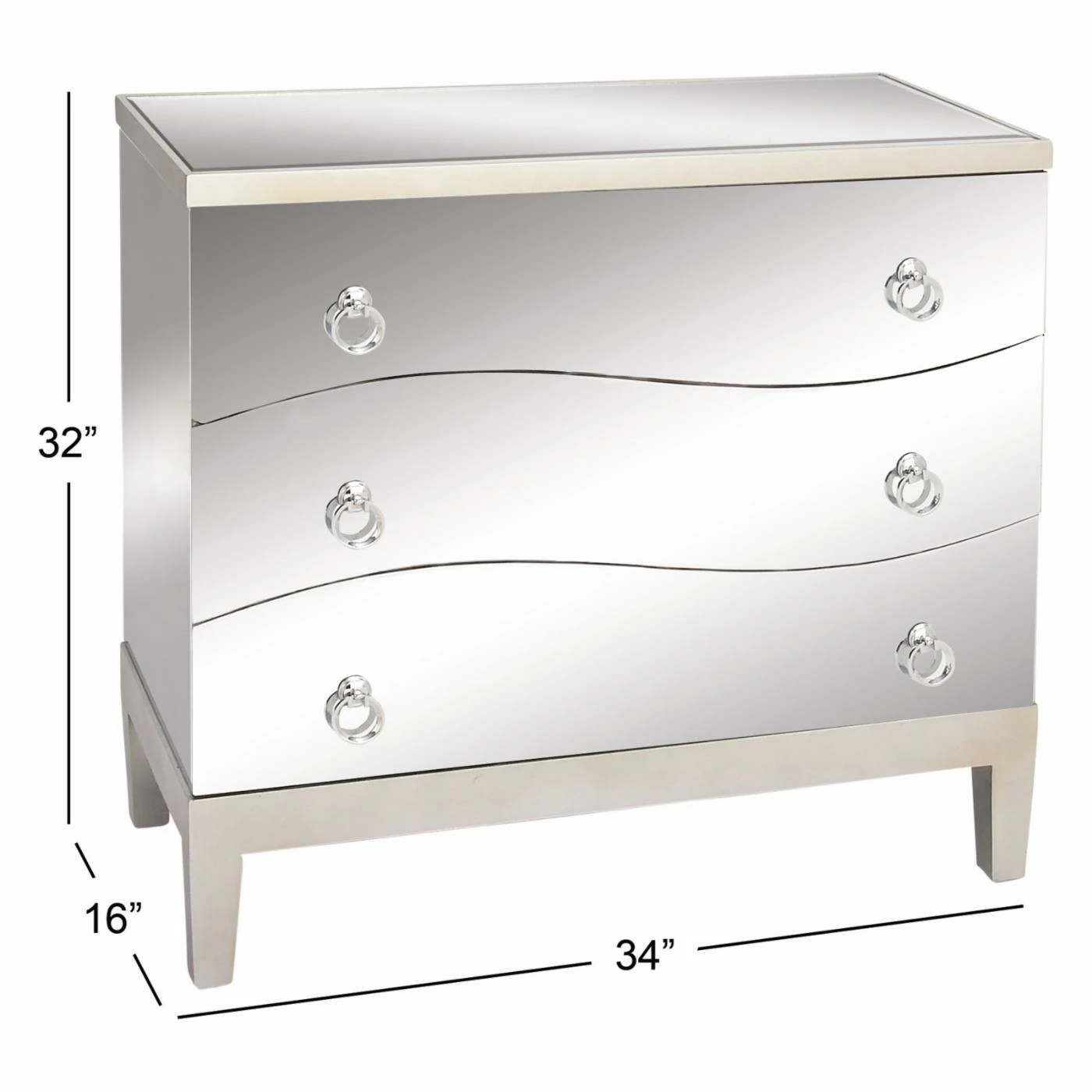 Gleaming mirrors finish the top and sides of the DecMode Sophisticated Mirror Rectangular Chest with dramatic flair. The three wave-styled drawers give you room to get organized. Chinese fir and engineered wood construction promise lasting durability and quality. White finishing completes this chest with bright detail.