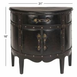 The demilune-shaped DecMode Wood and Faux Leather Cabinet is wrapped in faux leather and accented with nail head trim, buckles, and leatherette handles. This cabinet boasts a drawer and two cupboard doors.