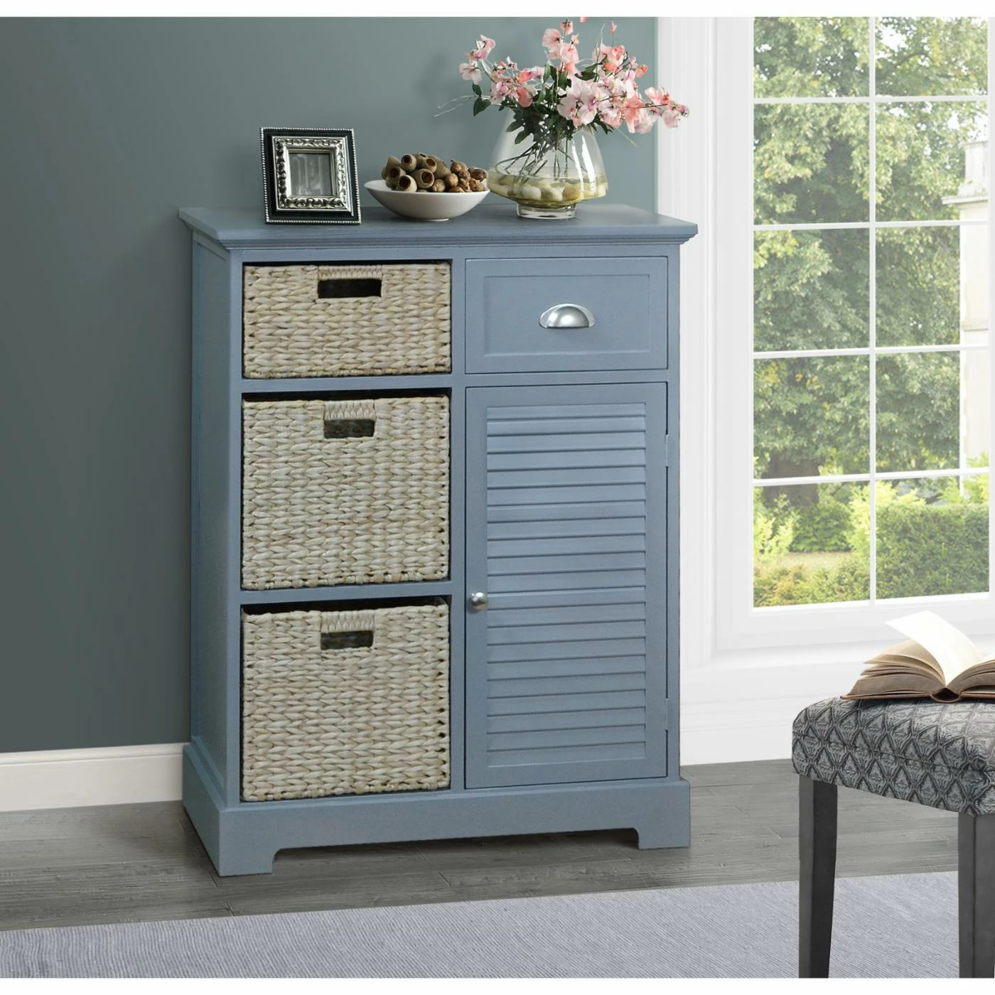 The charming Gallerie Decor Newport Four Drawer Cabinet – Gray is a stylish accent for your home. The table top provides a space for display, while four drawers and a cabinet offer concealed storage. Storage options include three natural colored rush basket drawers, a traditional, framed wooden drawer featuring an apothecary-style handle, and a cabinet with a louver-style door and brushed chrome knob. Shelves in the cabinet help you to stay organized. This piece is crafted from solid pine, with a chic gray finish. No assembly required.