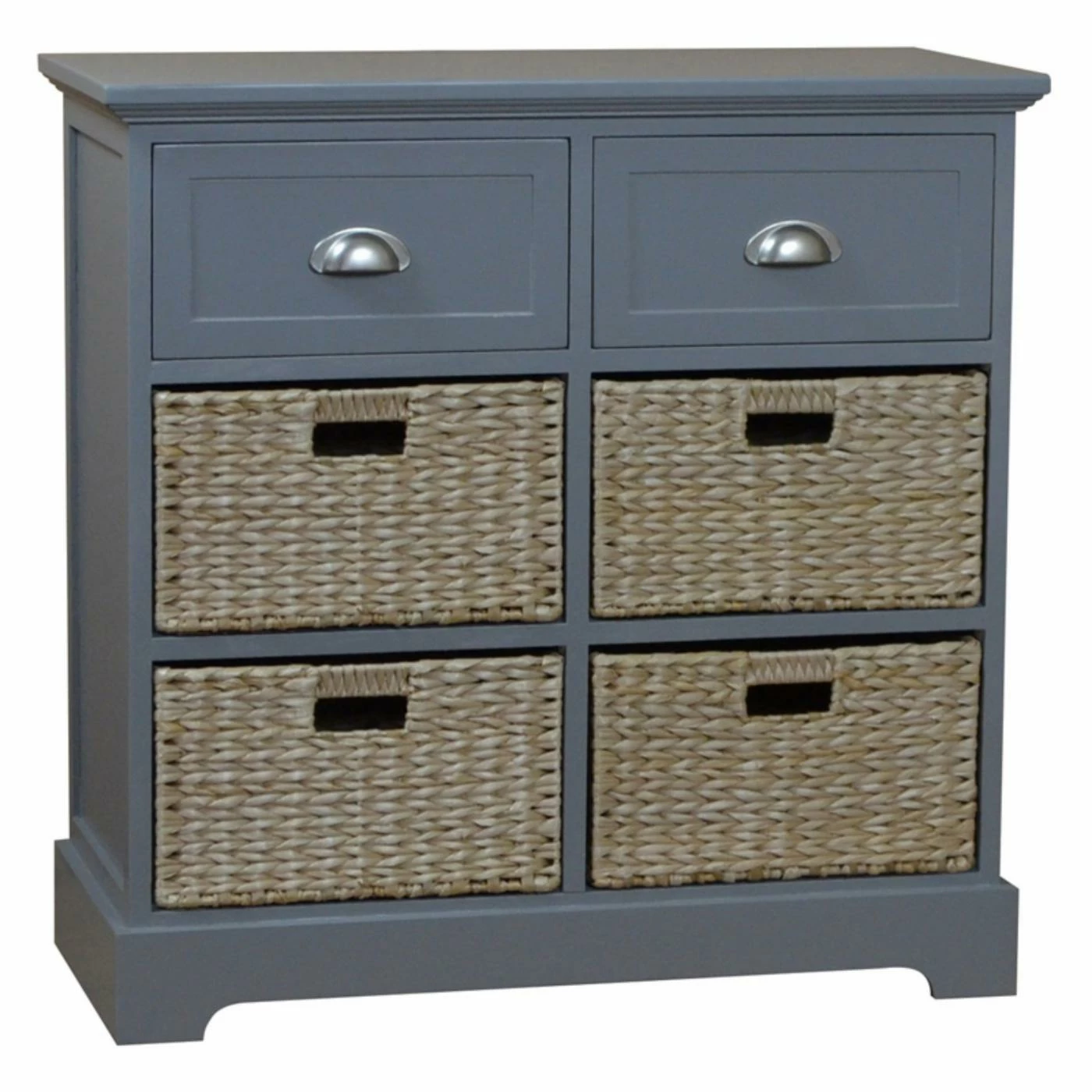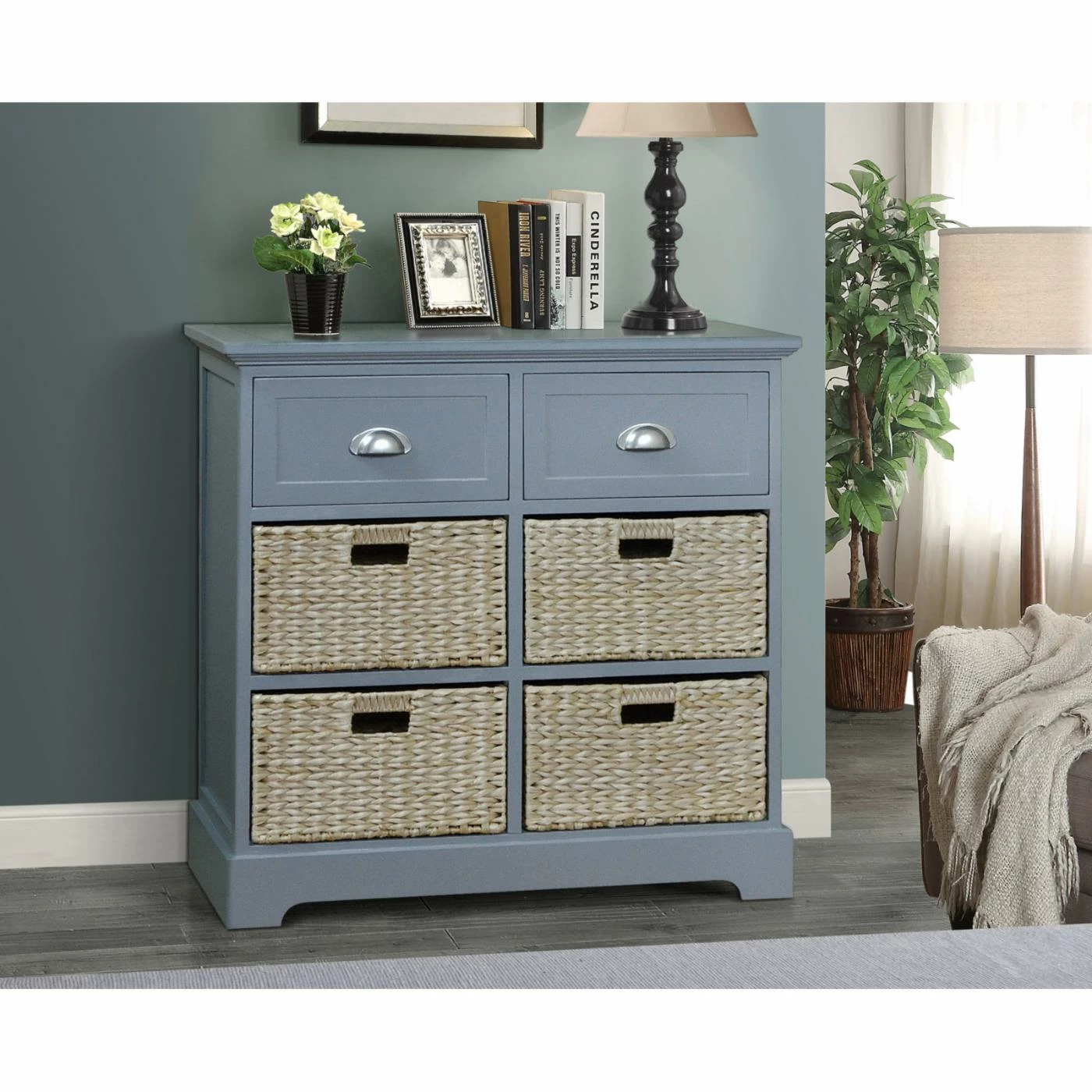 The Gallerie Decor Newport Six Drawer Chest โ Gray is an elegant piece for any room. Two side-by-side wooden drawers with a brushed chrome apothecary style handle, as well as four natural-colored rush basket drawers provide ample storage space. This sturdy chest is hand crafted from solid pine with a beautiful gray finish, making it a perfect, quality addition to any room in your house. No assembly required.