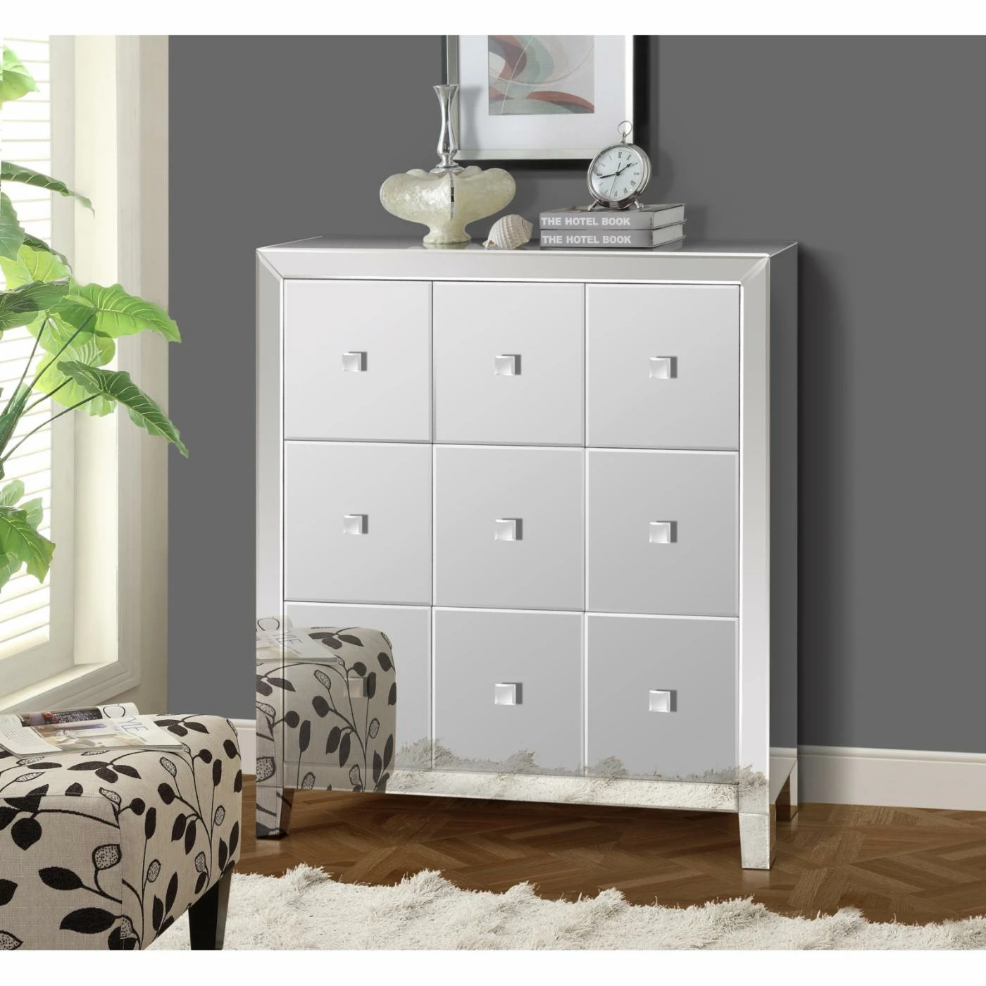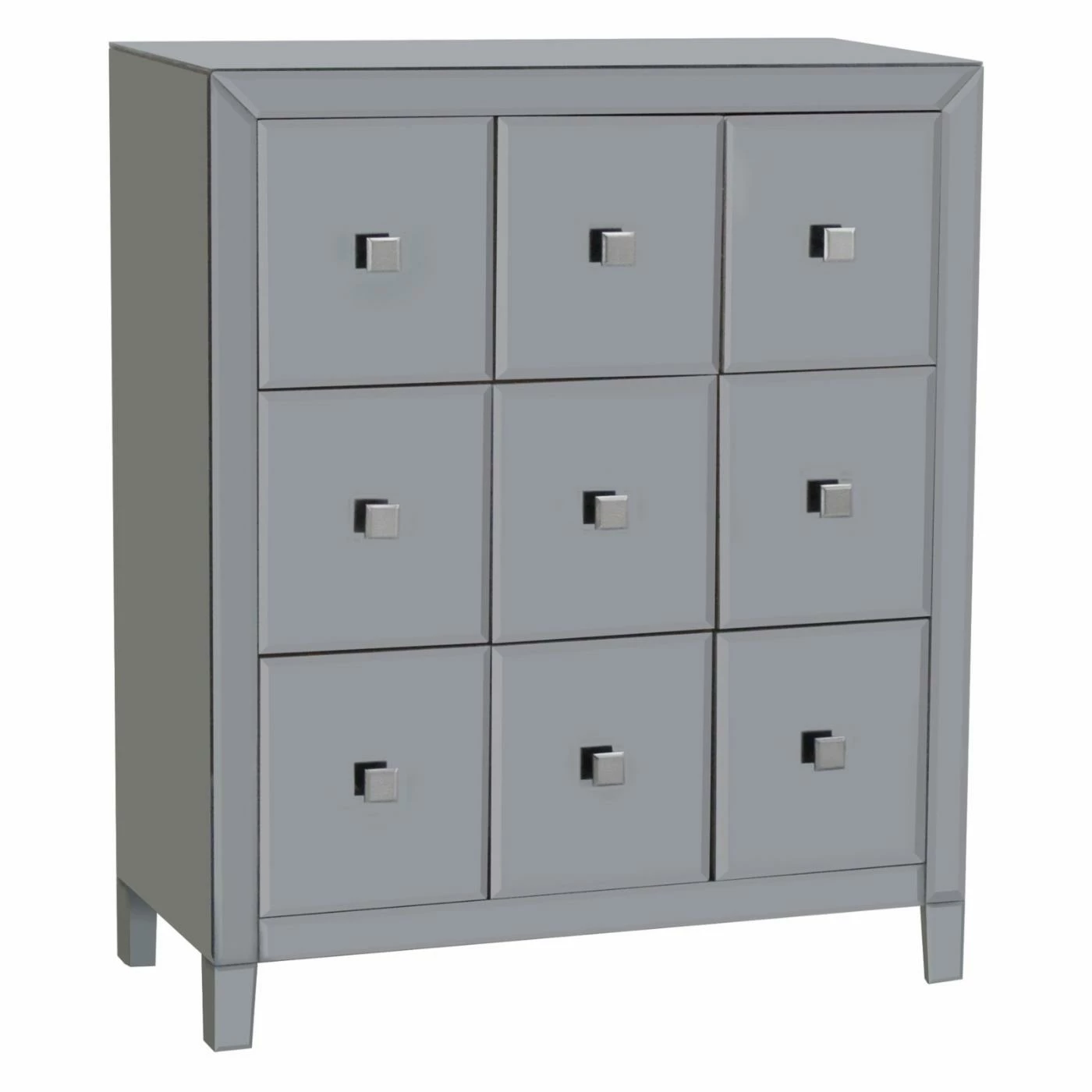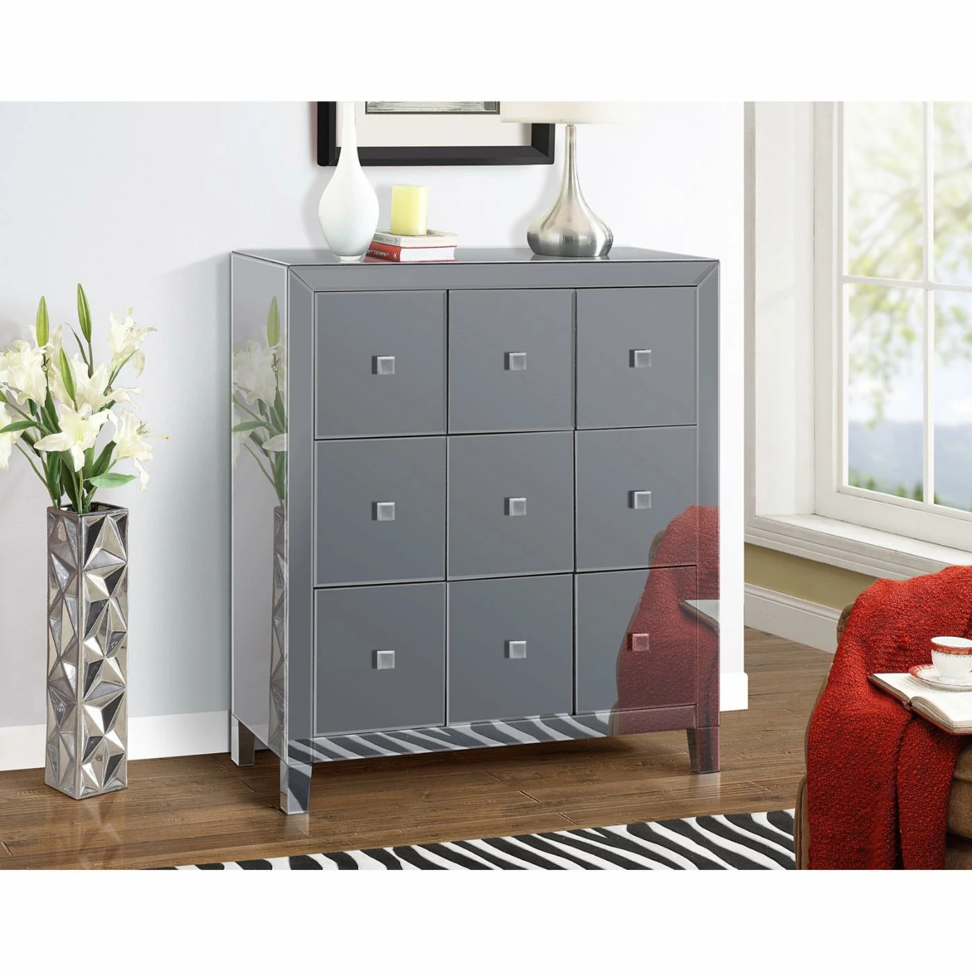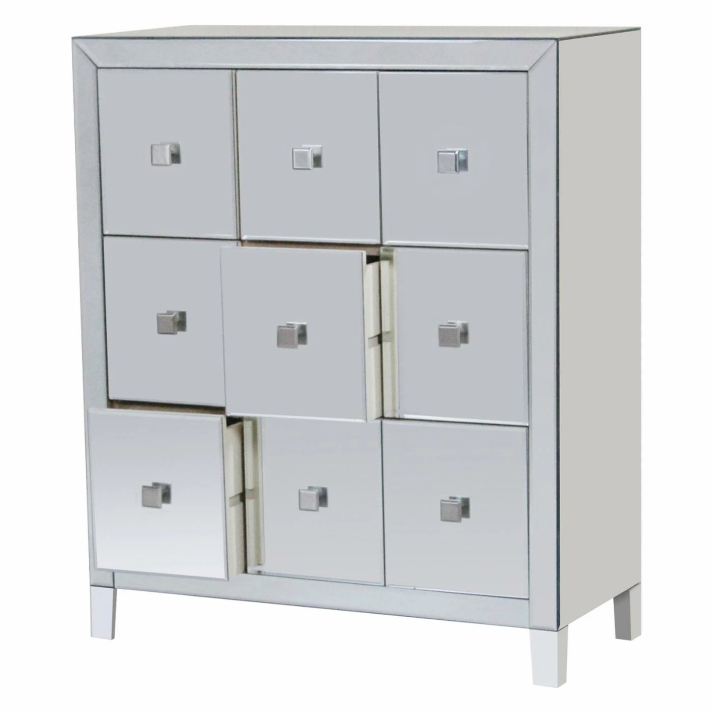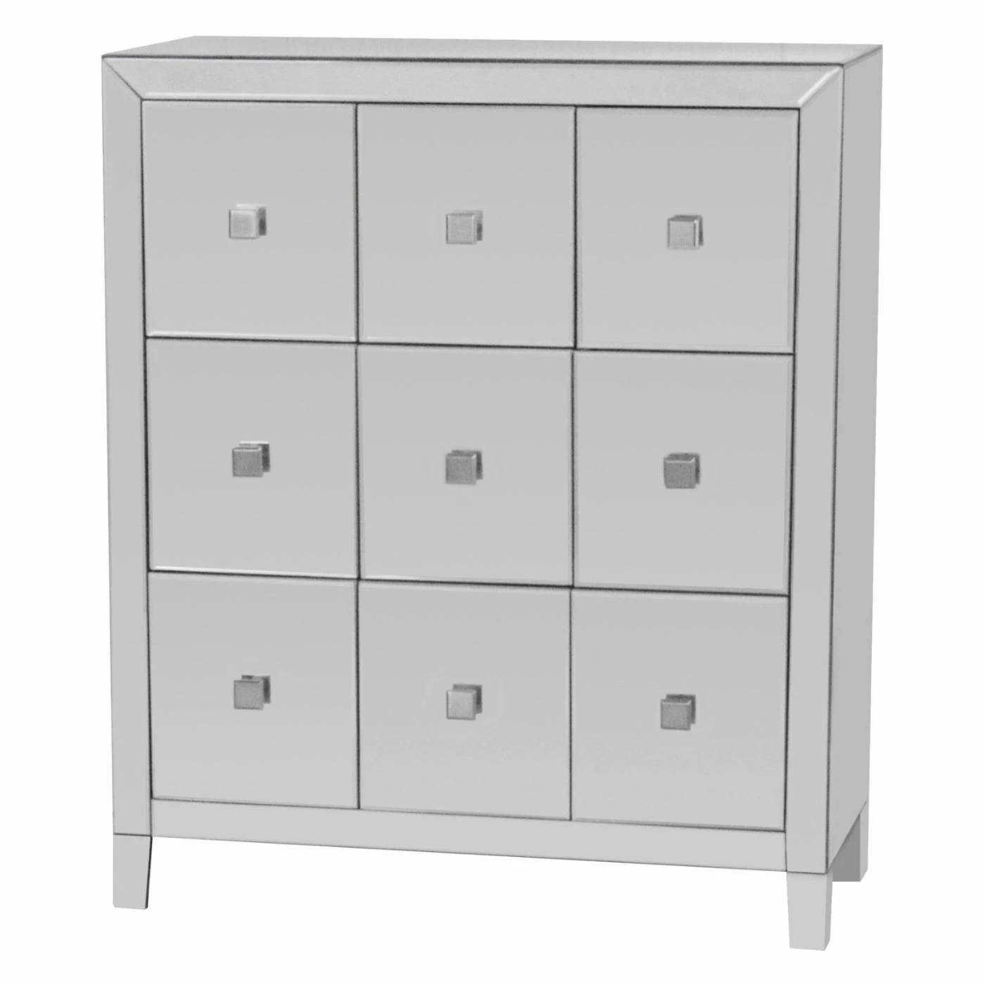 Glitz and glamor meet functionality in the Gallerie Decor Reflections Mirrored Multi Drawer Cabinet. With nine drawers and stylish beveled details, this end table or accent table is ideal for your bedroom, living room, or entryway. Who said organization couldn’t be beautiful?