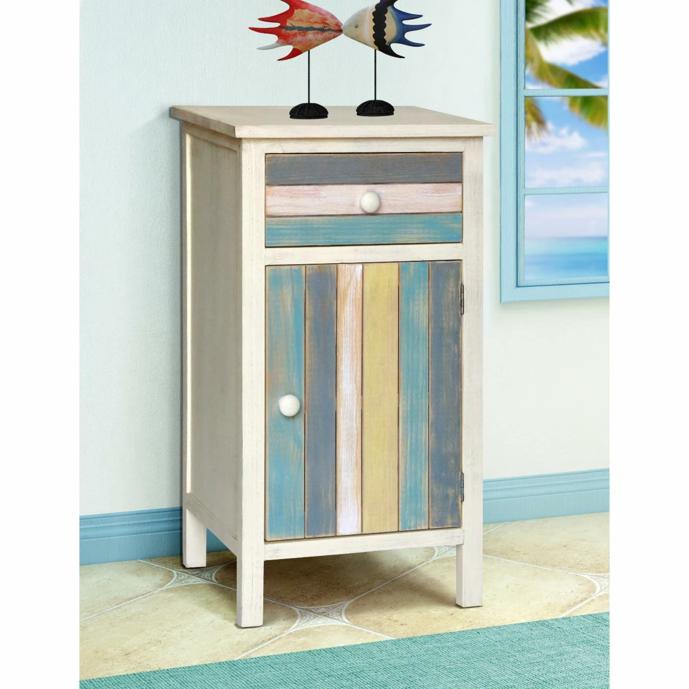 The stylish Gallerie Decor Seaside One Door Cabinet with Single Drawer brings that beach feeling right into your home. The door and drawer are hand crafted to create a plank look, and the soft tones of blue, gray, yellow, and white are reminiscent of the sand, surf, and sun. The cream colored body, wooden knobs, and distressed accenting complete the seaside look of this piece. The cabinet comes with a shelf for convenient and concealed storage. Arrives fully assembled.