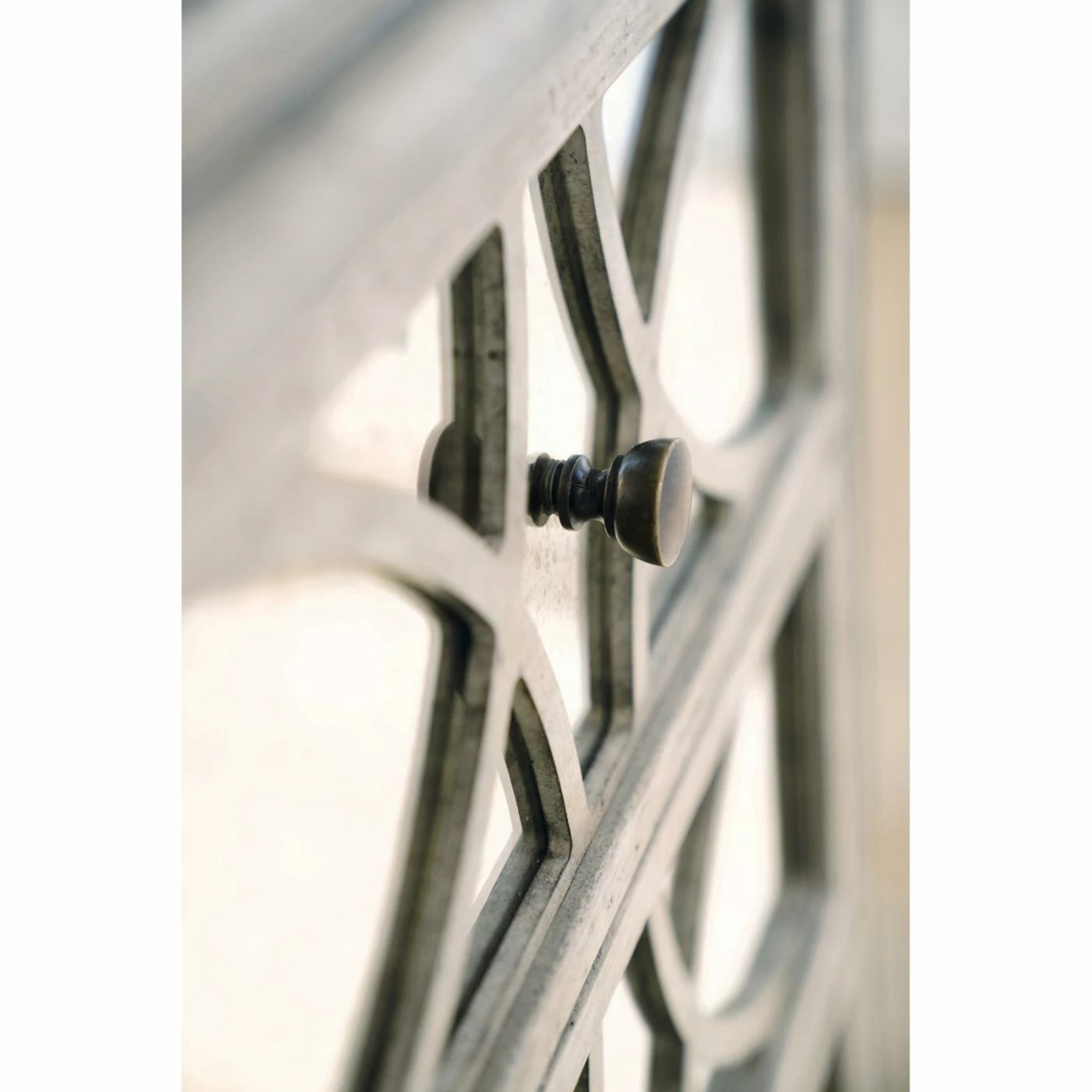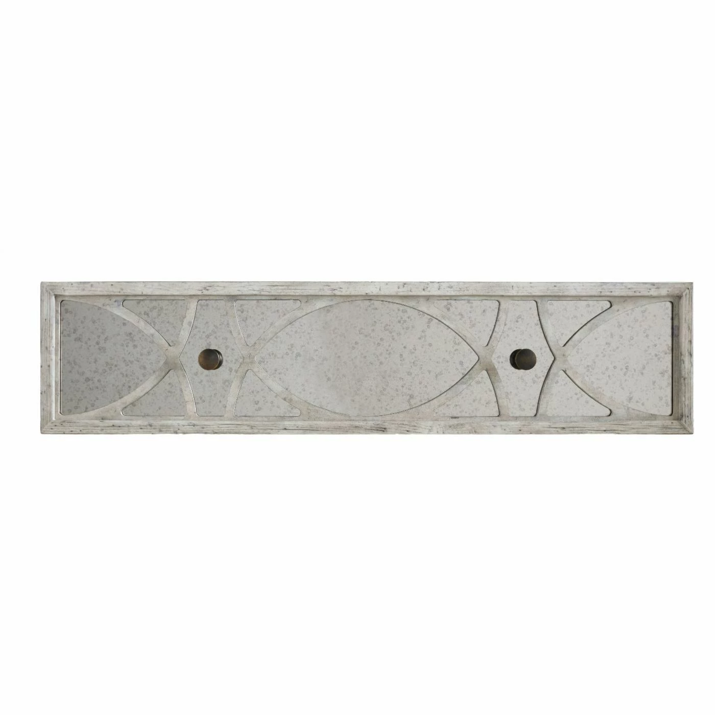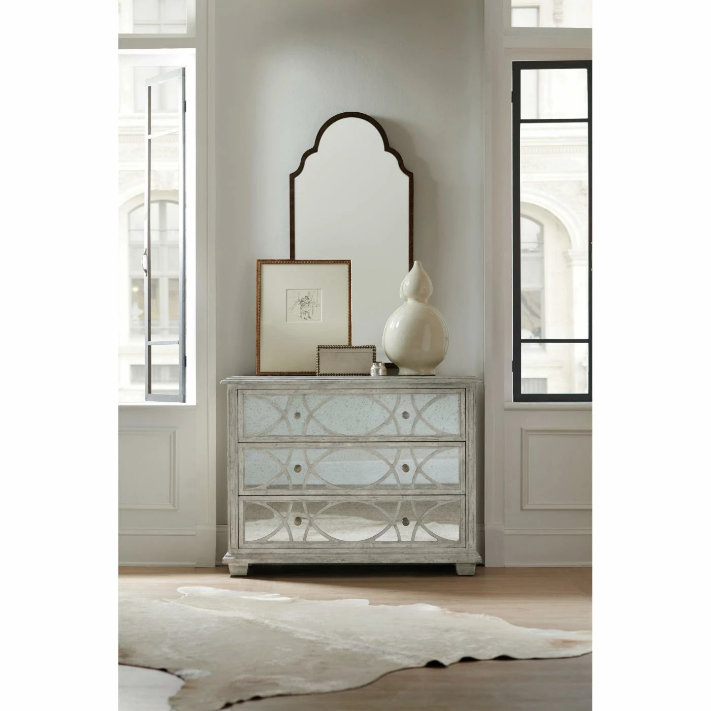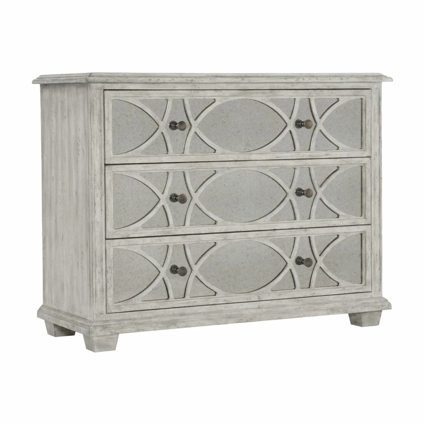 Offering bountiful storage in a gorgeous shabby-chic package, the Hooker Furniture Boheme Duvel Accent Chest is a wonderful addition to your new living room. Three drawers are built into its face, each featuring antique mirrored inset panels and an overlapping circle overlay design. Solid poplar hardwood constructs the frame, topped by poplar and cedar veneers with an extremely distressed antique gray finish. The top drawer is felt-lined while the bottom drawer is dust-proofed with cedar. A built-in USB port and three AC outlets keep all your electronics at full power.
