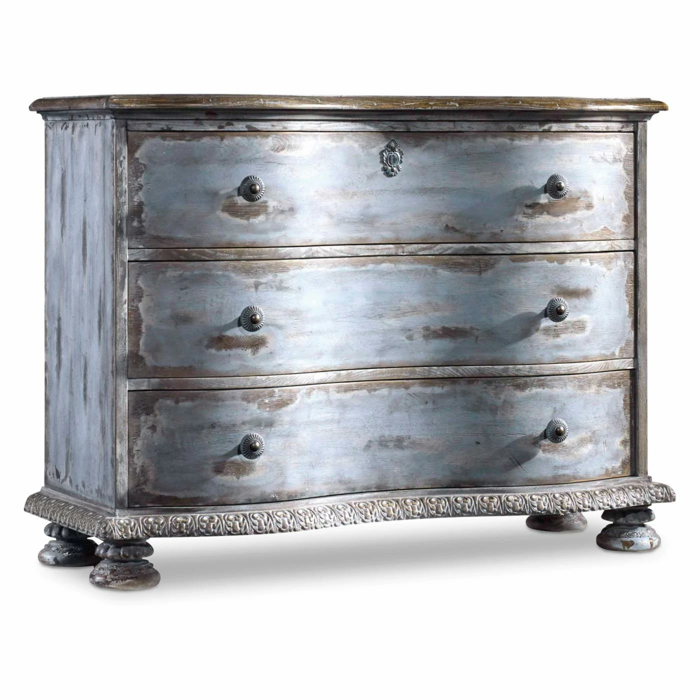 Rustic Southwestern charm radiates from this Hooker Furniture Chatelet 3 Drawer Chest. A fitting addition to any bedroom, living space, or hall, this chest is made of hardwood solids, poplar solids, pecan veneer, and resin. A distressed blue finish and faux lock on the top drawer give antique charm. This chest is also equipped with three shelves for storage space.