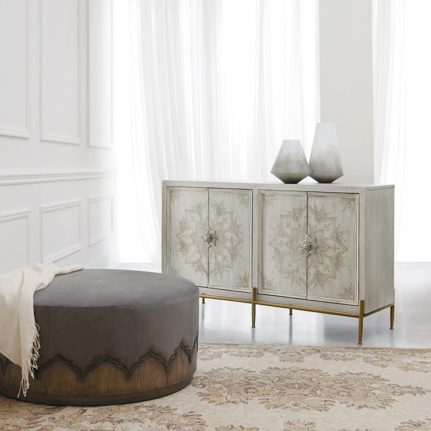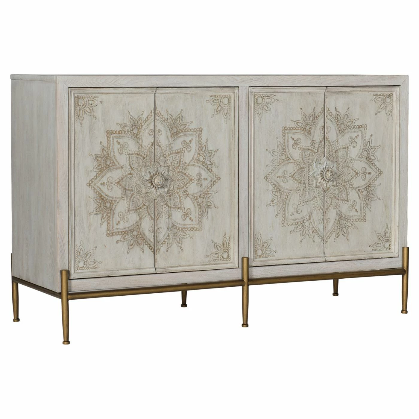 The Hooker Furniture Melange Delilah 4 Door Accent Chest is a faux-vintage find that’ll make envious guests wonder which relative you inherited it from. This accent chest is made from poplar and hardwood solids with oak veneers in a weathered white finish. A hand-painted floral pattern shines against the doors’ wood grain; like the rest of the piece, the florals are slightly faded to match the aged aesthetic. Gleaming gold legs and oversized decorative floral pulls further elevate the piece. Each pair of doors (which hang on soft-close hinges) opens to reveal one adjustable shelf.
