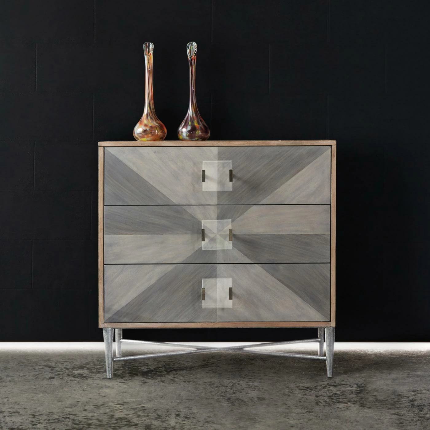 Striking modern lines and a play color scheme make the Hooker Furniture Melange Zulu 3 Drawer Accent Chest a sensible complement to your cutting-edge living room. Its frame is rendered from solid poplar with a light brown tone and pewter-finished metal legs. Three drawers are built into the face, outfitted with clear acrylic square handles and ball-bearing glides. The drawer faces are hoe to a radiant veneer pattern comprised of black walnut and elm veneers.
